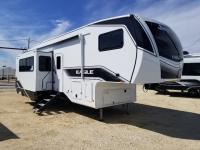 With any Eagle fifth wheel by Jayco you will appreciate durable construction materials, like the Magnum Truss Roof and the Stronghold VBL laminated walls. The JAYCOMMAND Smart RV system puts you in control of your RV's functions, and the 4 Star Handling Package will provide smooth towing from home to camp. Each model features Climate Shield zero-degree tested weather protection and the industry-exclusive HELIX cooling system that features two 15,000 BTU Whisper Quiet A/C's to keep you comfortable during those colder months. Some of the exterior conveniences you are sure to love are the pass-through storage with Slam-Latch baggage doors and an automotive style front cap with max turn radius. The Eagle fifth wheels are designed to make you feel at home with solid surface countertops, residential vinyl flooring throughout, 100% no floor vents, and blackout roller shades with reflective side throughout for added privacy and insulation.