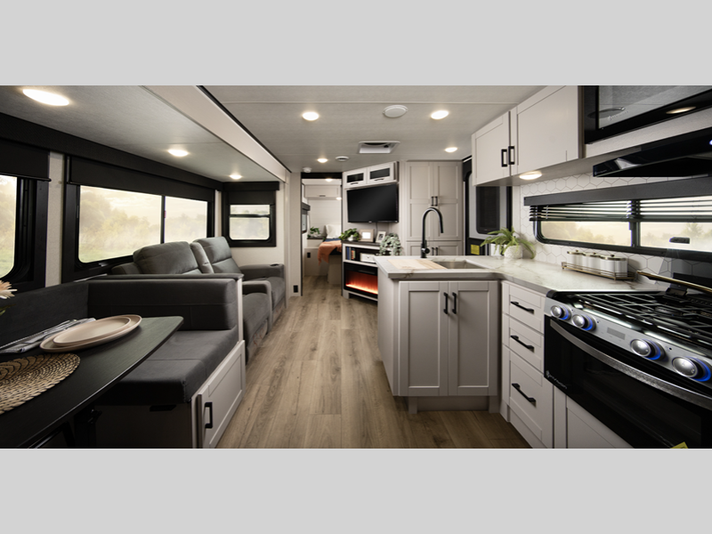 Sleeps 5 Slides 2 Length 35 ft 10 in Ext Width 8 ft Ext Height 10 ft 10 in Int Height 6 ft 6 in Interior Color Dune Gray Hitch Weight 985 lbs GVWR 8995 lbs Dry Weight 7265 lbs Cargo Capacity 1730 lbs Fresh Water Capacity 55 gals Grey Water Capacity 61 gals Black Water Capacity 30.5 gals Tire Size ST225/75R15E Furnace BTU 35000 btu Available Beds Queen Refrigerator Type 12V Refrigerator Size 11 cu ft Cooktop Burners 3 Number of Awnings 1 LP Tank Capacity 20 lbs. Water Heater Type On demand Tankless AC BTU 13500 btu TV Info LED Smart TV Awning Info 20' Max-Length Power w/LED Light Axle Count 2 Number of LP Tanks 2 Shower Type Standard Electrical Service 50 amp Solar Wattage 200 watts Similar Floorplans
