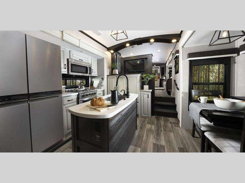 Sleeps 4 Slides 3 Length 42 ft 11 in Ext Width 8 ft 6 in Ext Height 13 ft 3 in Int Height 6 ft 7 in Interior Color Modern Farmhouse Exterior Color Mineral, Pearl, Smoke Hitch Weight 2775 lbs GVWR 17650 lbs Dry Weight 14670 lbs Cargo Capacity 2980 lbs Fresh Water Capacity 75 gals Grey Water Capacity 87 gals Black Water Capacity 87 gals Tire Size 215/75R17.5H Furnace BTU 40000 btu Available Beds King Refrigerator Type GE Residential Refrigerator Size 21 cu ft Cooktop Burners 4 Number of Awnings 2 LP Tank Capacity 40 lbs. Water Heater Capacity 16 gal Water Heater Type Gas/Electric DSI AC BTU 30000 btu TV Info LR 50" 4K Smart LED HDTV, BR 32" 4K Smart TV Awning Info 11' & 21' Electric w/Integrated LED Lighting Axle Count 2 Washer/Dryer Available Yes Number of LP Tanks 3 Shower Type Walk-In Shower Similar Floorplans