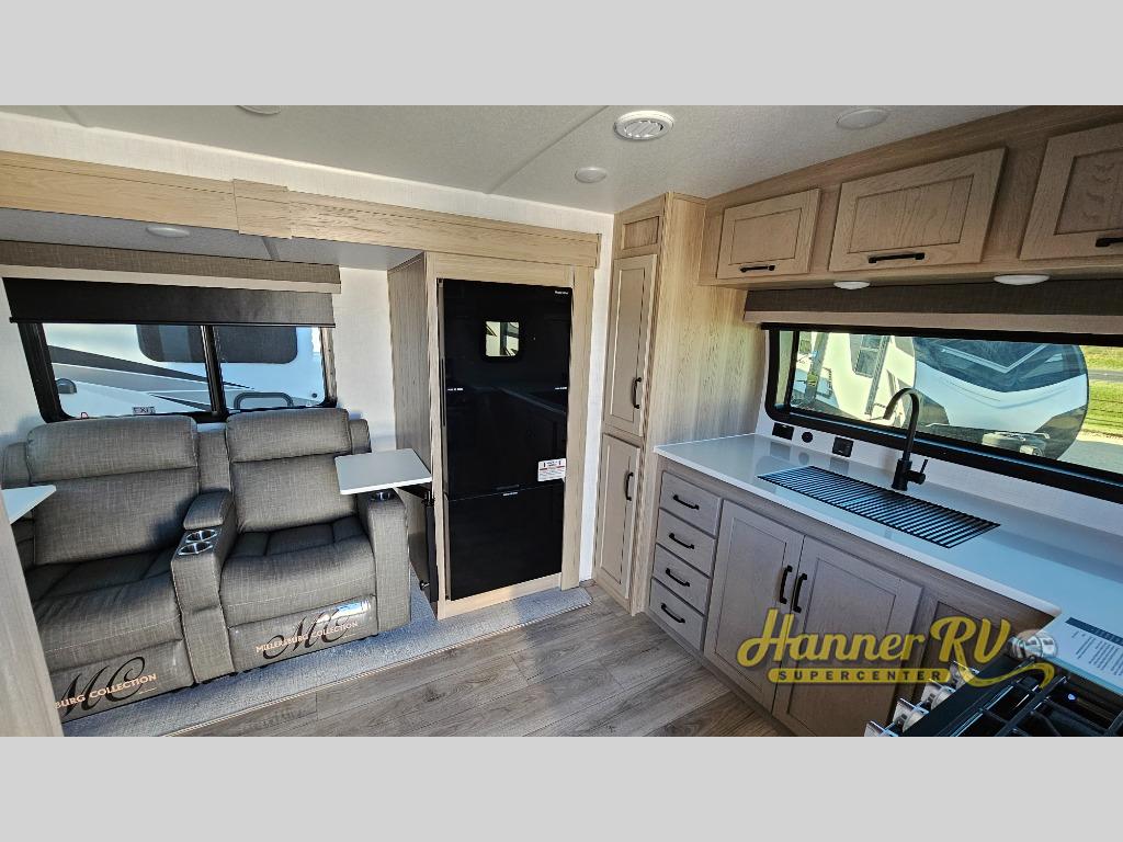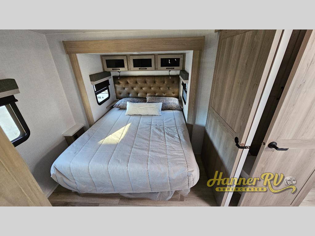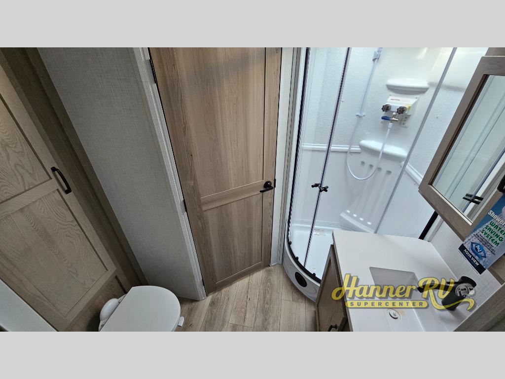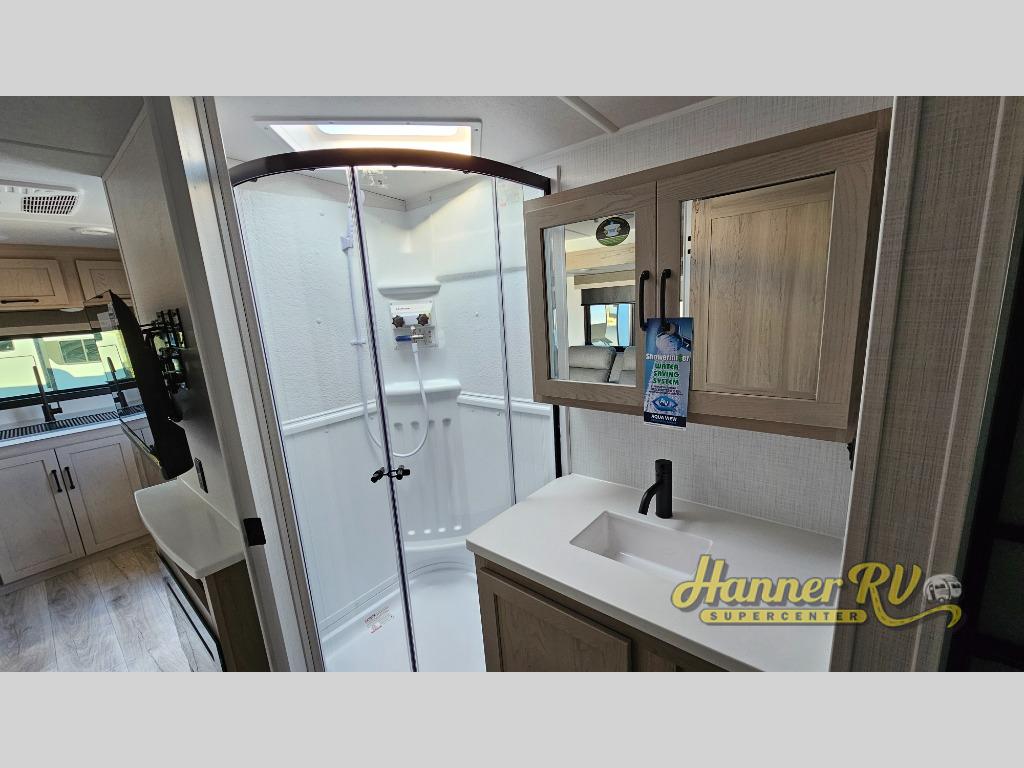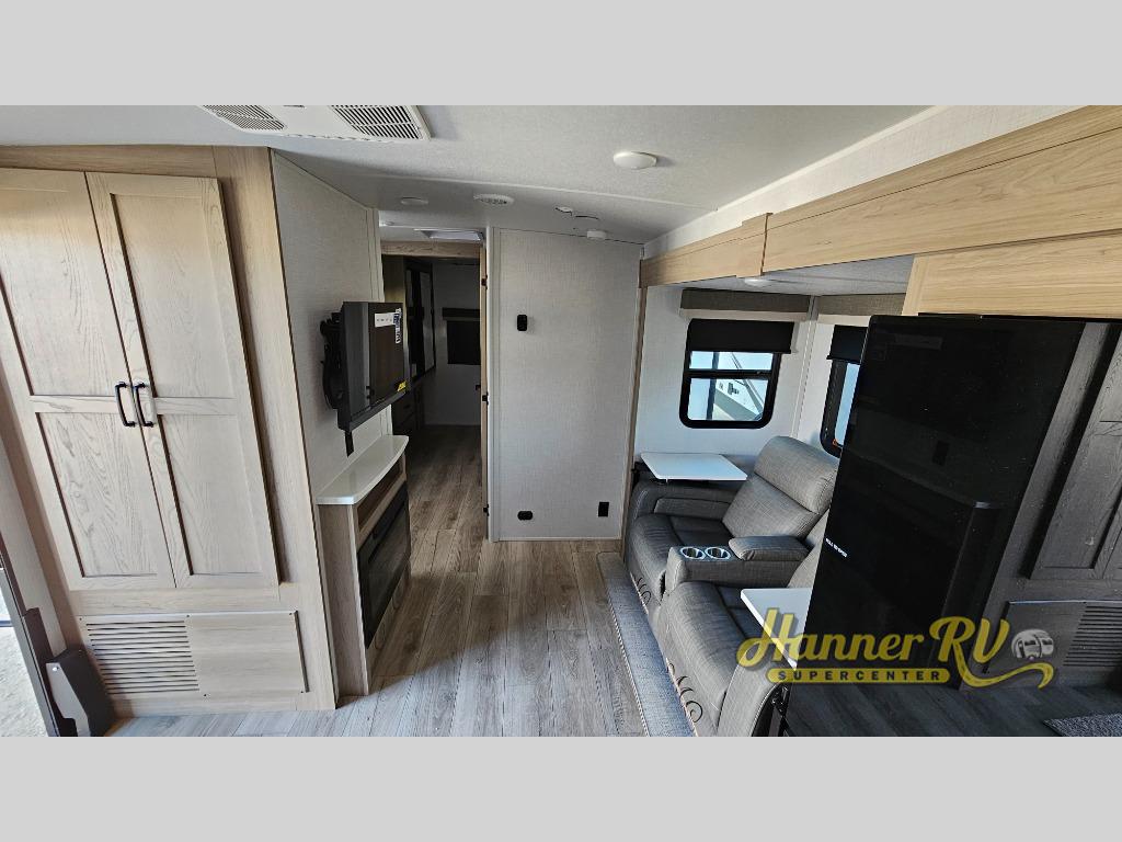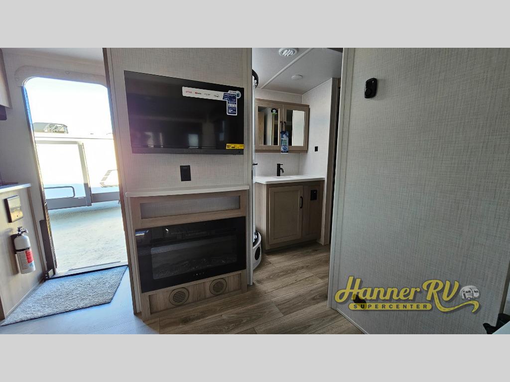 Escape the city life for weekend trips in this cozy couple's trailer. The dual entry doors will allow you to enter in through the rear private bedroom, or the front kitchen/main living area for convenience. You will enjoy relaxing on the theater seating across from the 32" TV and fireplace in the evenings, or you can visit outdoors under the 19' power awning. You'll also find an exterior griddle here for quick meals and exterior storage for the fishing poles or hiking gear. This model also includes a walk-through bath with a shower skylight, a linen closet, plus a Showermiser Water Saving System. And don't worry about storage space inside since this model includes an entryway pantry/closet, a second pantry in the front kitchen, plus a large bedroom wardrobe to keep your clothes wrinkle-free!