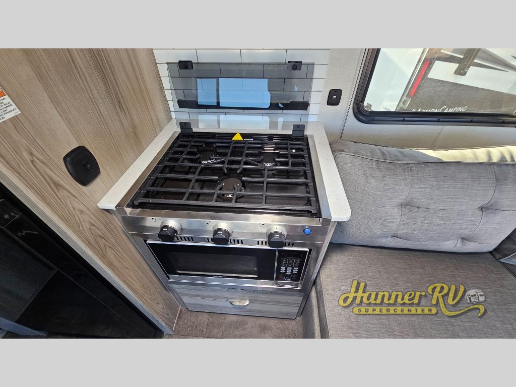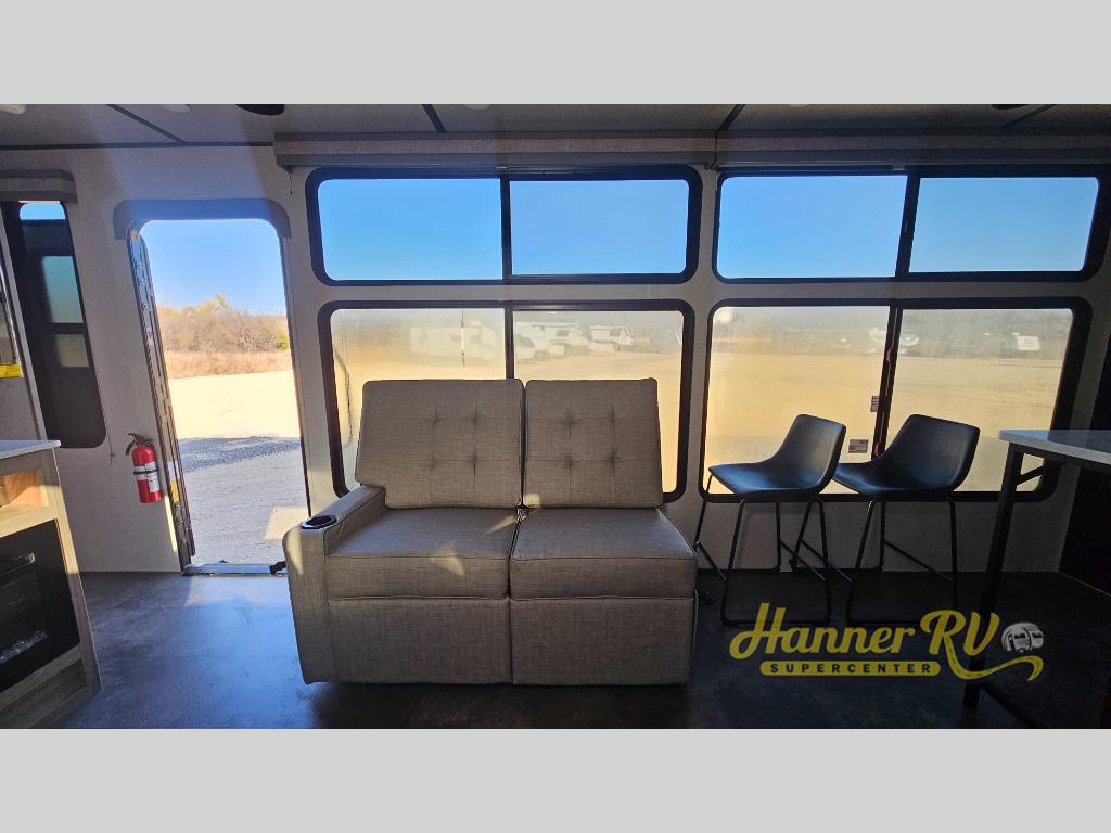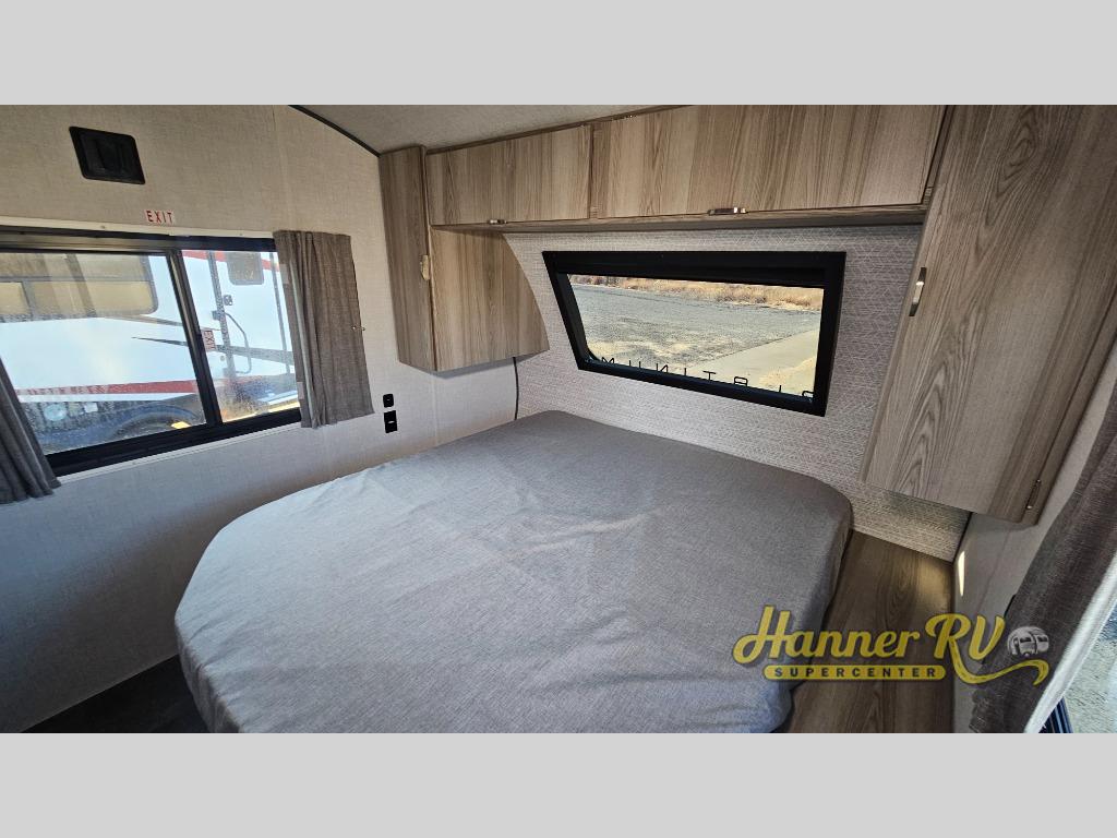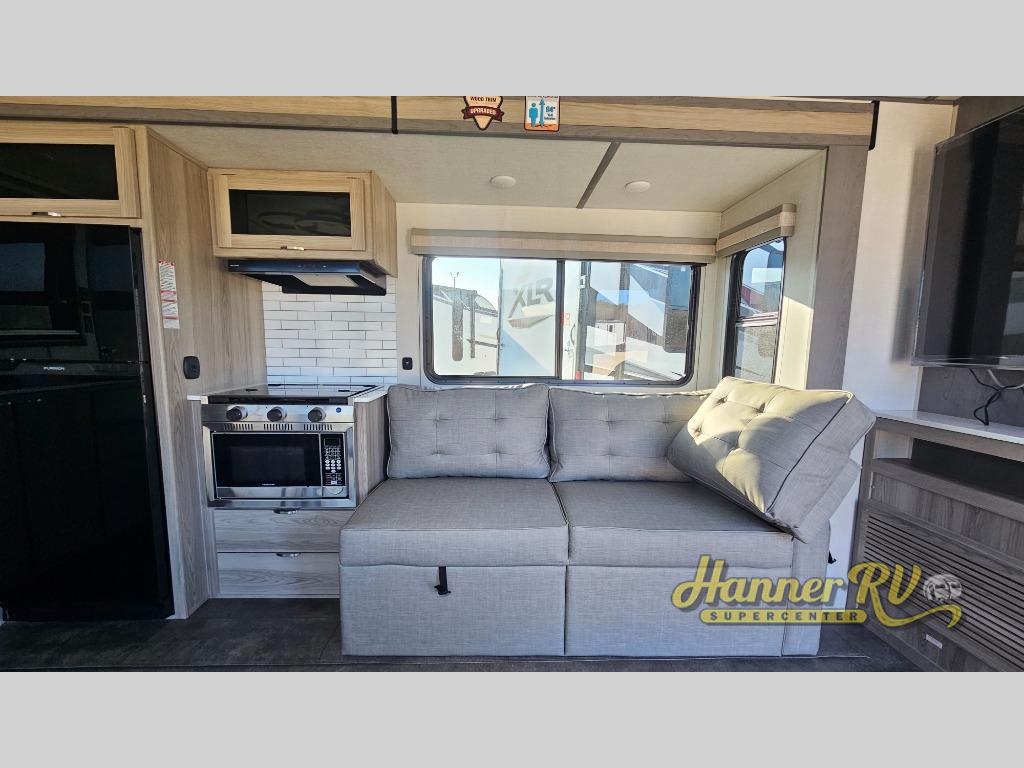 You'll love camping in this spacious trailer for three to four! There is a rear ramp door/patio so you can sit outdoors in your camp chairs, or you can sit under the side patio awning. The full kitchen includes a bar top with stools, a large sink, and a standard refrigerator to store perishables. A super lounge in the main living area will let you relax after a day of outdoor play, and the full bath will let you freshen up before bed. Speaking of bed, you'll be met with a king bed in the front bedroom for added comfort!