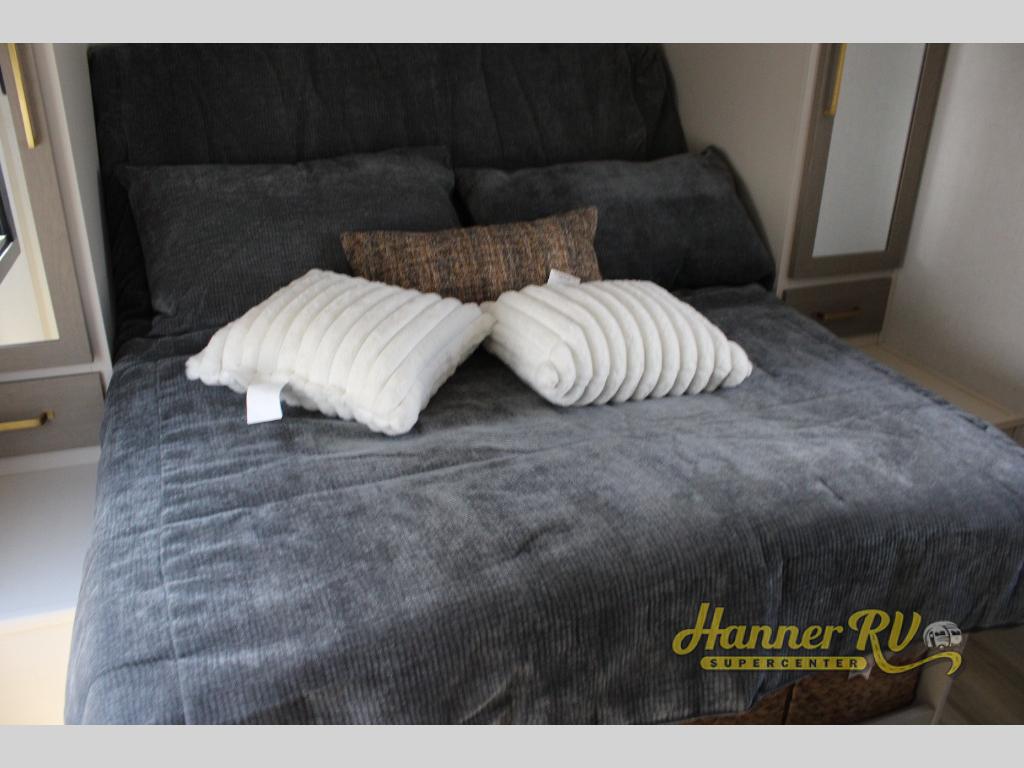 If you like to be different, this couples trailer offers theater seating and a removable table that you can relax on and dine at. There is also a swing-open entertainment center and a fireplace right across from the seats for perfect viewing. The kitchen has full amenities including a 12V black refrigerator and hidden storage behind the TV. The rear bath offers a walk-in shower with a skylight for more natural lighting, a large linen cabinet for all your essentials, a wardrobe and everything else you need to stay refreshed and clean without having to use the public facilities. The front bedroom offers a space savings door, a queen bed with Versa Tilt and dual wardrobes. You will also find a Texas-sized pass-through compartment outside for the outdoor gear such as camping chairs, charcoal, and such.