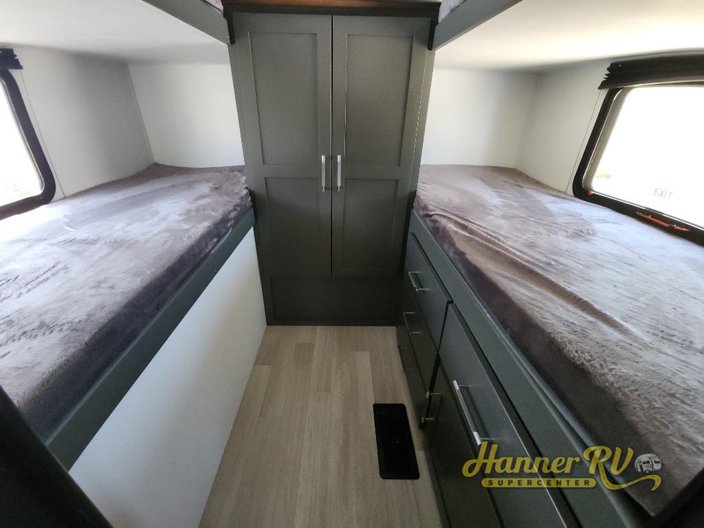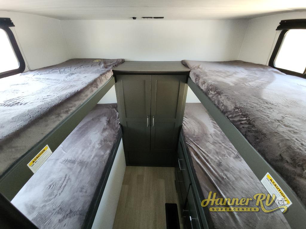 You're going to love this travel trailer with a front private bedroom for you and a rear private bunkhouse for your guests. There are four bunk beds, plus a wardrobe and additional storage to keep this space tidy. And the front bedroom includes a queen bed, dual wardrobes and dual nightstands to keep your phone and books on. Everyone can meet in the main living area that is made spacious by the large slide out. When your crew has worked up an appetite, you can make lunch on the two burner range or use the microwave oven. There is also a large 12V refrigerator to keep cold drinks stocked. Outside, you'll appreciate multiple pass-through storage compartments and a power awning to provide shade!