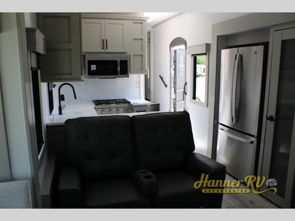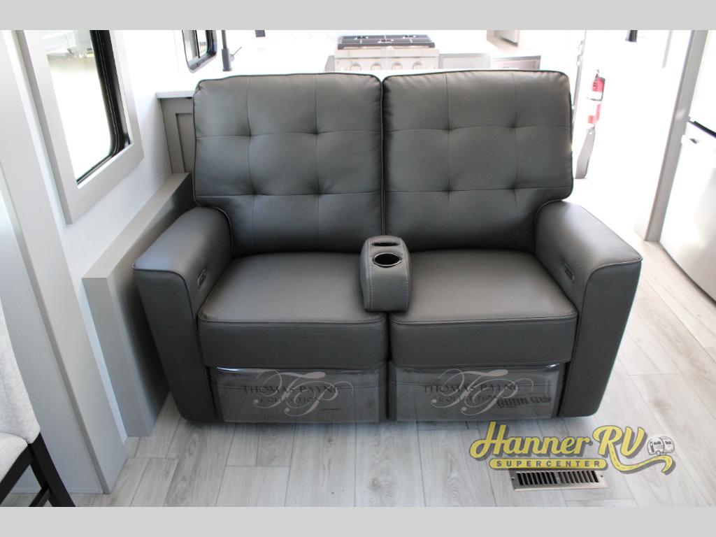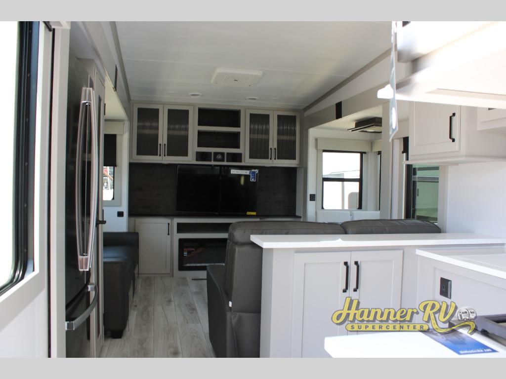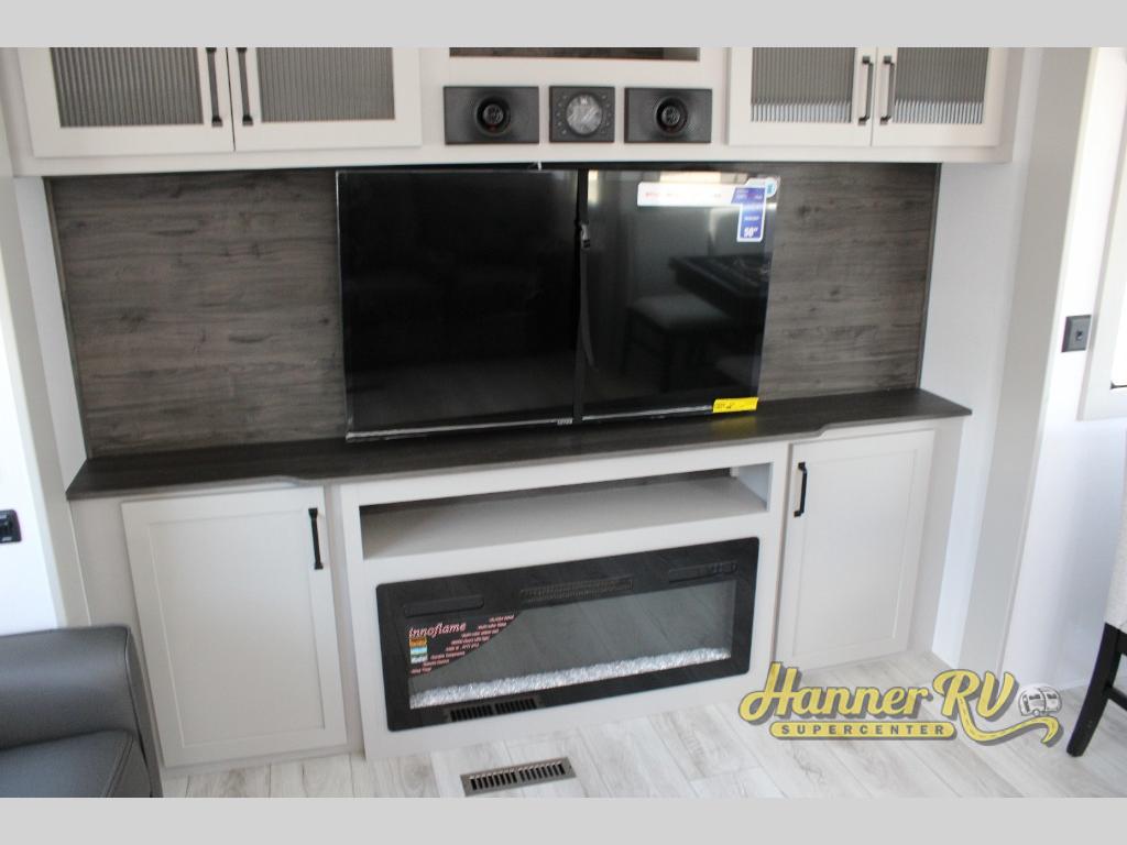 This couples coach will have you excited about traveling to all of your favorite places, and new locations too! The triple slide unit features an open concept living/dining area with dual opposing slides at the very back featuring a hide-a-bed sofa along the curbside, and a dining space opposite with a booth dinette or choose the optional table and four chairs. Power theater seats will be a comfortable place to kick back for a movie, and you will love the all-new entertainment center design featuring a fireplace, Smart TV, and overhead cabinets. In the evening, head up to your private retreat with a spacious bath including dual entry doors from the hall at the top of the stairs or from within the private bedroom. Get cleaned up in the large radius shower with seat and snuggle up in a king bed slide. The bedroom slide also features a large wardrobe that has been prepped for a washer/dryer if you choose to add the convenience. You will find plenty more storage spaces for your clothing and belongings in the two dressers or dual wardrobes along the full front wall. Another bonus with this unit is the outdoor kitchen which gives you a choice to cook inside or out!