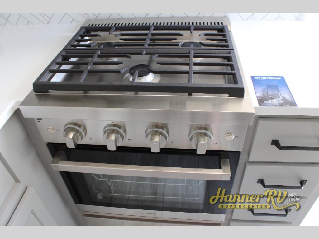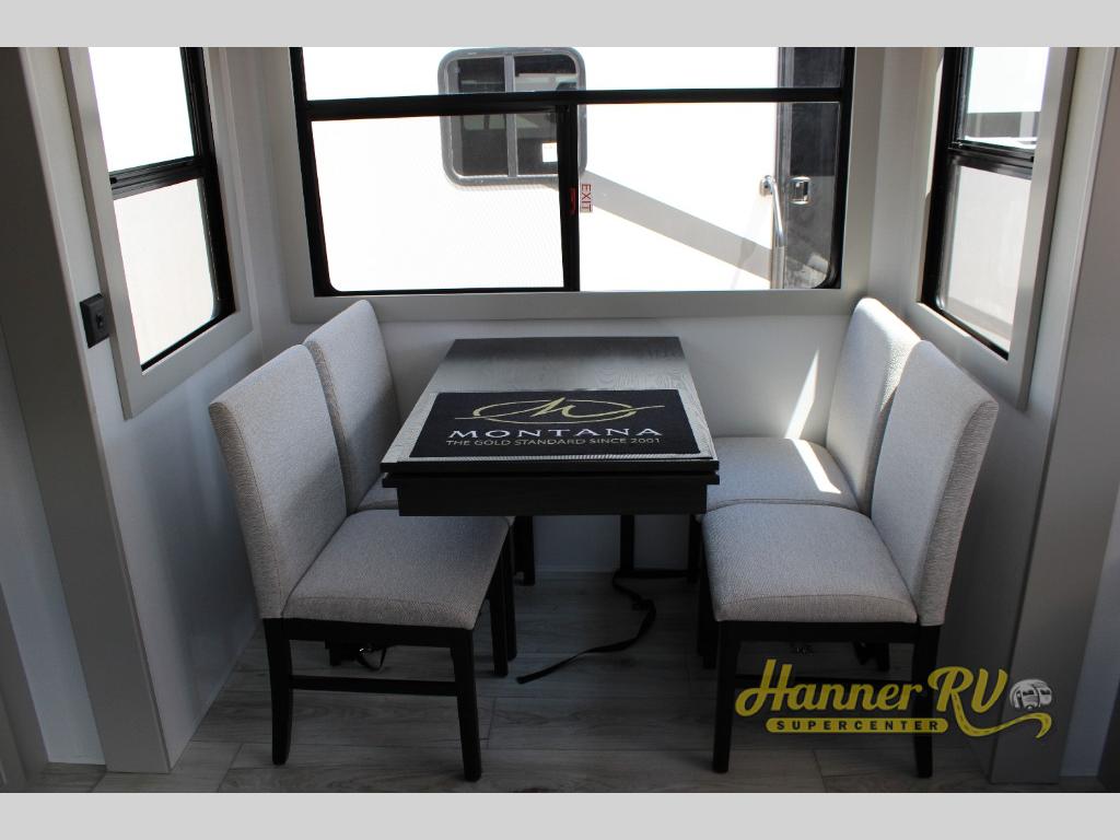 Live the high life with a Keystone Montana High Country fifth wheel! You'll have all the luxury you need with these units. They come with a Road Armor™ shock absorbing hitch pin, a MaxTurn™ front cap with KeyShield™ automotive-grade paint, a fully walkable roof with Alpha seamless TPO membrane system, and an insulated underbelly with forced hot air and electric tank heaters. The Road Armor™ suspension has 360° vibration control for a smooth ride, and the Ground Control® four-point electric auto-leveling with hitch memory will make set-up quite easy. The interior is elegantly appointed with the Thomas Payne Collection furniture, hardwood decorative slide-out fascia, Beauflor® vinyl throughout with Syntec® woven flooring in main slide outs, accent crown molding, and Sandstone Maple cabinetry.