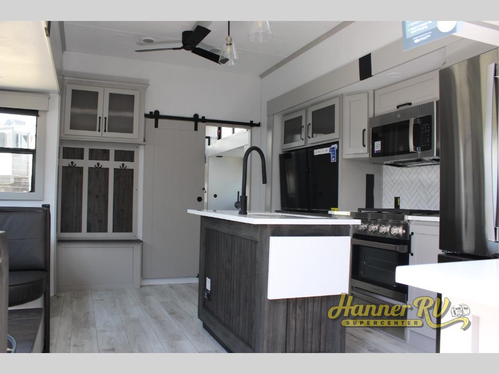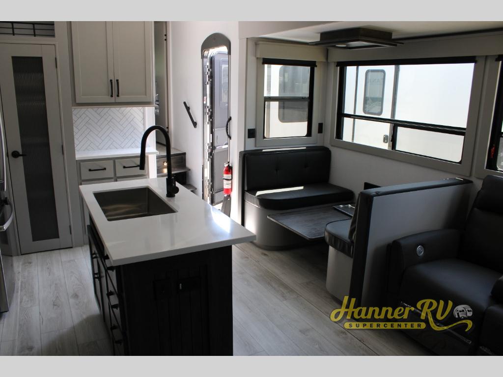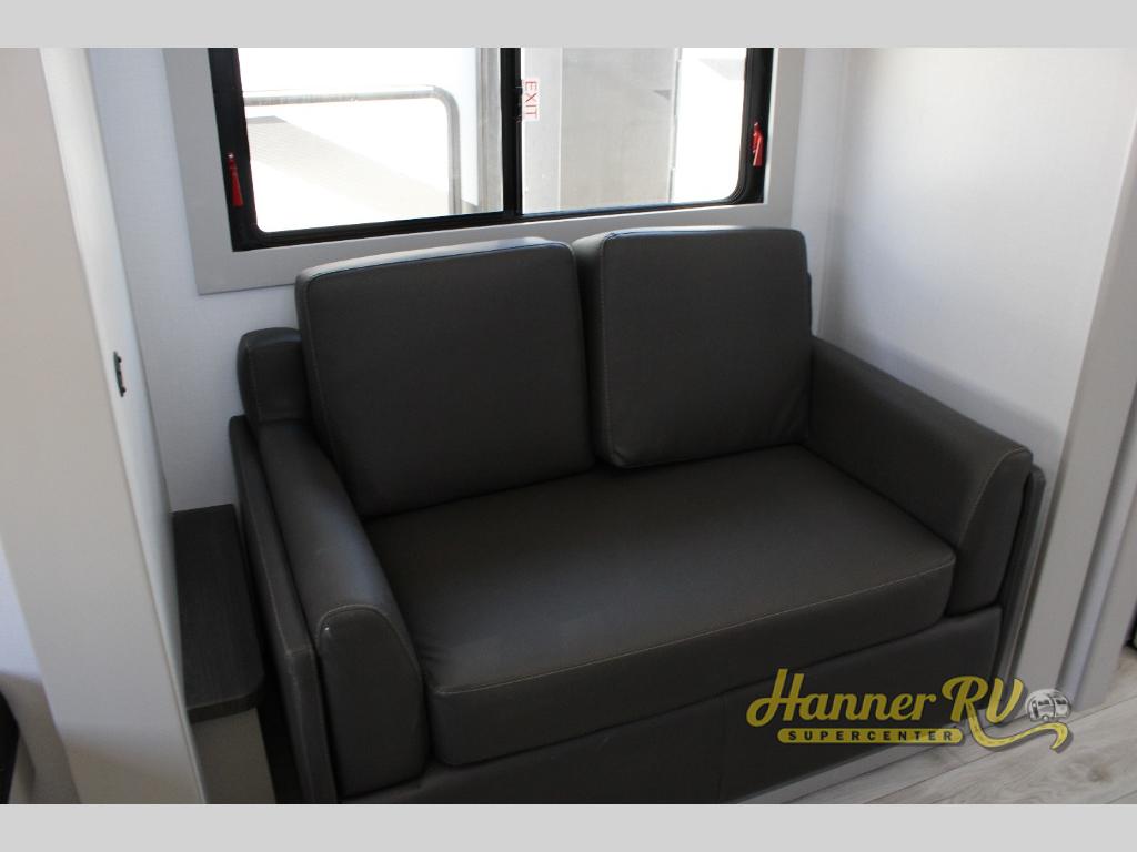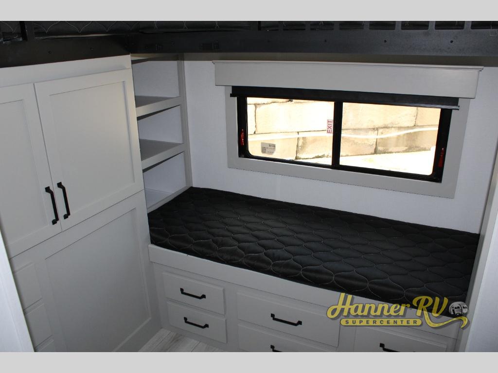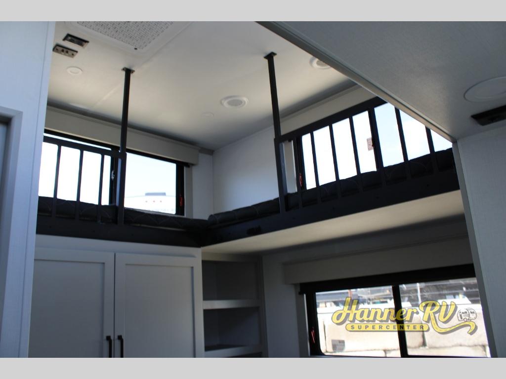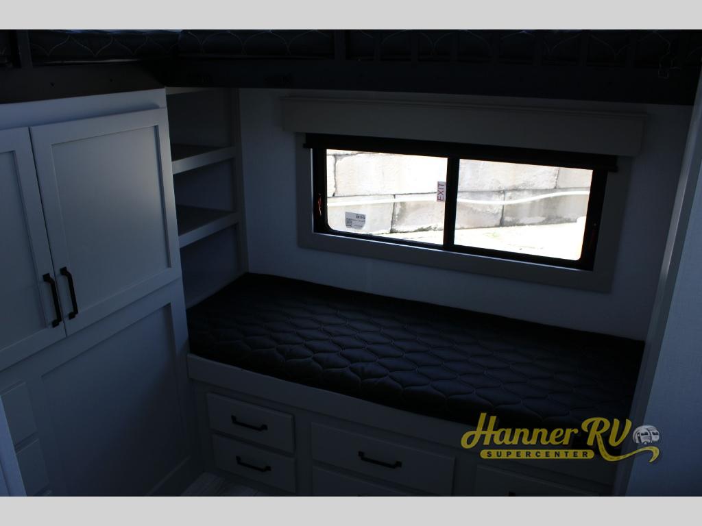 This fifth wheel is sure to check off all the boxes on your wish list for a new RV! There is a rear private bunkhouse suite with triple bunks and a hide-a-bed sofa, plus a half bath with its own exterior entry door! You'll have the front master bedroom all to yourselves with a king bed slide out, three wardrobes, two dressers, and even underbed storage! You could choose the optional queen bed in place of the king if you want more floor place, and there is washer/dryer prep if you want to add those appliances. The combined living area and kitchen is spacious with its dual opposing slides, and there is a kitchen island here for more counter space the chef if sure to love. Power theater seating is directly across from the Smart HDTV and fireplace, and the booth dinette provides a place to dine at. There is also a large residential refrigerator and a pantry for food storage, plus a coffee station where you can park your Keurig machine! Head outdoors to enjoy the two power awnings and outdoor kitchen!
