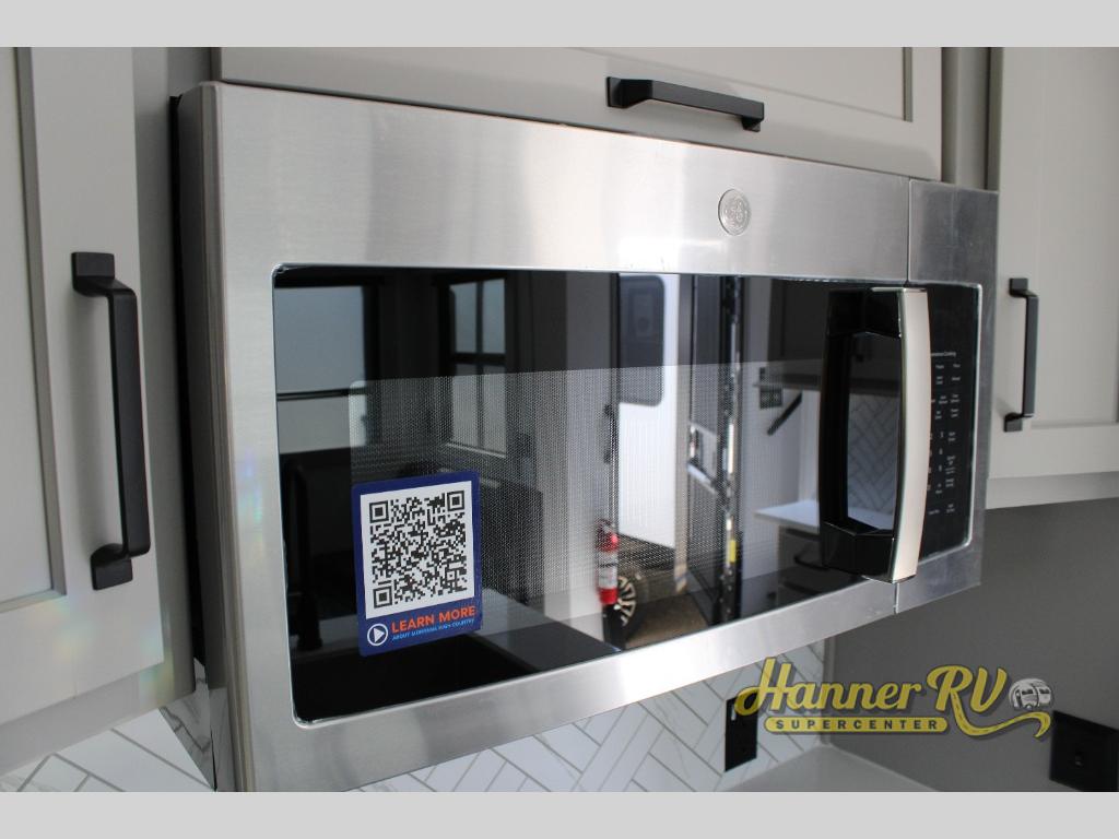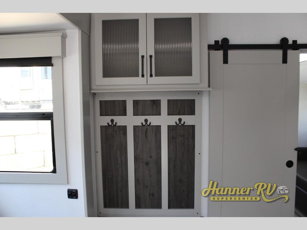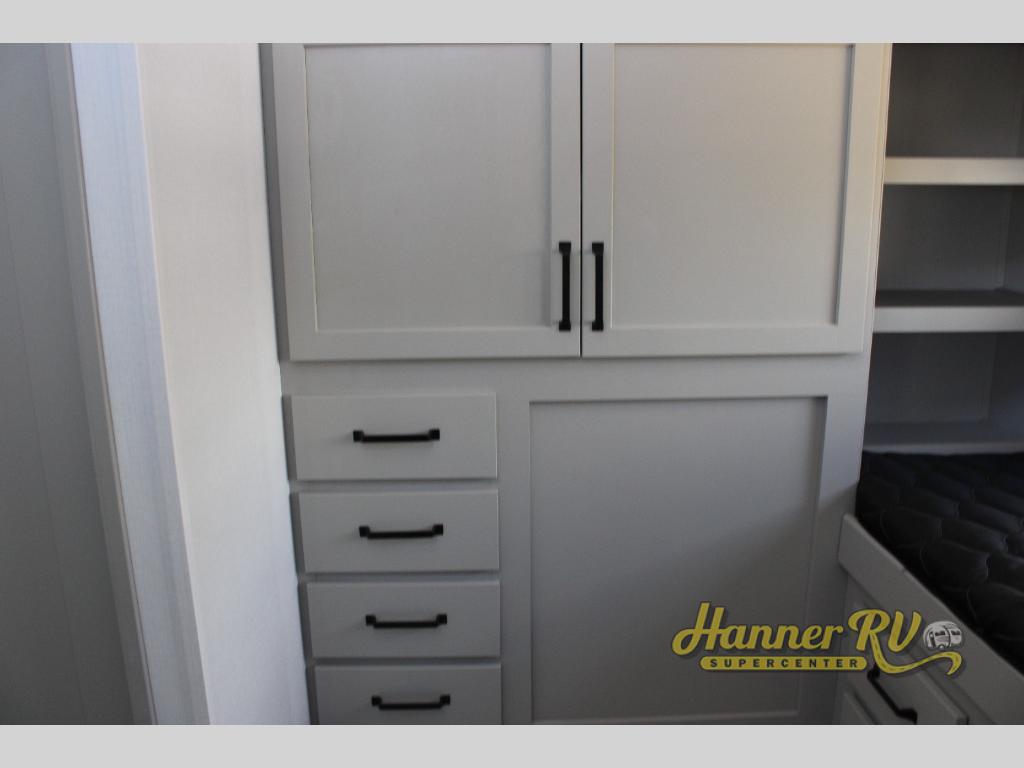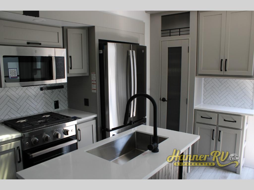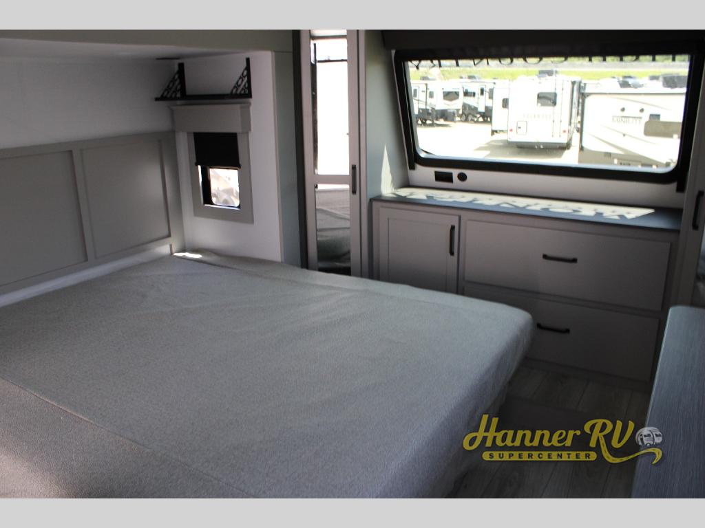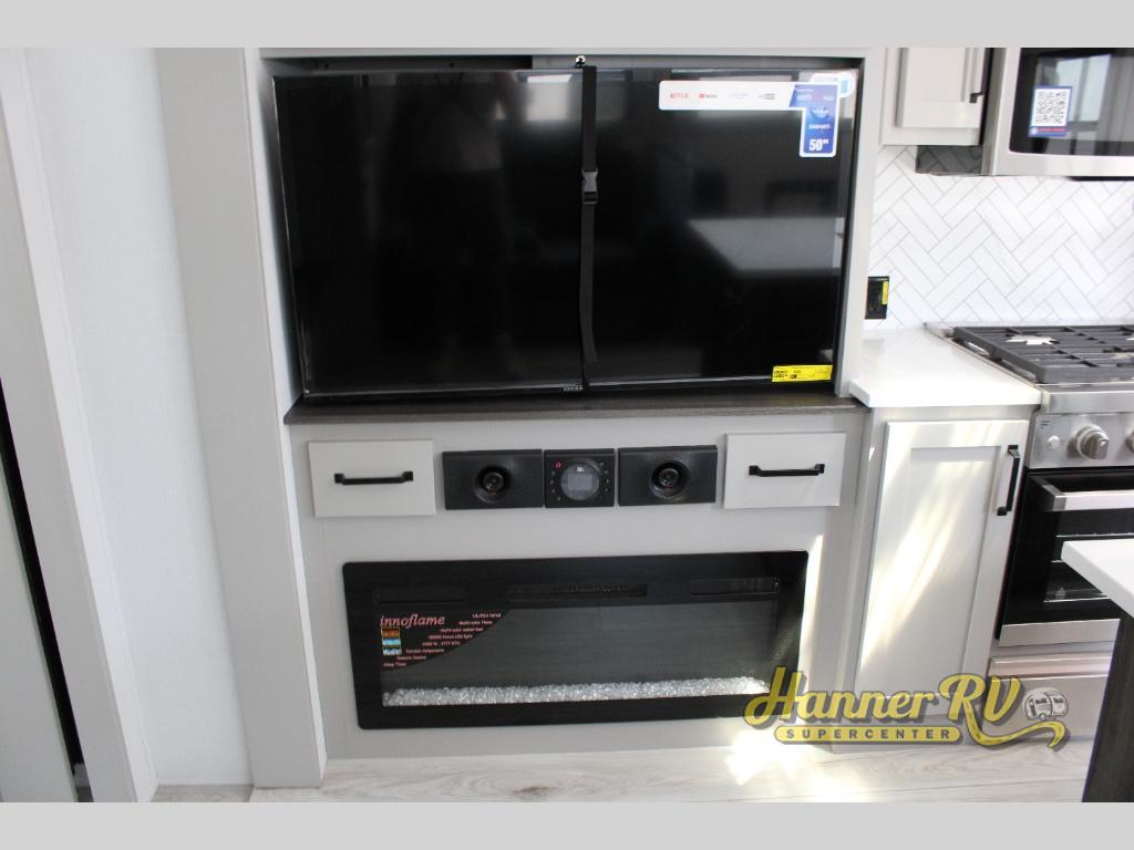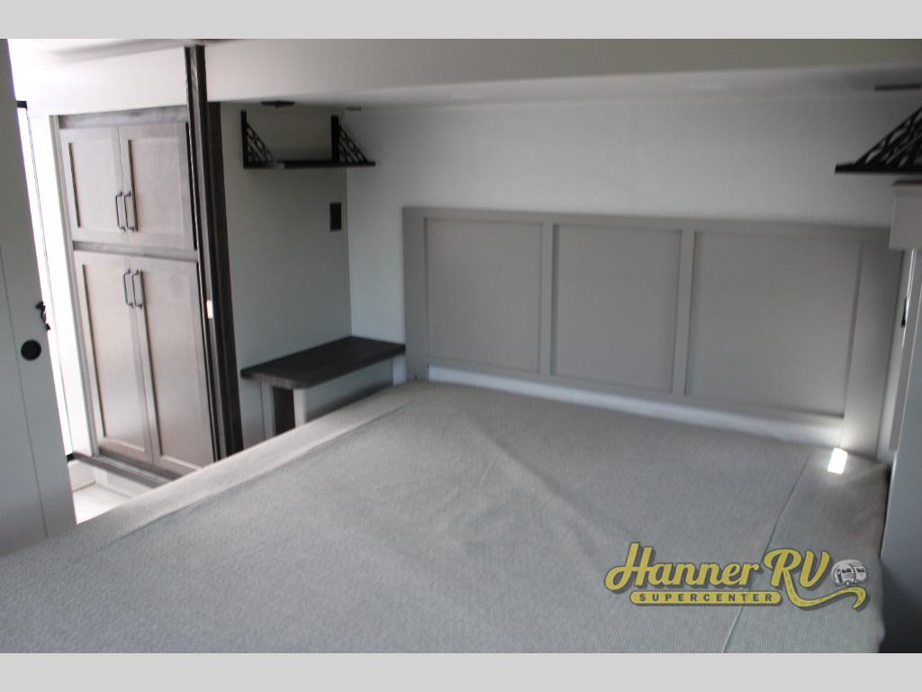 This fifth wheel is sure to check off all the boxes on your wish list for a new RV! There is a rear private bunkhouse suite with triple bunks and a hide-a-bed sofa, plus a half bath with its own exterior entry door! You'll have the front master bedroom all to yourselves with a king bed slide out, three wardrobes, two dressers, and even underbed storage! You could choose the optional queen bed in place of the king if you want more floor place, and there is washer/dryer prep if you want to add those appliances. The combined living area and kitchen is spacious with its dual opposing slides, and there is a kitchen island here for more counter space the chef if sure to love. Power theater seating is directly across from the Smart HDTV and fireplace, and the booth dinette provides a place to dine at. There is also a large residential refrigerator and a pantry for food storage, plus a coffee station where you can park your Keurig machine! Head outdoors to enjoy the two power awnings and outdoor kitchen!