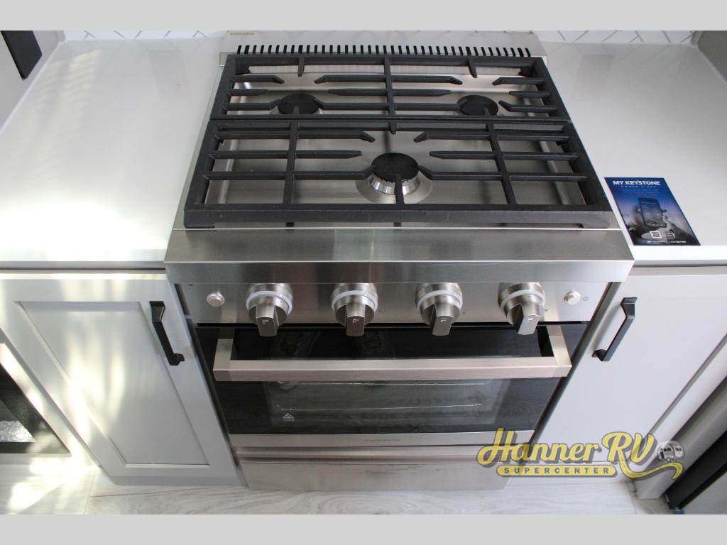 Live the high life with a Keystone Montana High Country fifth wheel! You'll have all the luxury you need with these units. They come with a Road Armor™ shock absorbing hitch pin, a MaxTurn™ front cap with KeyShield™ automotive-grade paint, a fully walkable roof with Alpha seamless TPO membrane system, and an insulated underbelly with forced hot air and electric tank heaters. The Road Armor™ suspension has 360° vibration control for a smooth ride, and the Ground Control® four-point electric auto-leveling with hitch memory will make set-up quite easy. The interior is elegantly appointed with the Thomas Payne Collection furniture, hardwood decorative slide-out fascia, Beauflor® vinyl throughout with Syntec® woven flooring in main slide outs, accent crown molding, and Sandstone Maple cabinetry.