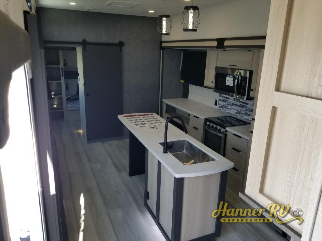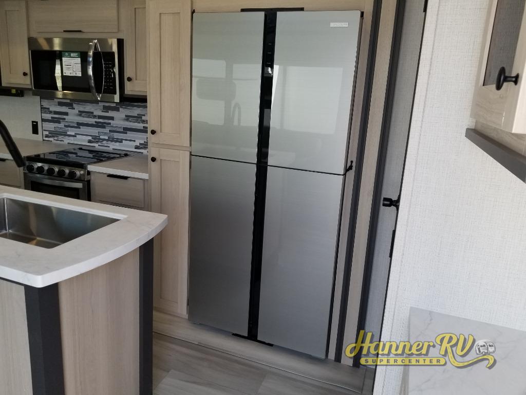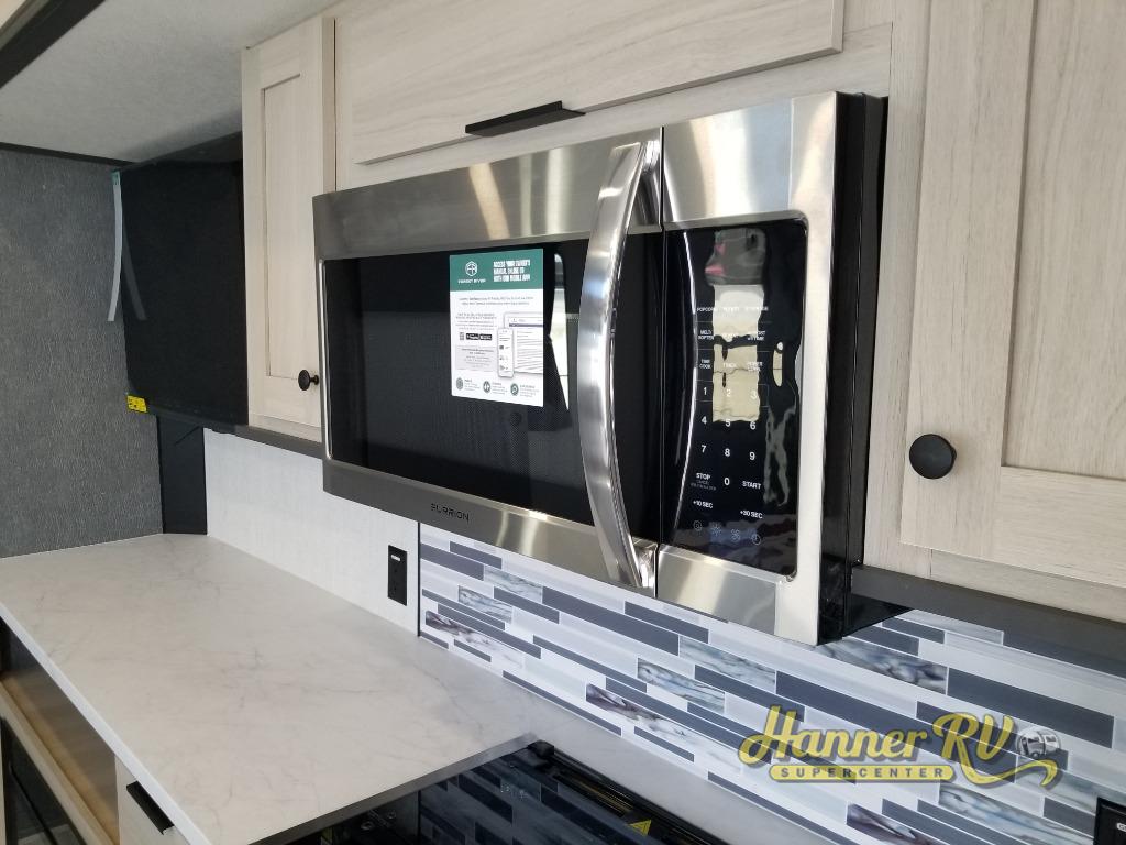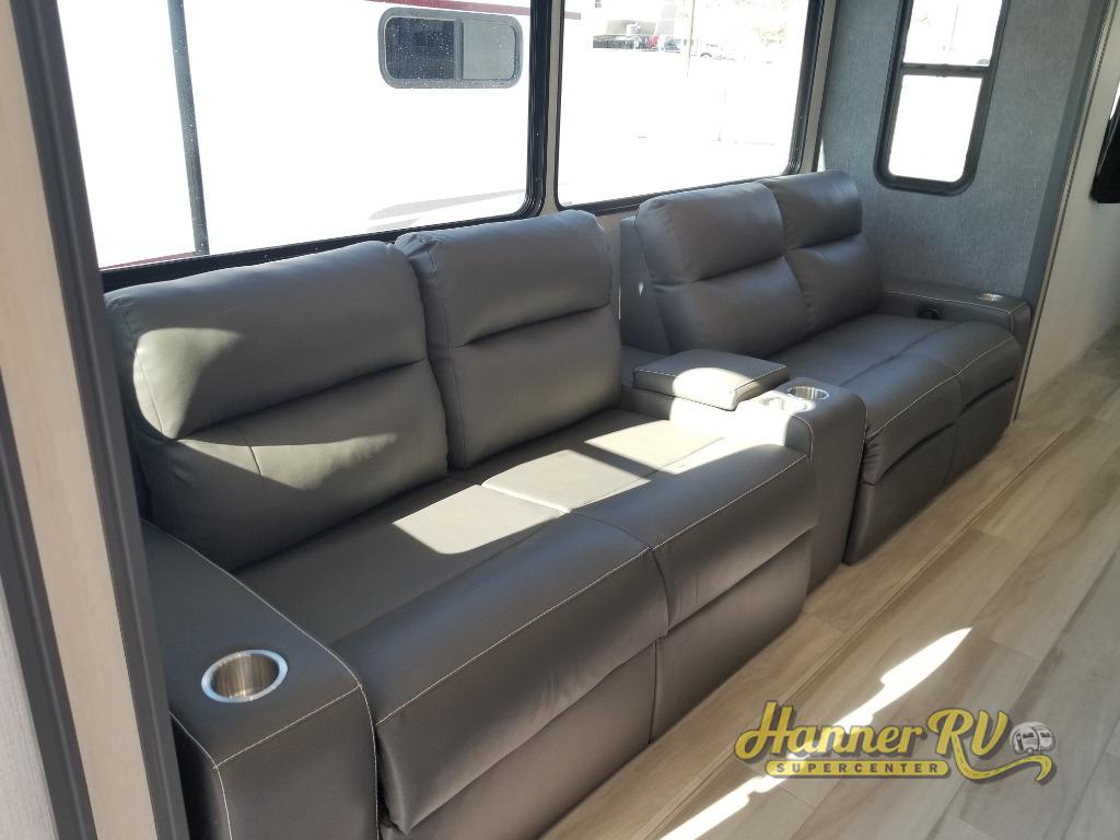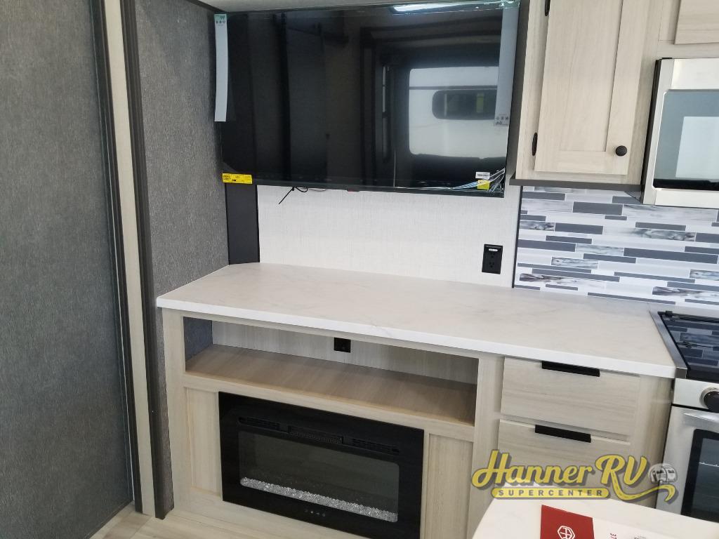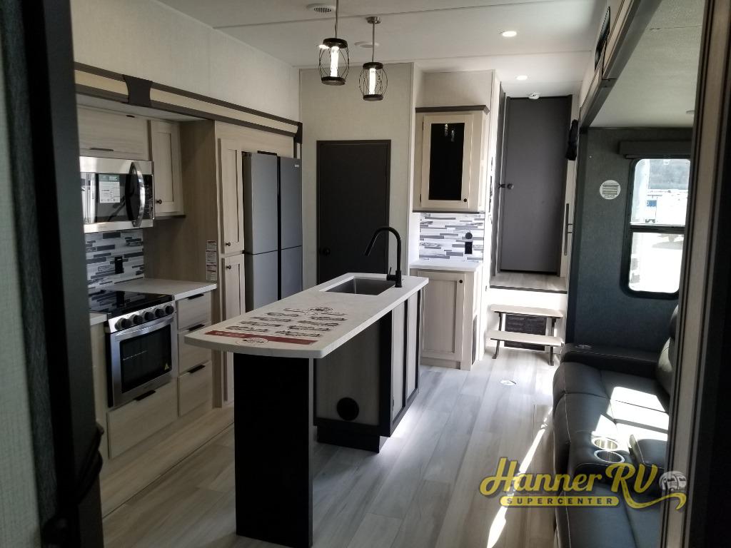 It will be so easy to enjoy extended stays in this spacious fifth wheel! Your guests are sure to love the rear private bunkhouse that includes a 54" x 74" bed below a bunk bed and a loft. This room even features its own full bath for added convenience. The second full bath is up front towards the private bedroom, which the owners can claim as their own. There is a queen bed slide out here, along with a walk-in closet with a wardrobe plus washer and dryer prep. Everyone can meet in the middle kitchen and living area as the chef of your group prepares breakfast on the 21" 2-in-1 oven range! There are also two pantries and a 16-cu. ft. 12V refrigerator to store food, plus a coffee bar where you can set up a drink station. After a day of exploring outdoors, you can relax on the super sofa, which is in direct view of the fireplace and entertainment center!