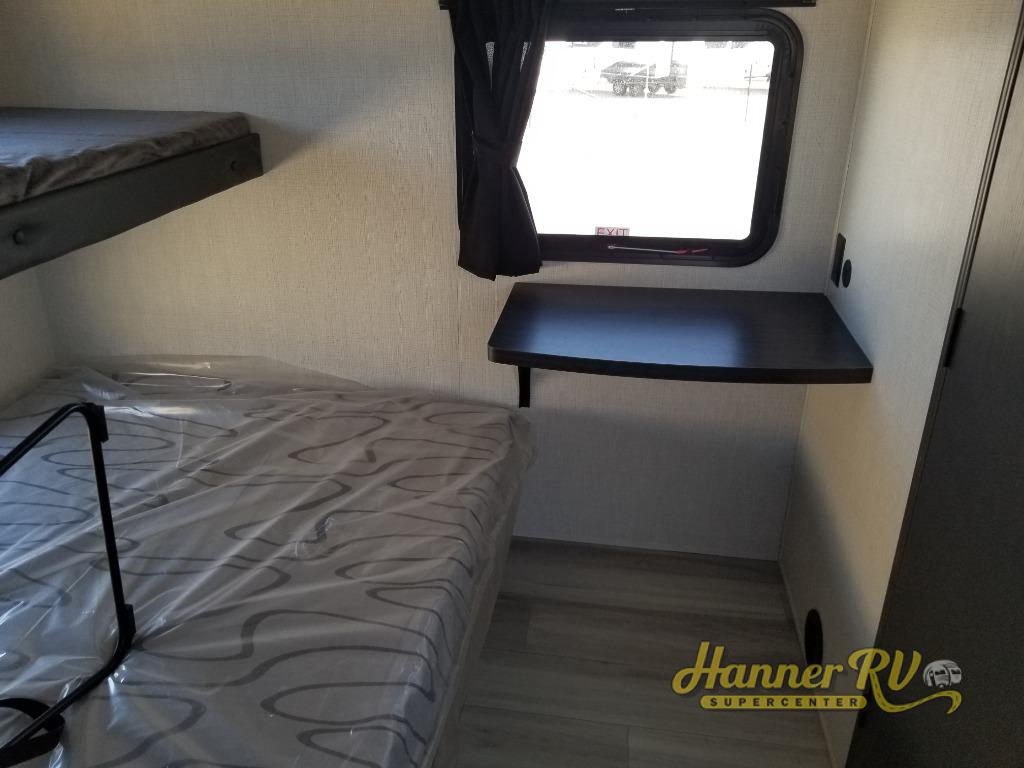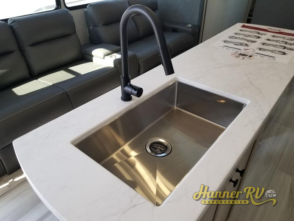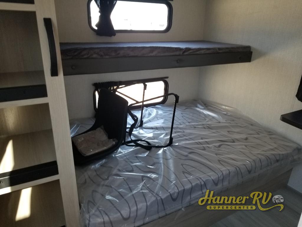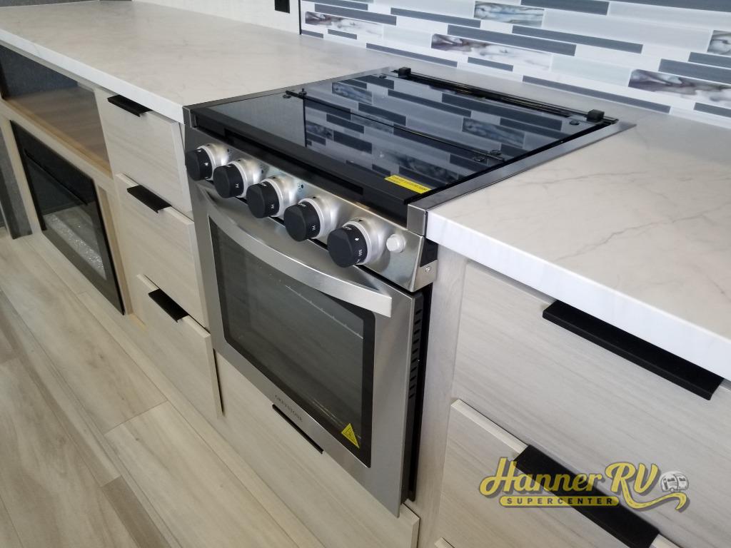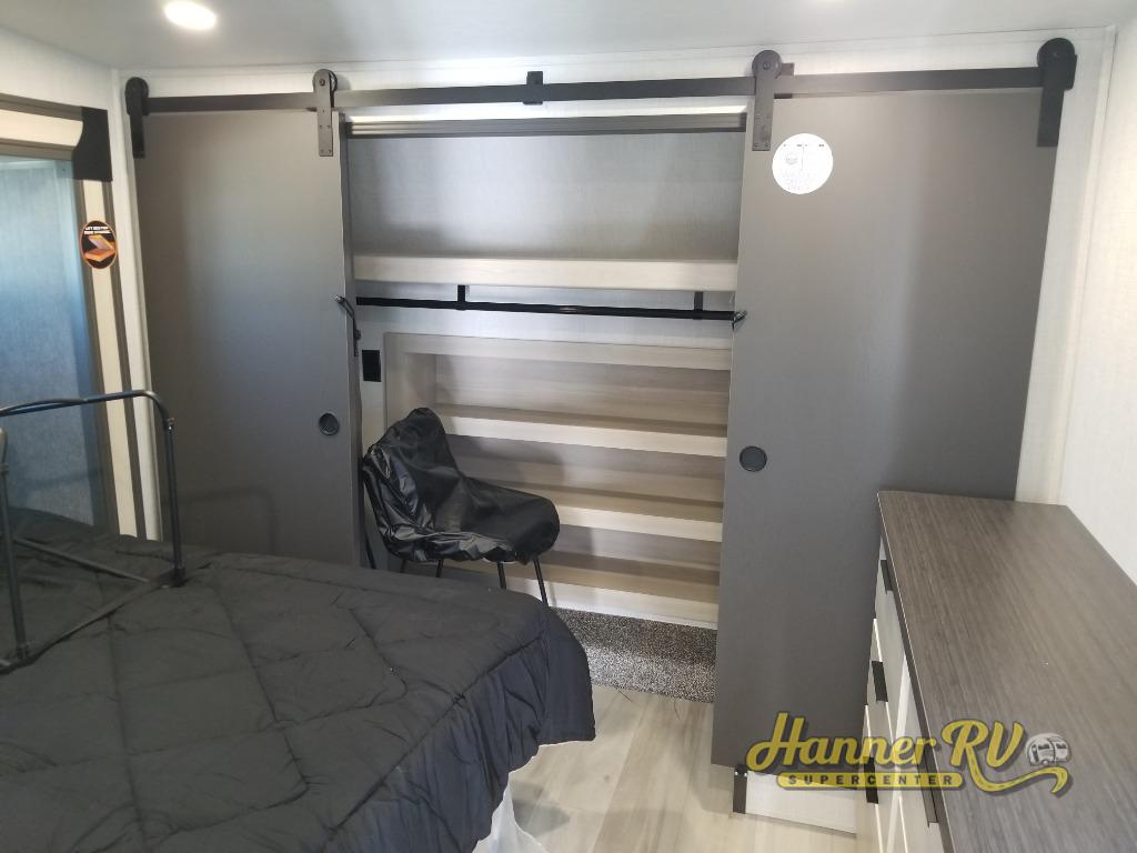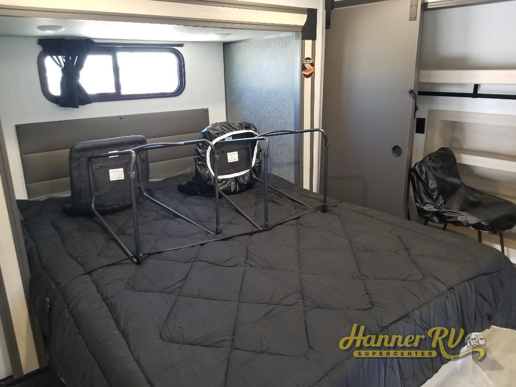It will be so easy to enjoy extended stays in this spacious fifth wheel! Your guests are sure to love the rear private bunkhouse that includes a 54" x 74" bed below a bunk bed and a loft. This room even features its own full bath for added convenience. The second full bath is up front towards the private bedroom, which the owners can claim as their own. There is a queen bed slide out here, along with a walk-in closet with a wardrobe plus washer and dryer prep. Everyone can meet in the middle kitchen and living area as the chef of your group prepares breakfast on the 21" 2-in-1 oven range! There are also two pantries and a 16-cu. ft. 12V refrigerator to store food, plus a coffee bar where you can set up a drink station. After a day of exploring outdoors, you can relax on the super sofa, which is in direct view of the fireplace and entertainment center!