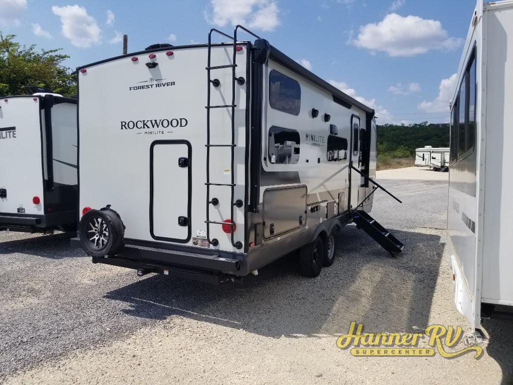 Each Rockwood Mini Lite travel trailer by Forest River is constructed with a fully laminated one-piece walkable roof, sleek frameless windows, and a six-sided full aluminum frame for strength and durability. The 12V thermostatically controlled heated tanks, plus radiant foil in the underbelly will allow you to camp well into the colder months, and the 200W roof solar panel will be perfect for a little off-gridding. Each model includes solid surface kitchen countertops, hidden hinge cabinet doors, roller shades, plus many more interior features. Having an AIR 360+ omnidirectional antenna with WiFi prep on board gives you the option to get some work done if it's needed, and the power tongue jack provides hassle-free set up, so you can enjoy more time relaxing!
