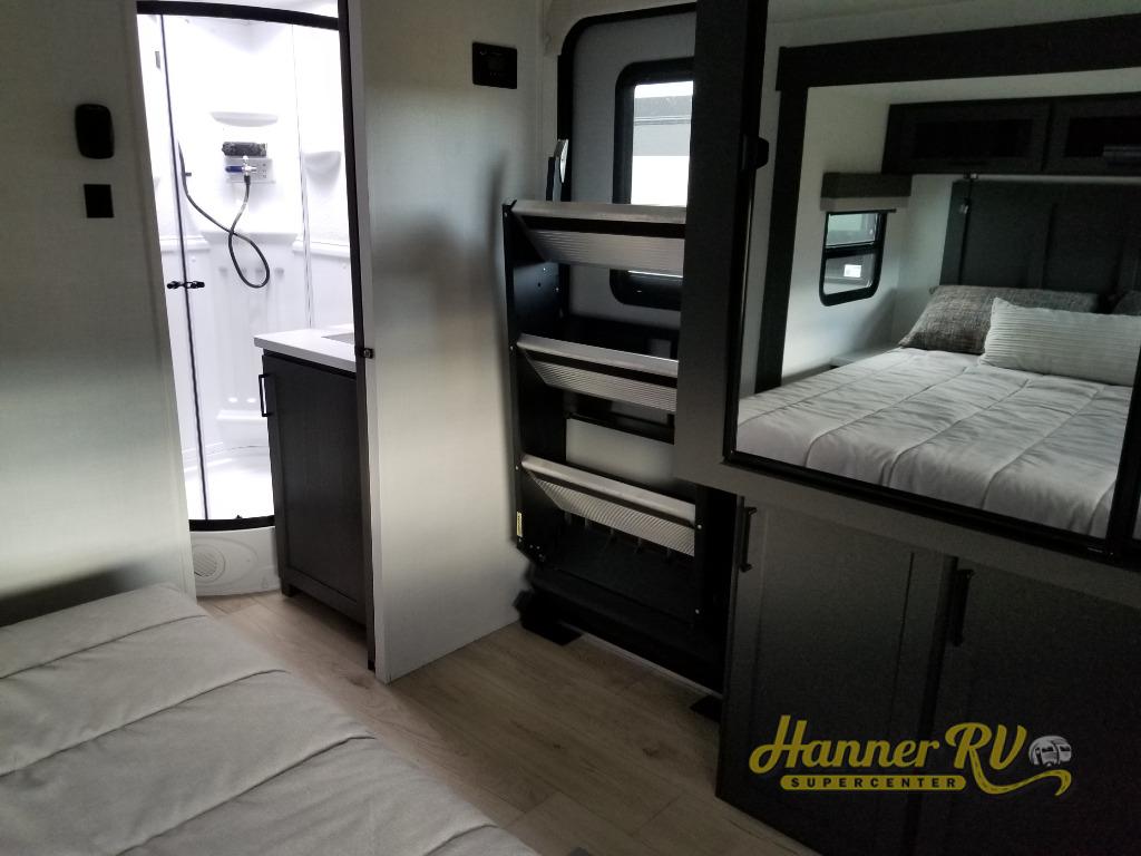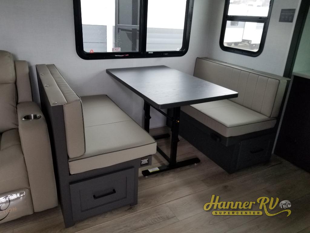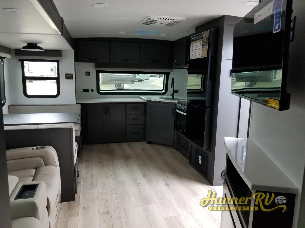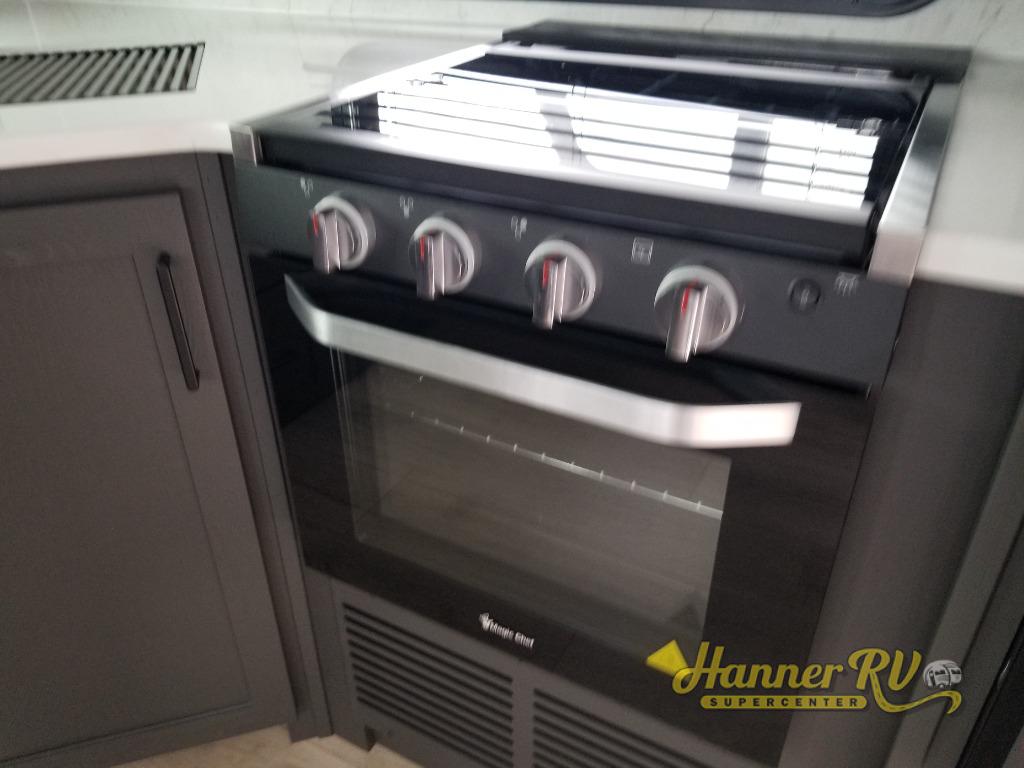 When you are outside this trailer you can enjoy the protection from the 21' power awning, you will also find exterior storage for your extra gear, and a ladder at the rear. You get to choose which entrance to step up into, be it the spacious rear bedroom with a queen bed slide and a wardrobe, or the main entry into the kitchen and living area. The furniture slide includes a booth dinette to eat your meals at, and theater seating to watch the Smart TV with a fireplace below. And the cook will love the front kitchen with extra counter space, a three-burner range, plus a 12V refrigerator and pantry for food storage!