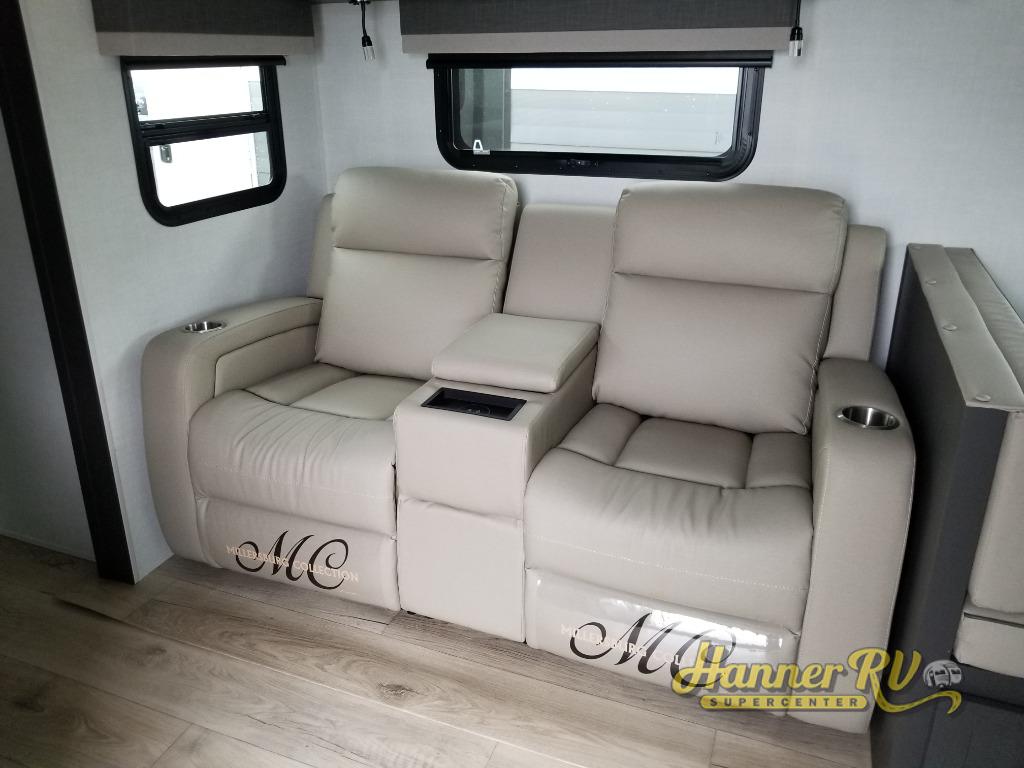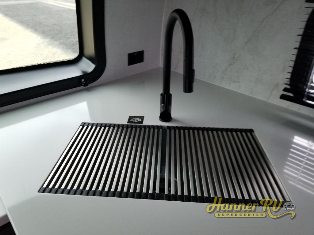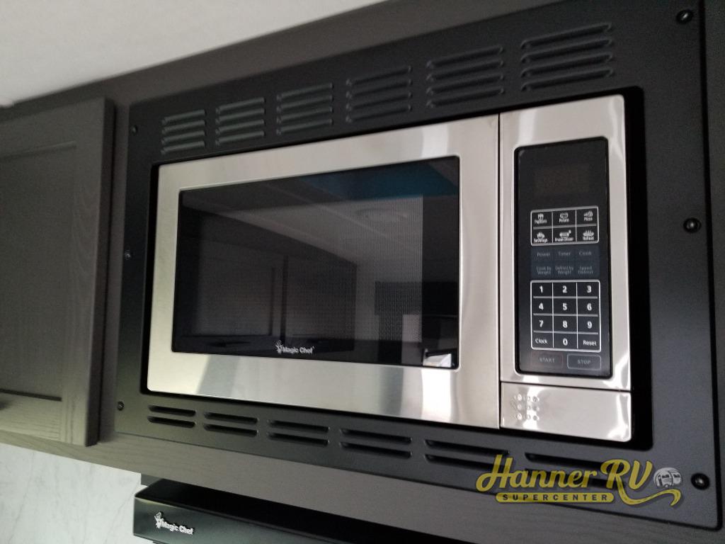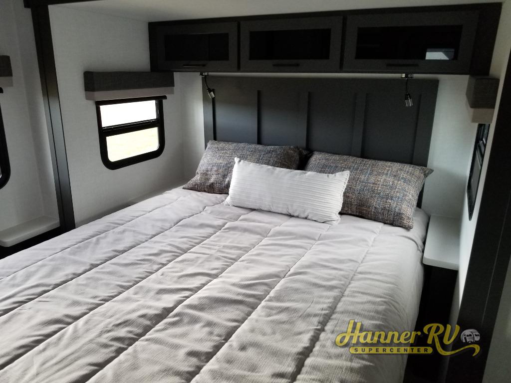 When you are outside this trailer you can enjoy the protection from the 21' power awning, you will also find exterior storage for your extra gear, and a ladder at the rear. You get to choose which entrance to step up into, be it the spacious rear bedroom with a queen bed slide and a wardrobe, or the main entry into the kitchen and living area. The furniture slide includes a booth dinette to eat your meals at, and theater seating to watch the Smart TV with a fireplace below. And the cook will love the front kitchen with extra counter space, a three-burner range, plus a 12V refrigerator and pantry for food storage!