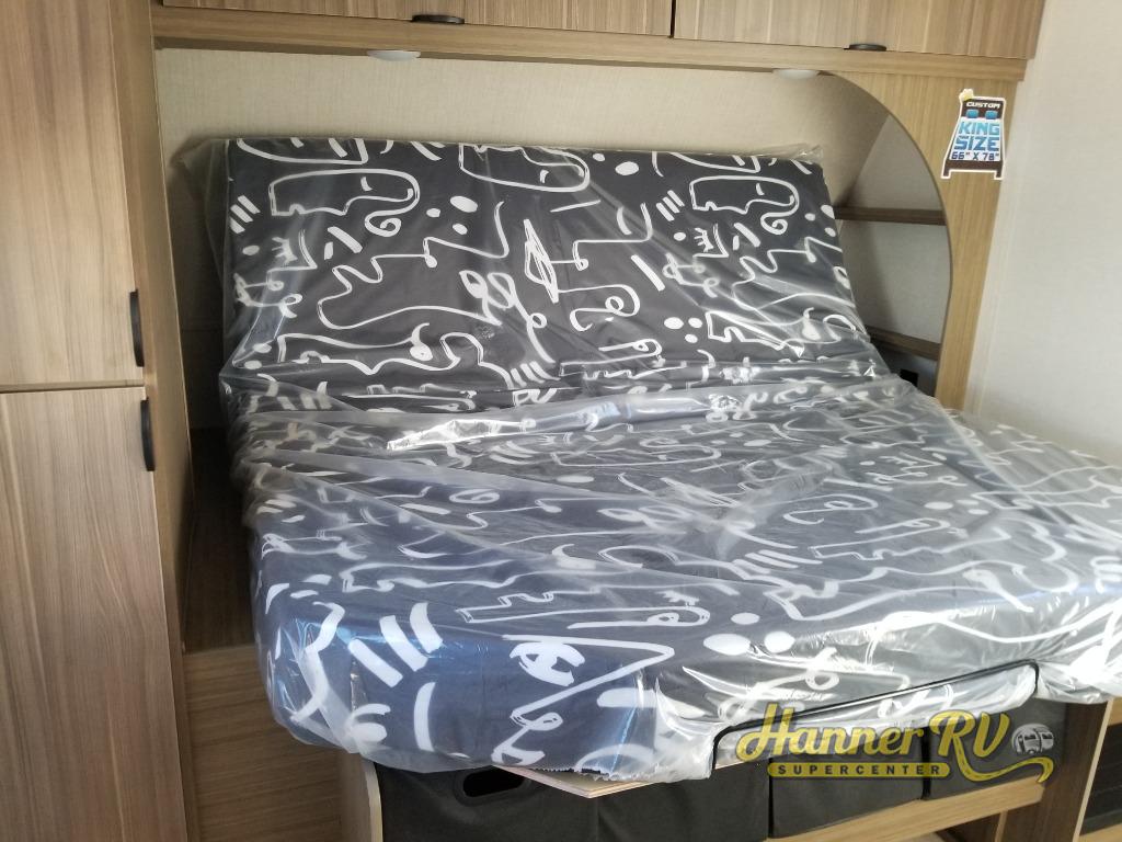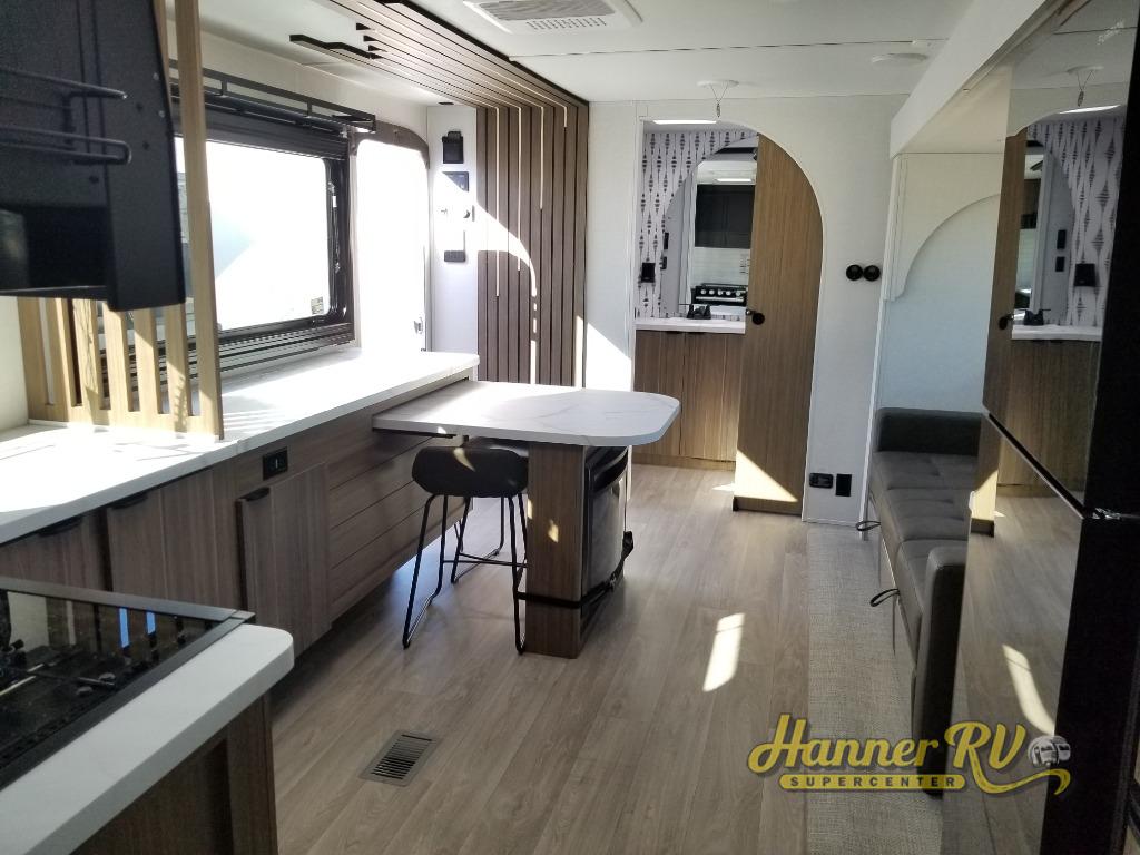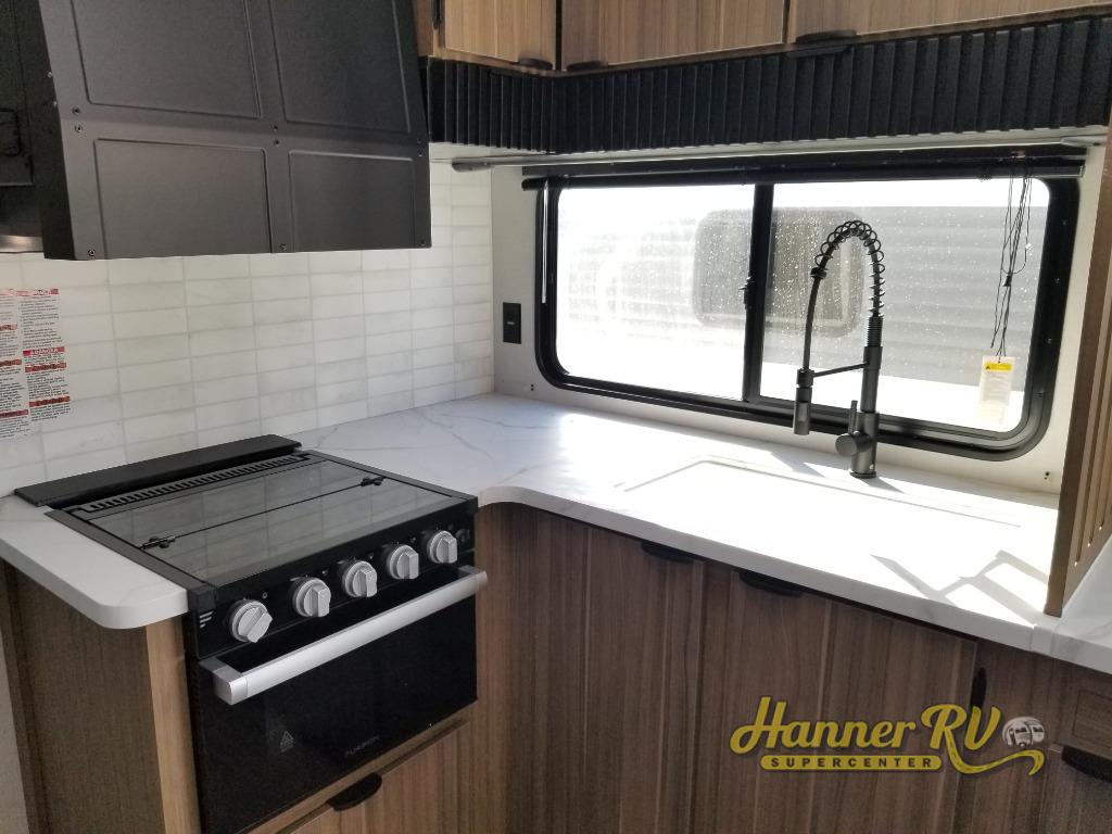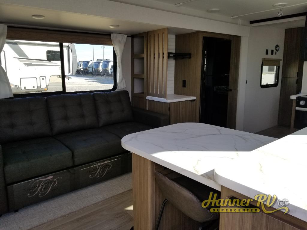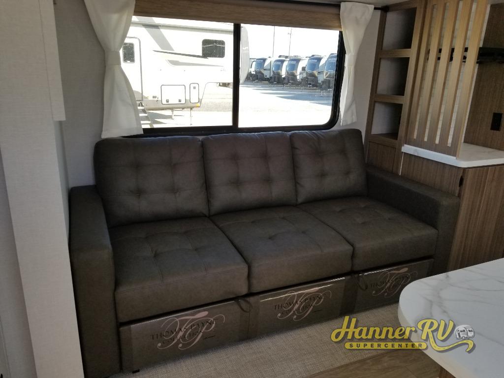 You can enjoy at-home comforts wherever you decide to camp in this travel trailer. The custom king bed with Versa Tilt includes dual shelves and a wardrobe so you can keep your space tidy. If you have a guest or two little ones, they can sleep on the jackknife sofa within the large slide out. Once you've made breakfast in the fully equipped kitchen, you can utilize the pull-out table to dine at. There is also a fireplace below the table, which will be perfect for cozy evenings indoors. And don't overlook the full rear bath, complete with a spacious shower, a toilet, bath shelves, and ample counter space!