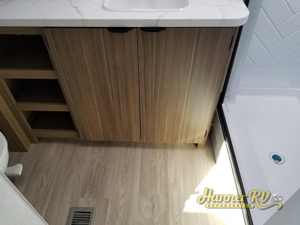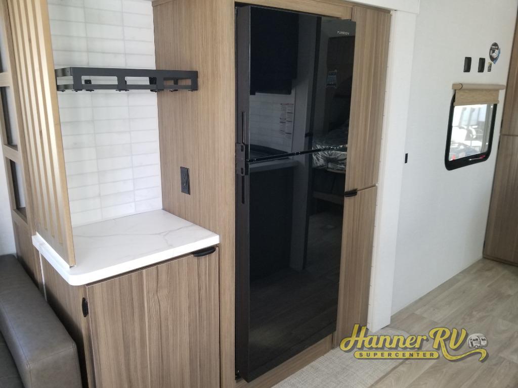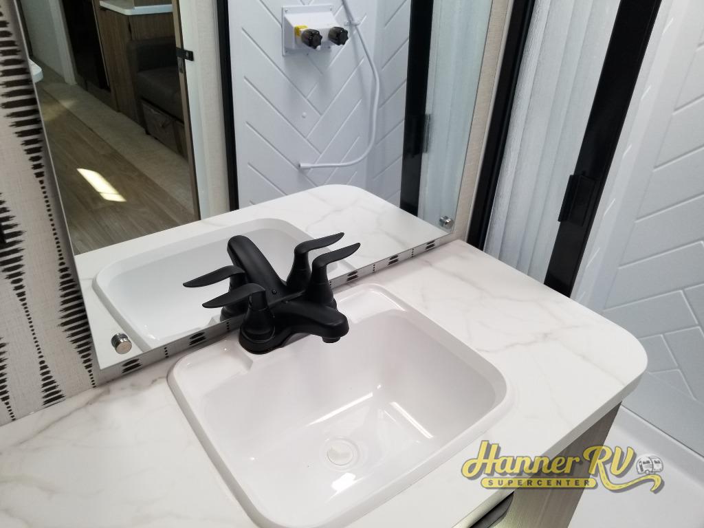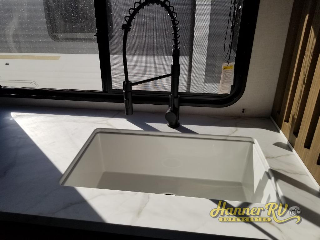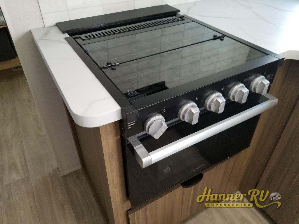 You can enjoy at-home comforts wherever you decide to camp in this travel trailer. The custom king bed with Versa Tilt includes dual shelves and a wardrobe so you can keep your space tidy. If you have a guest or two little ones, they can sleep on the jackknife sofa within the large slide out. Once you've made breakfast in the fully equipped kitchen, you can utilize the pull-out table to dine at. There is also a fireplace below the table, which will be perfect for cozy evenings indoors. And don't overlook the full rear bath, complete with a spacious shower, a toilet, bath shelves, and ample counter space!