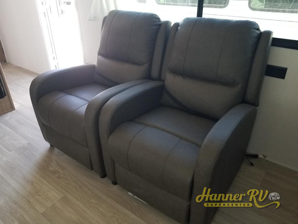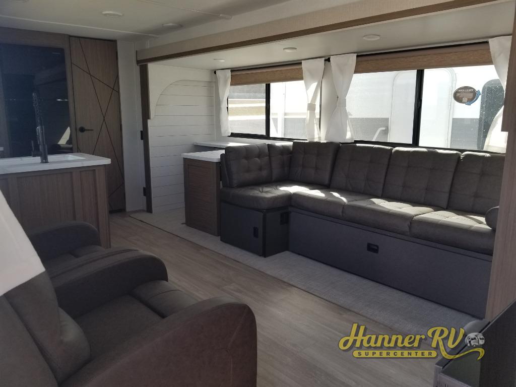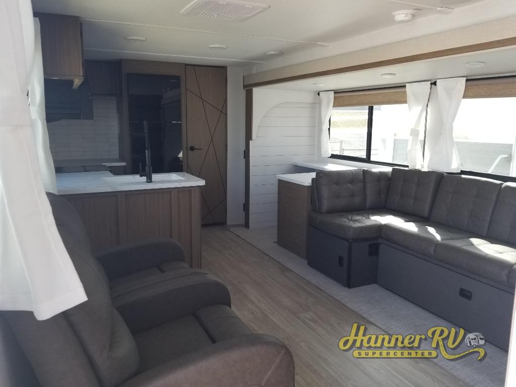 This Wildwood travel trailer is perfect for your family looking for a new adventure. You will enjoy the rear kitchen that includes a refrigerator and cooktop. The Versa-Lounge will provide comfortable seating and sleeping space, and the Versa Flex table gives you a space to dine and work if needed. This unit also includes two lounge chairs, so you'll feel right at home! You'll love the full bath in this unit, and the custom king bed with Versa-Tilt in the private bedroom is perfect for a good night's rest.
