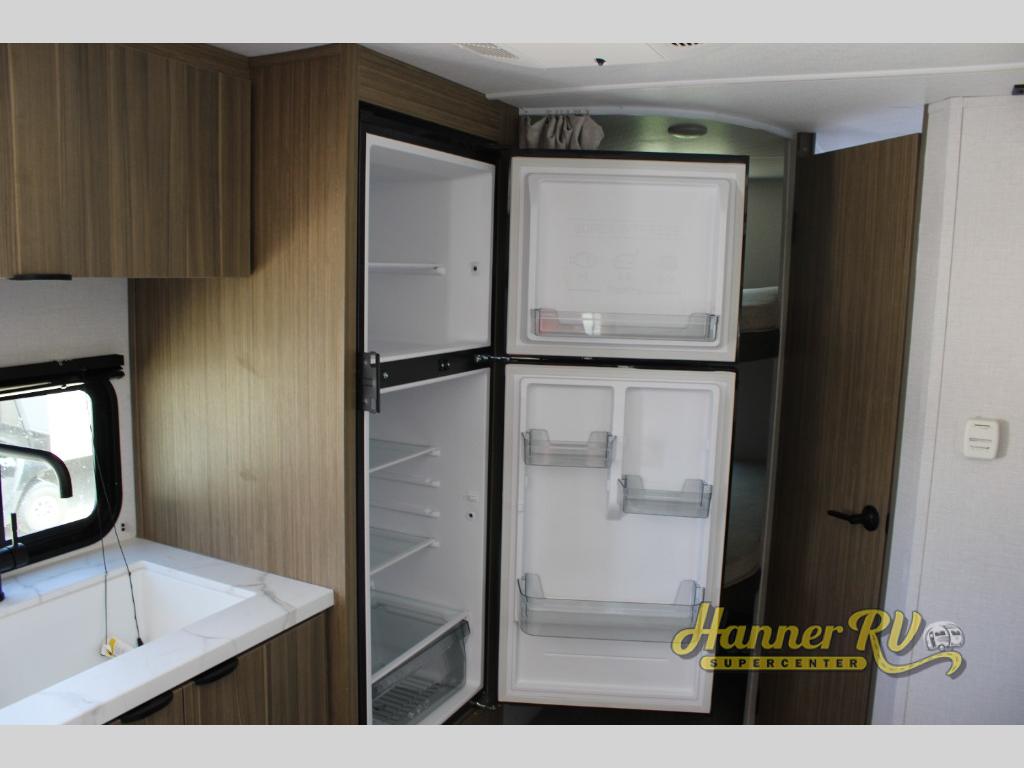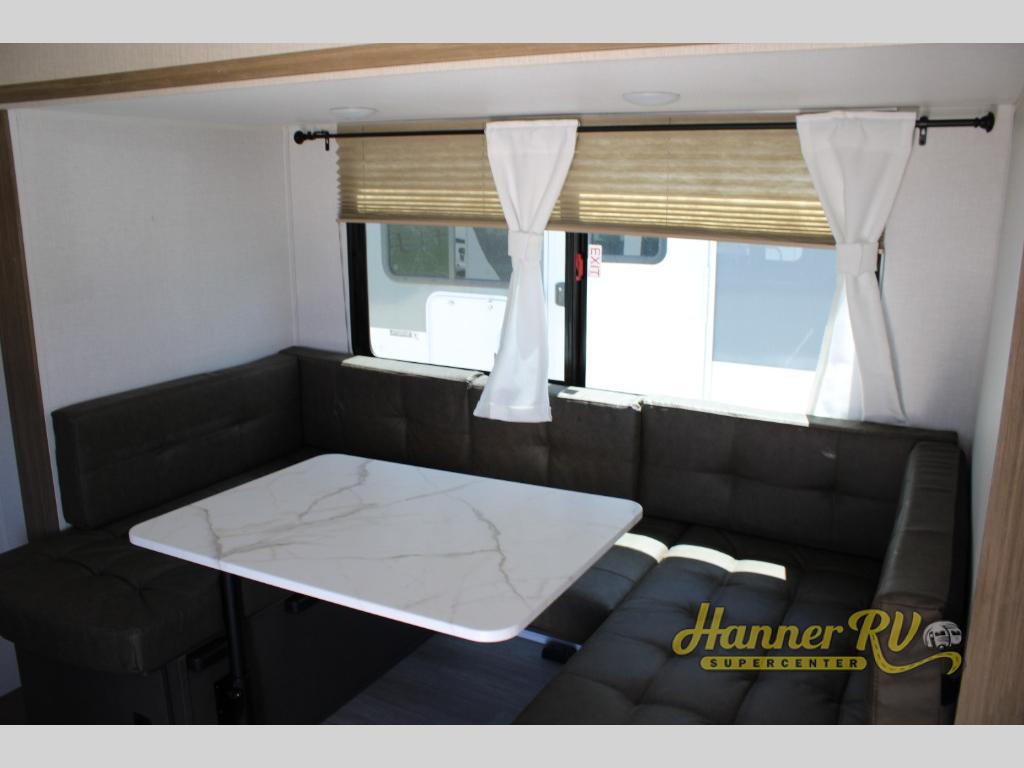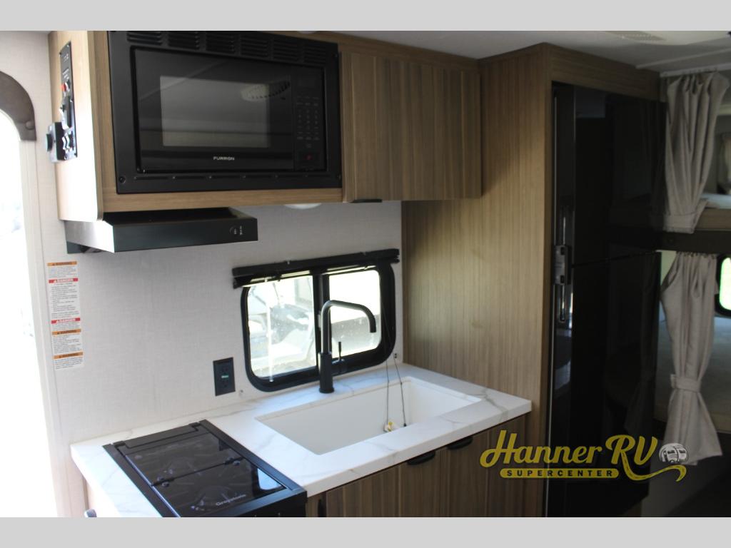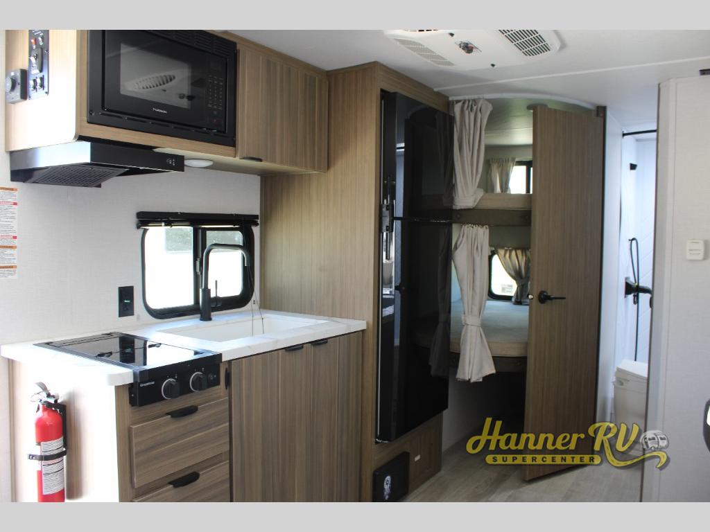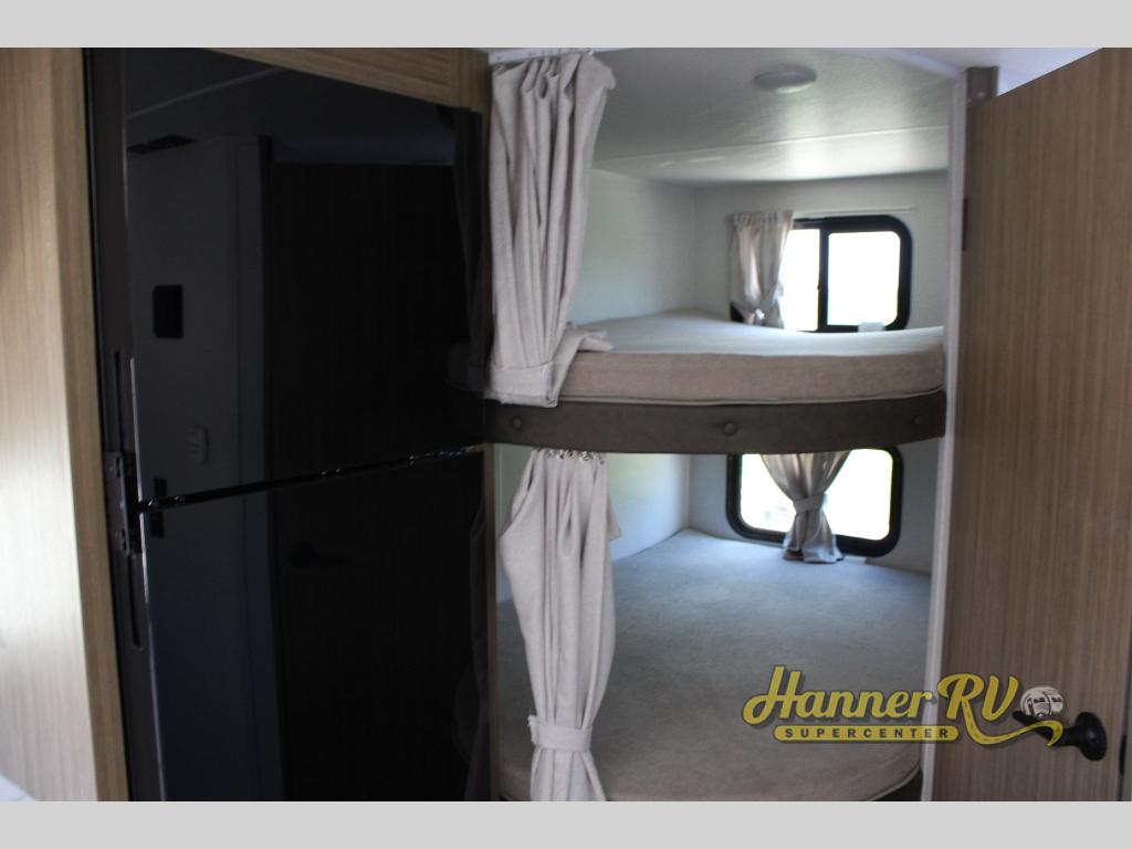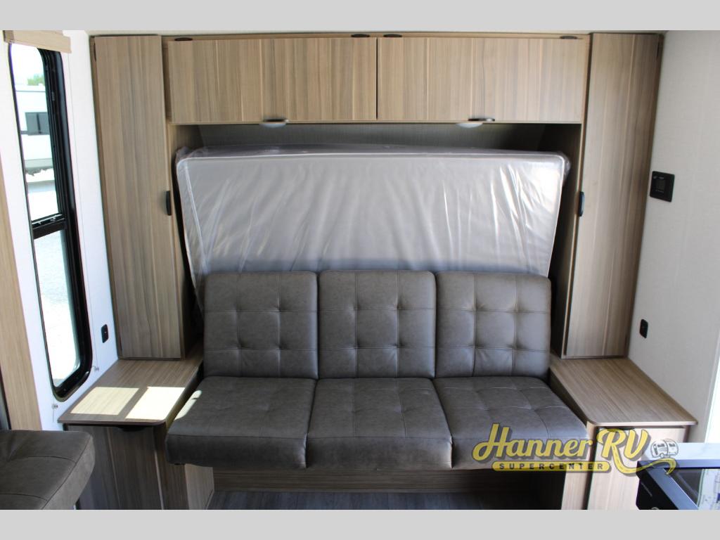 Bring your whole crew along for trips in this roomy travel trailer that can sleep eight people each night. Once you've set up the 14' power awning with LED lights, make lunch on the outdoor kitchen. Explore some trails or take your fishing poles down to the river, then head back to the trailer to clean up in the full bath. The kids may want to rest on the double-size bunks, while the adults play a game around the U-shaped dinette. This model also includes a sofa plus a Murphy bed that lowers over the sofa when you're ready for bed. Don't let this travel trailer slip away!