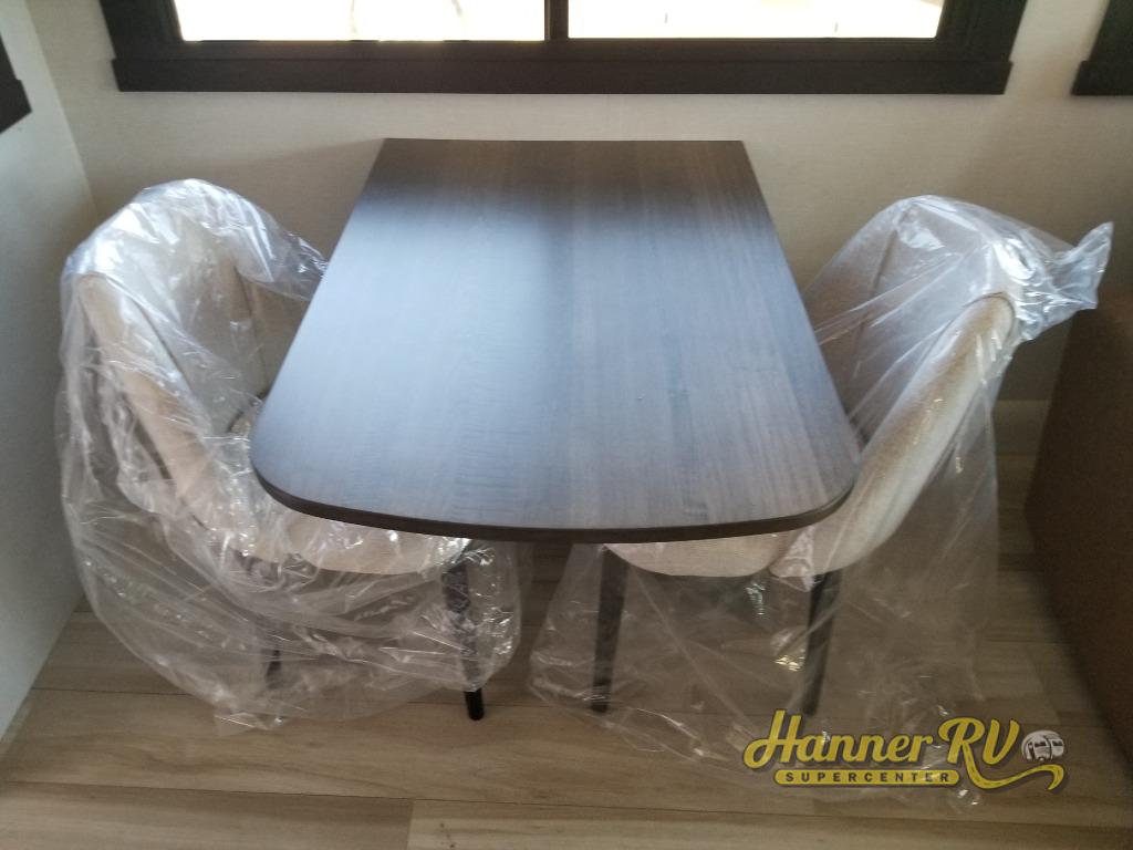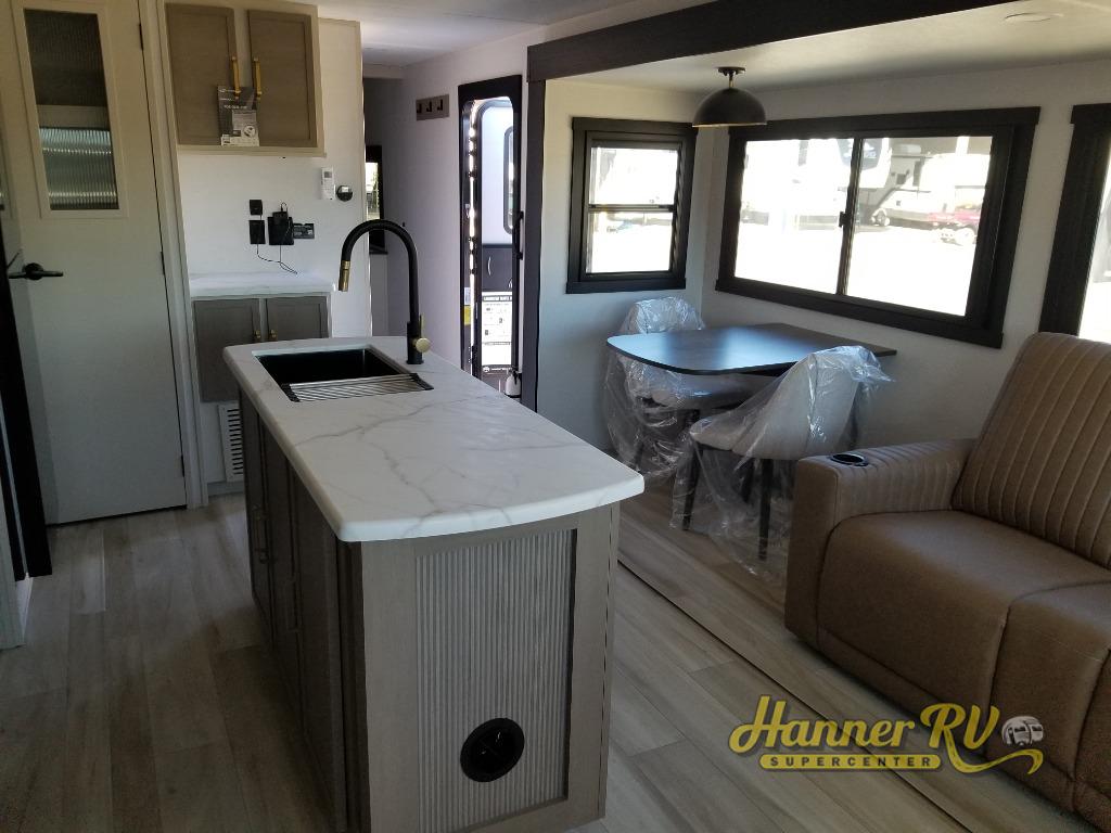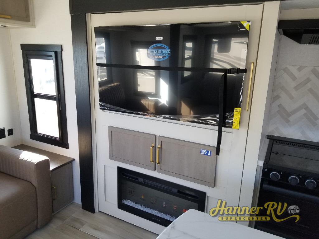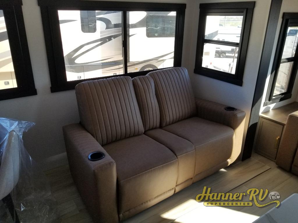 You are going to love the spacious private bedroom with a space-saving door, custom king bed slide, a dresser, and a full-width wardrobe with washer and dryer prep. If you ever decide to get out of bed, you can enjoy a relaxing shower in the residential shower with a skylight and a wide-open kitchen and living area with dual opposing slide outs. The cook will love having a kitchen island, a hutch, a large pantry, plus a 12V refrigerator. There is an entertainment center with a 50" TV and fireplace plus plenty of seating on the furniture. You can dine at the booth dinette or choose to add the free-standing dinette option if you prefer having your own seat. And don't forget about the natural lighting and views you will receive from the panoramic windows.