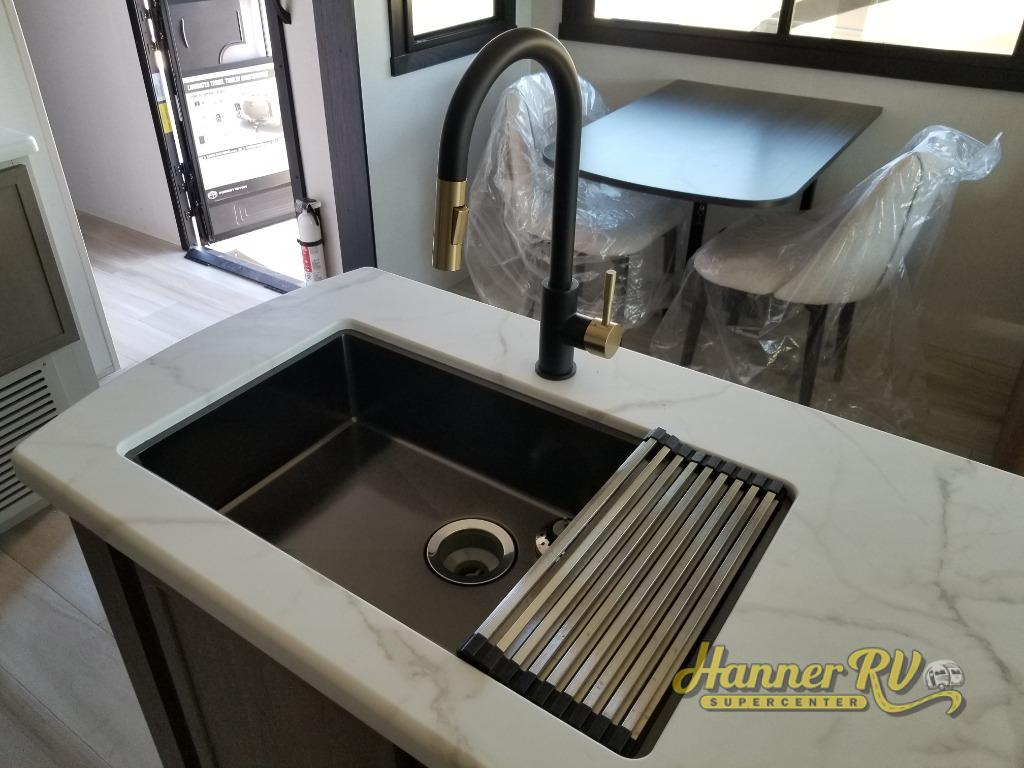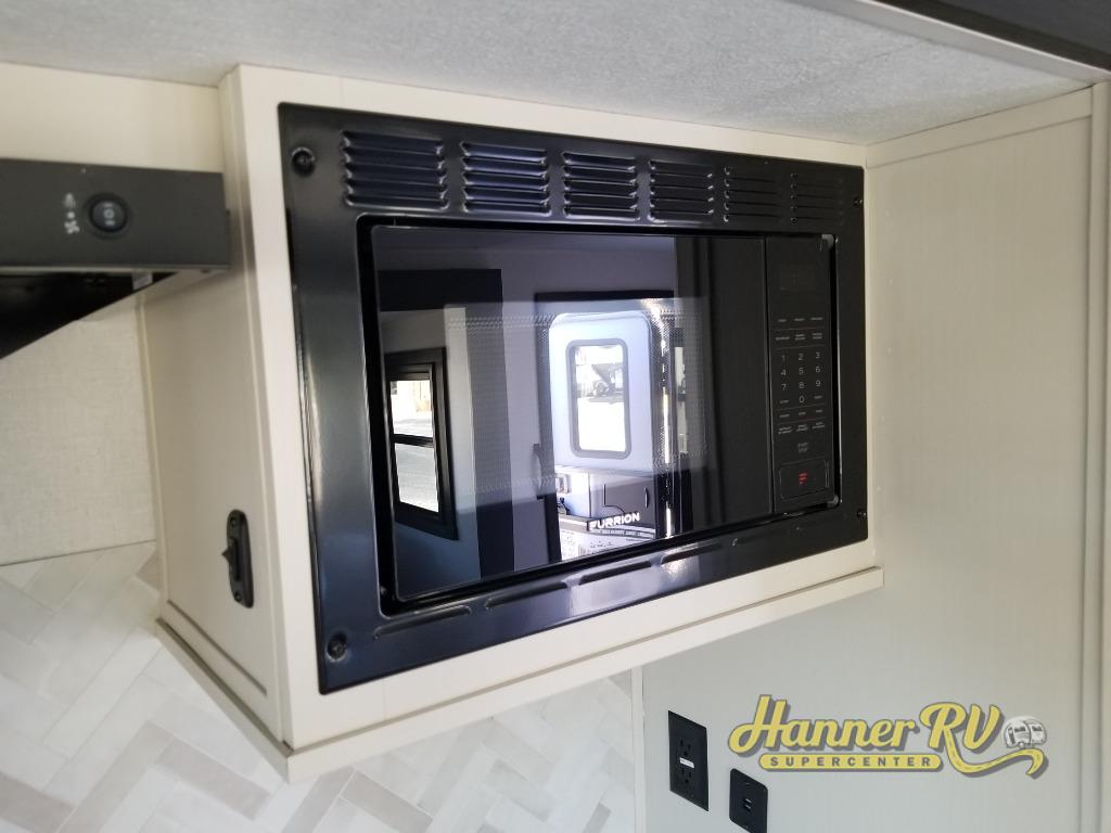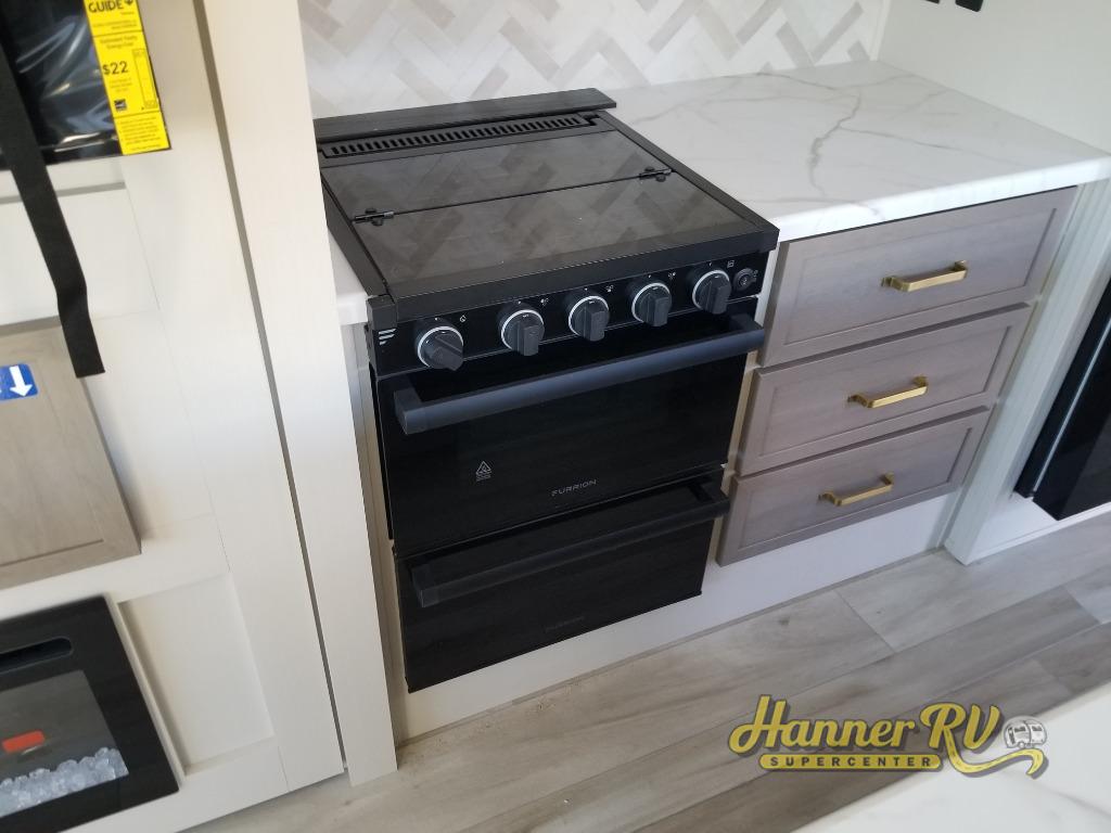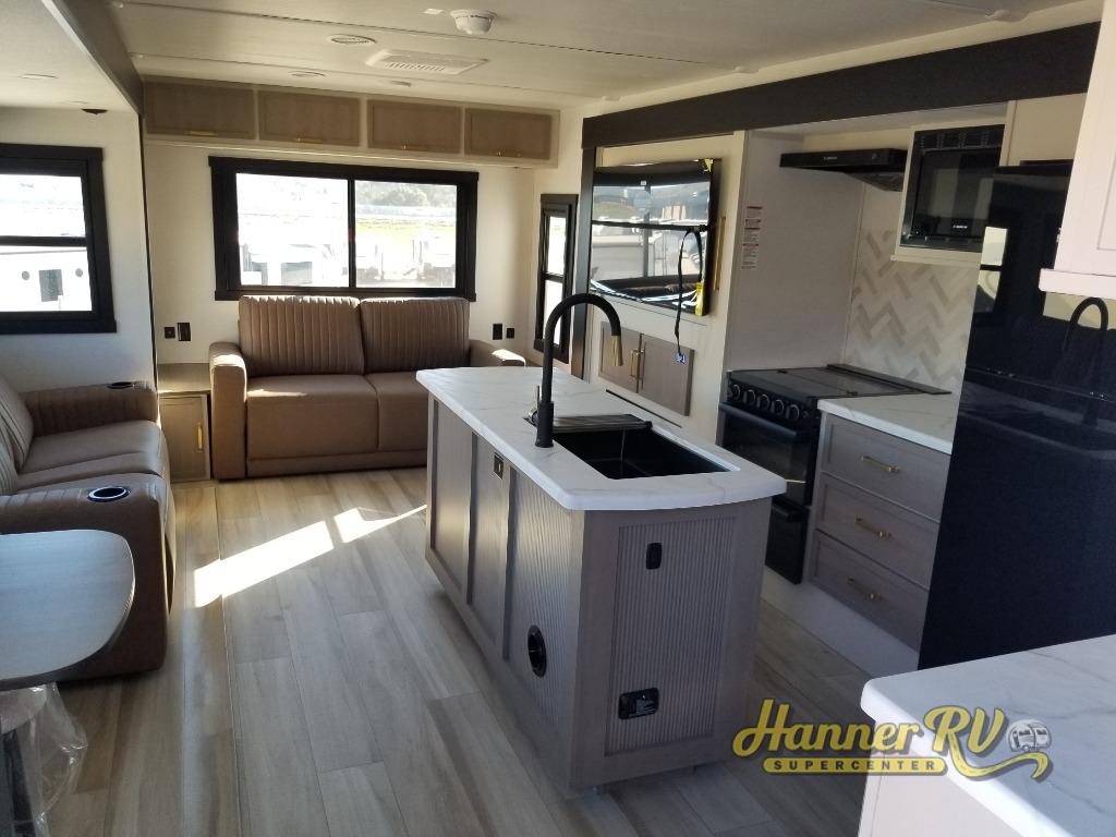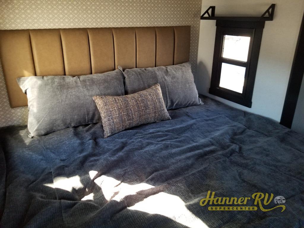 You are going to love the spacious private bedroom with a space-saving door, custom king bed slide, a dresser, and a full-width wardrobe with washer and dryer prep. If you ever decide to get out of bed, you can enjoy a relaxing shower in the residential shower with a skylight and a wide-open kitchen and living area with dual opposing slide outs. The cook will love having a kitchen island, a hutch, a large pantry, plus a 12V refrigerator. There is an entertainment center with a 50" TV and fireplace plus plenty of seating on the furniture. You can dine at the booth dinette or choose to add the free-standing dinette option if you prefer having your own seat. And don't forget about the natural lighting and views you will receive from the panoramic windows.