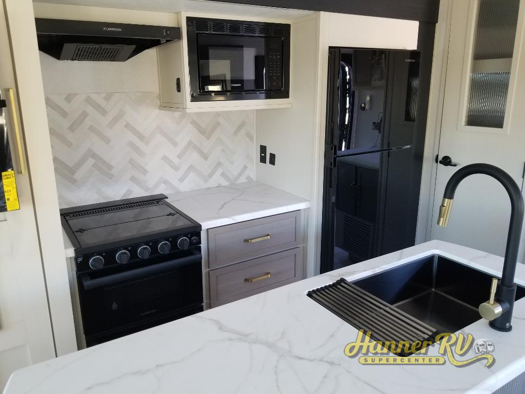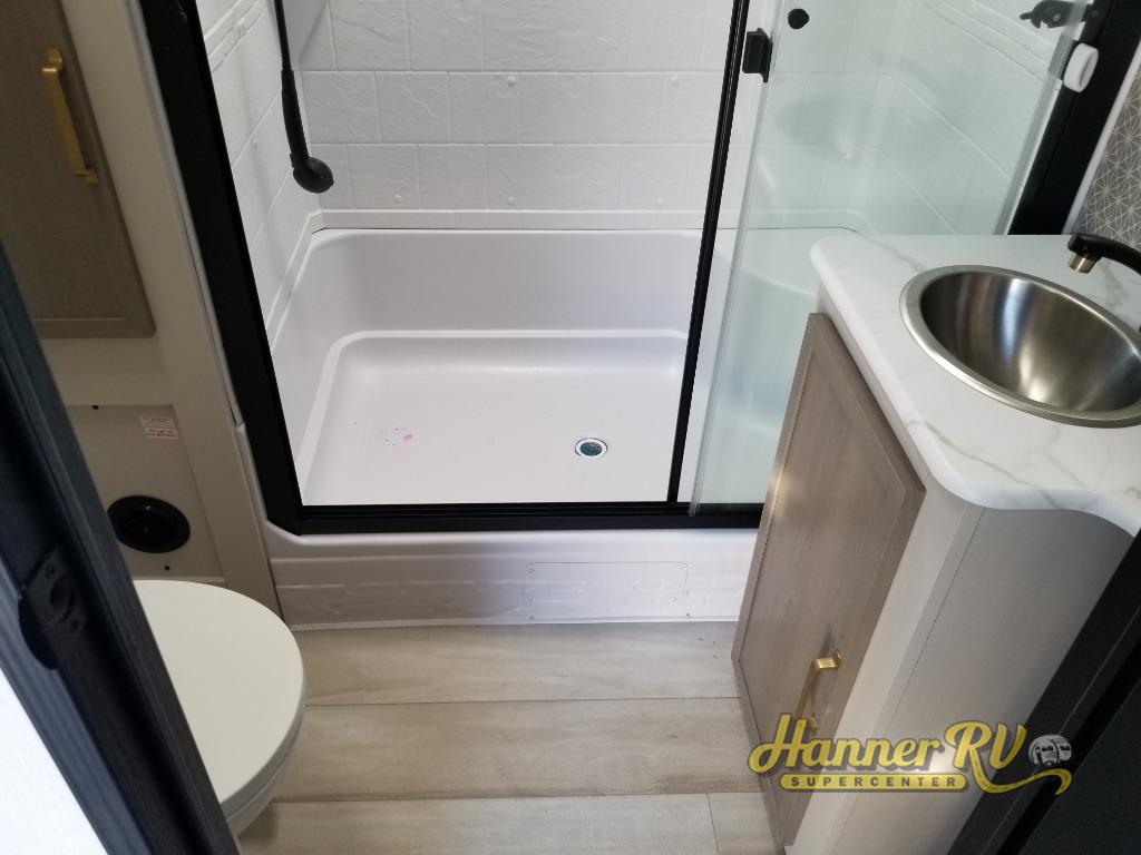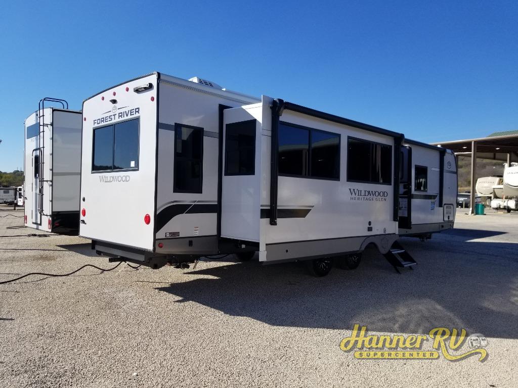 With any Wildwood Heritage Glen travel trailer by Forest River, the quality construction, attention to detail and design along with a bright and welcoming interior allows you to relax in comfort. Each model includes a WeatherShield one piece fiberglass roof, nitrogen-filled radial tires, and an enclosed underbelly with 12V tank heaters on all holding tanks for added protection. You will appreciate the on-demand tankless water heater, along with power stabilizer and tongue jacks, and an extra-large pass-thru storage with slam latch baggage doors. Head inside to enjoy matte gold hardware, wood door casings in place of plastic door casings, and an ultimate interior lighting upgrade with 4k puck/strip lights and a stylish LED back-lit bath mirror!