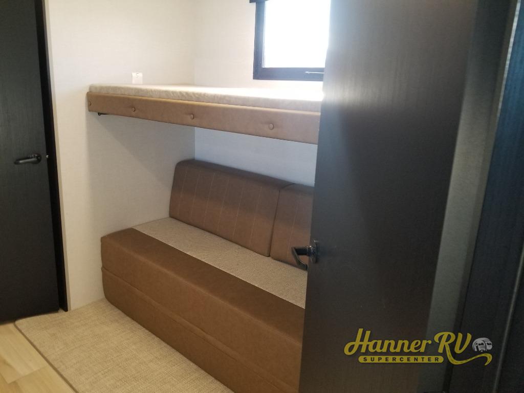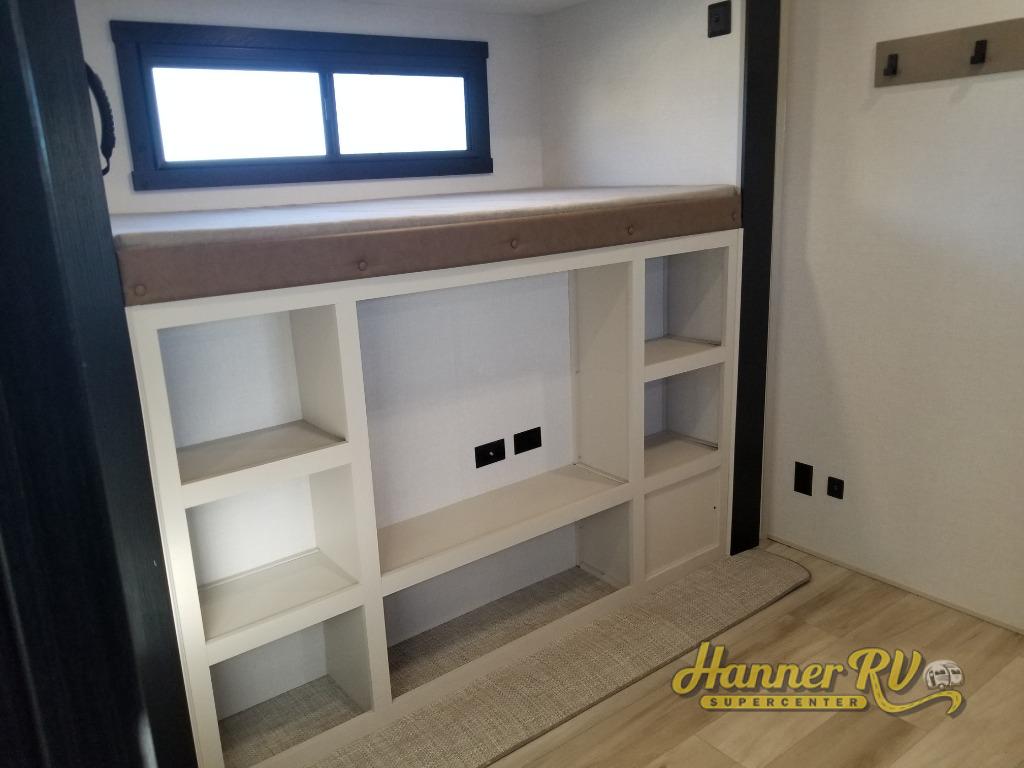 Not all fifth wheels are alike, and once you own this Wildwood Heritage Glen, you will understand! The rear entry into the second full bathroom allows the kids or your friends to enter and exit quickly to get back outside to the fun. They will also be able to shower and then enter their private bunkhouse that has two bunks, a convertible sofa bed, and two slides that offer lots of floor space to play. You will have your own oasis on the opposite side in the front private bedroom that has a custom king bed, a full-width wardrobe, and washer and dryer prep. The other full bathroom is only steps away from the main entrance and living area. The inside kitchen offers even more amenities, and the fourth slide provides a family U-shaped dinette and tri-fold sofa.