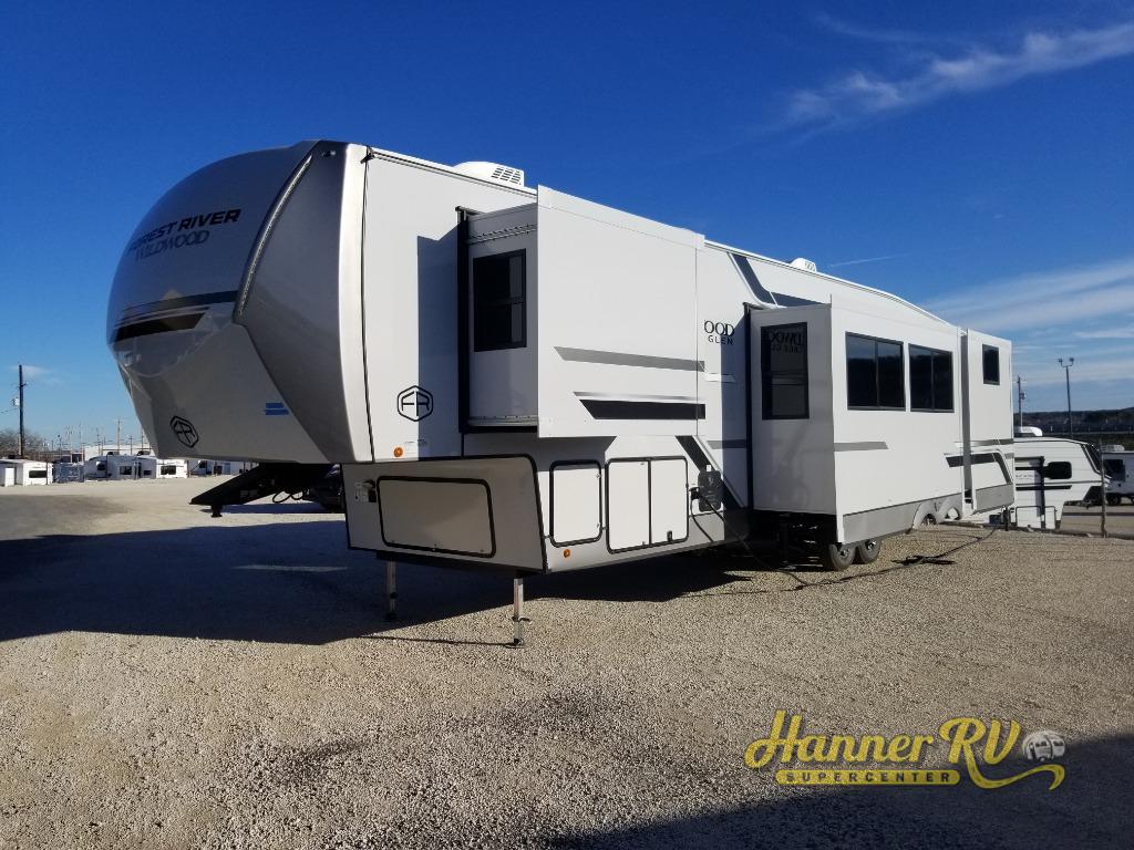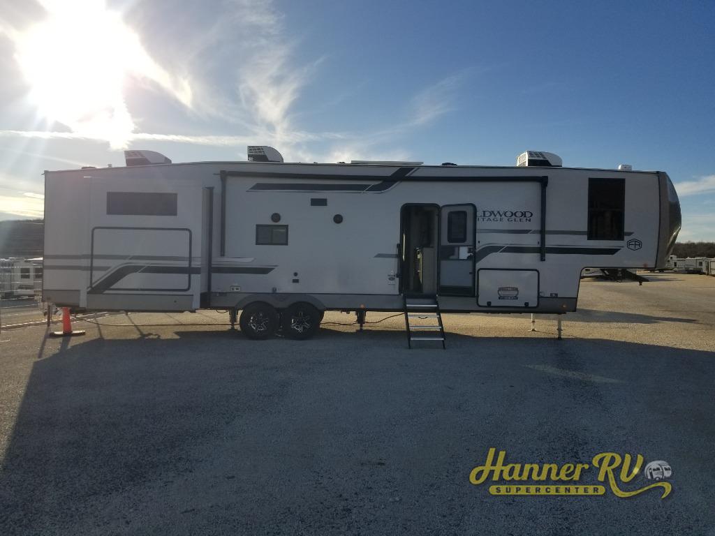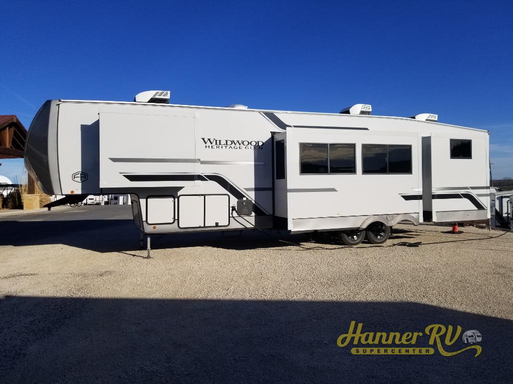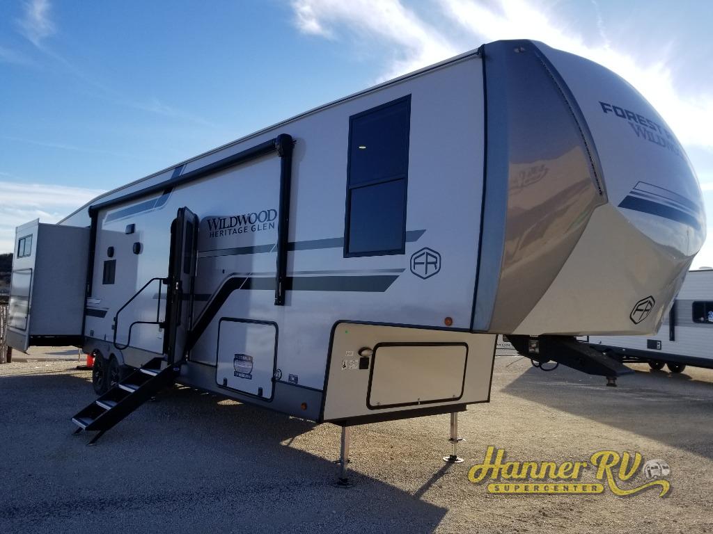 With any Wildwood Heritage Glen fifth wheel by Forest River, the quality construction, attention to detail and design along with a bright and welcoming interior allows you to relax in comfort. You'll love the high-end solid surface countertops included in the Elevated Value Package, along with a JBL sound system, full-length barreled ceilings, and an ultimate interior lighting upgrade. The included Expedition Package features an Accesibelly underbelly panel with 12V tank heaters, nitrogen-filled tires with aluminum rims, and a spacious 30" wide main entry door with a window. The Lippert On-The-Go ladder prep and back-up camera prep let you customize your fifth wheel even more, and the LED awning, front cap, marker and taillights will make it easier than ever to set up camp!