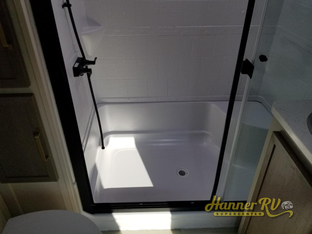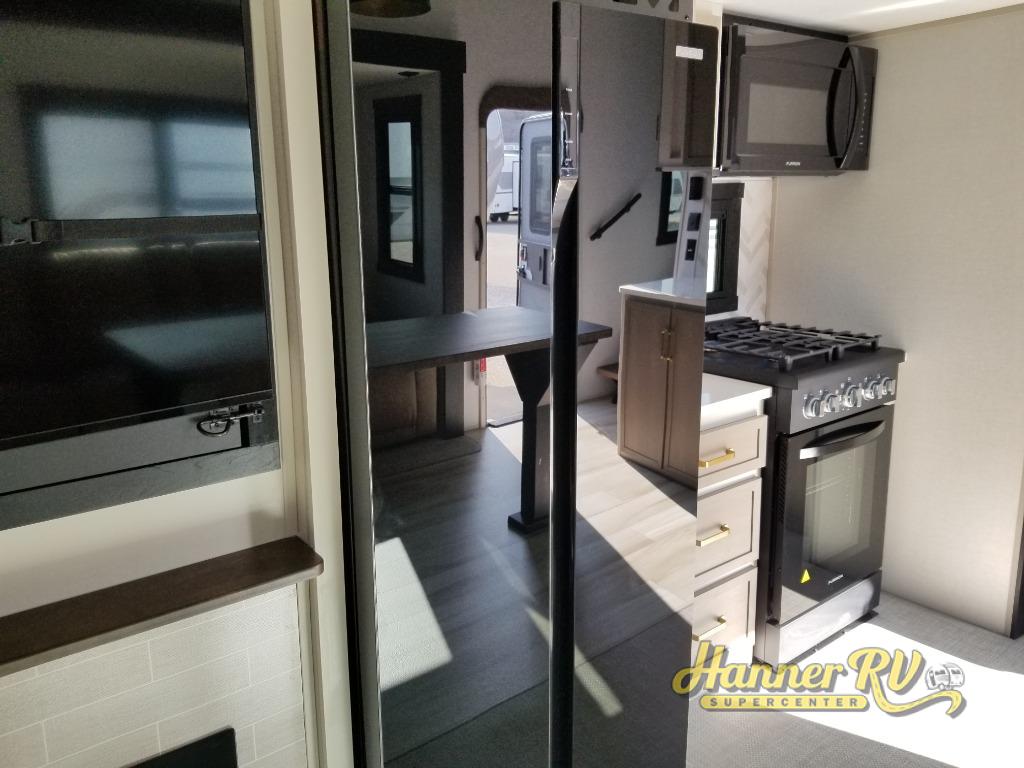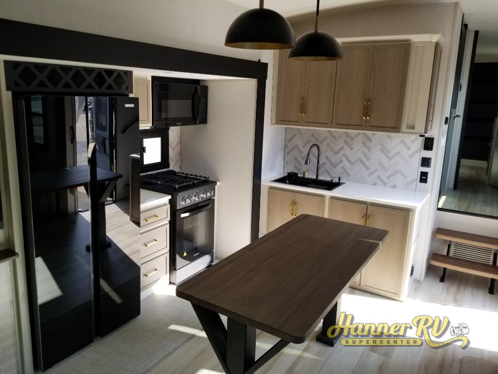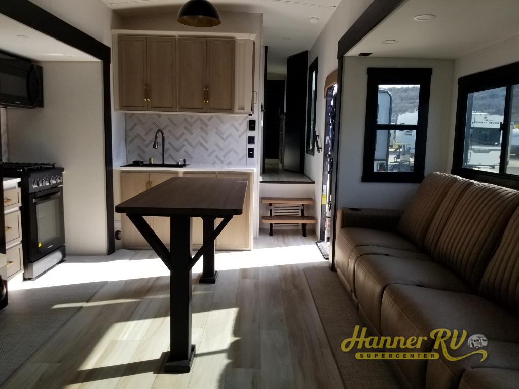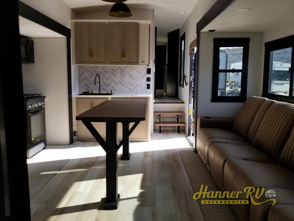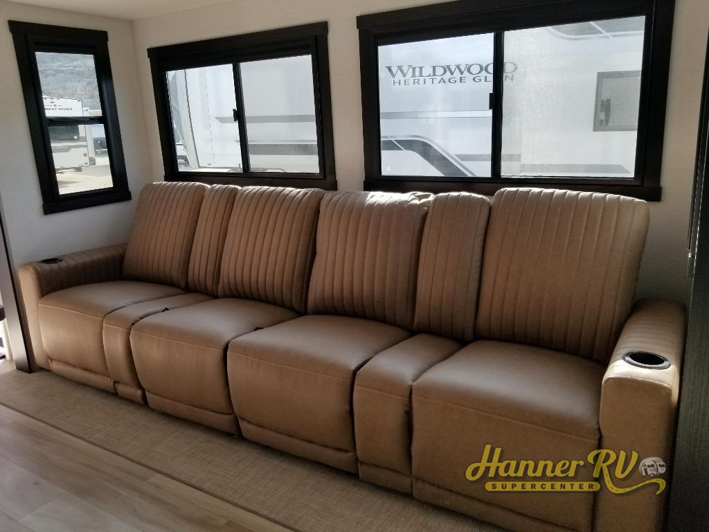 With any Wildwood Heritage Glen fifth wheel by Forest River, the quality construction, attention to detail and design along with a bright and welcoming interior allows you to relax in comfort. You'll love the high-end solid surface countertops included in the Elevated Value Package, along with a JBL sound system, full-length barreled ceilings, and an ultimate interior lighting upgrade. The included Expedition Package features an Accesibelly underbelly panel with 12V tank heaters, nitrogen-filled tires with aluminum rims, and a spacious 30" wide main entry door with a window. The Lippert On-The-Go ladder prep and back-up camera prep let you customize your fifth wheel even more, and the LED awning, front cap, marker and taillights will make it easier than ever to set up camp!