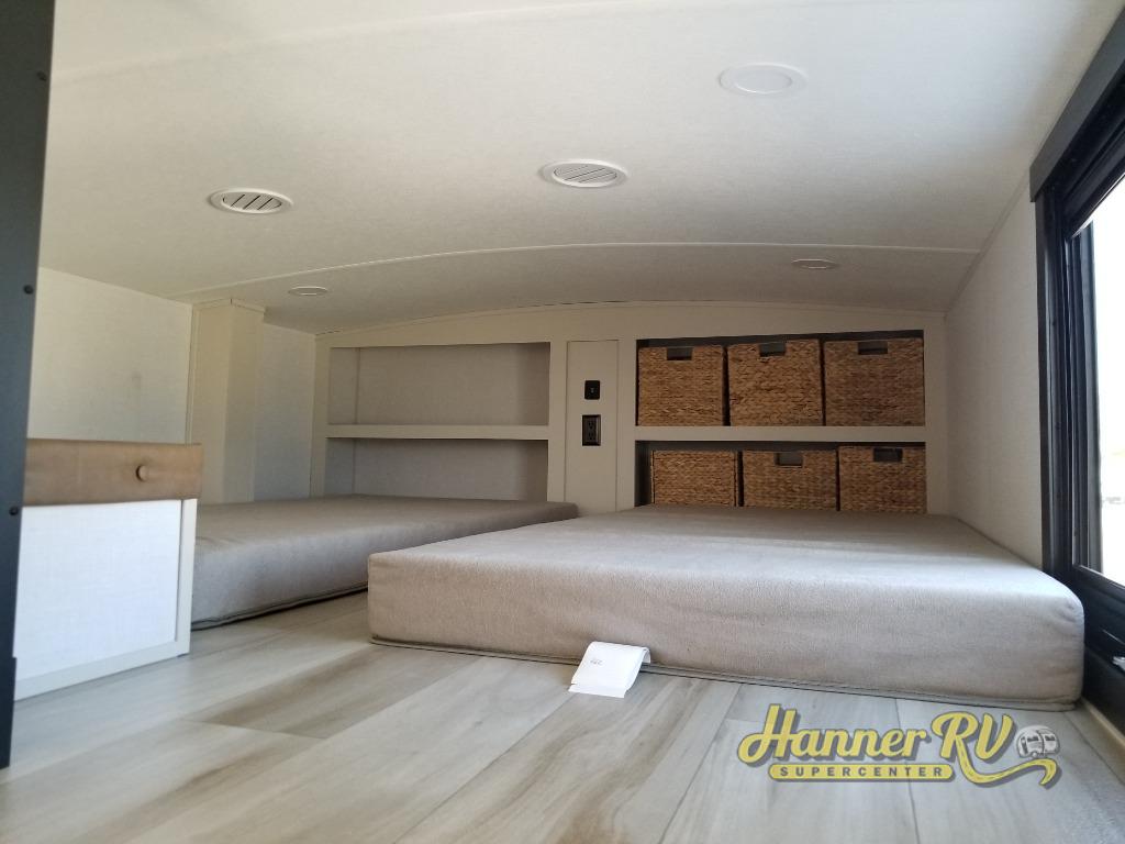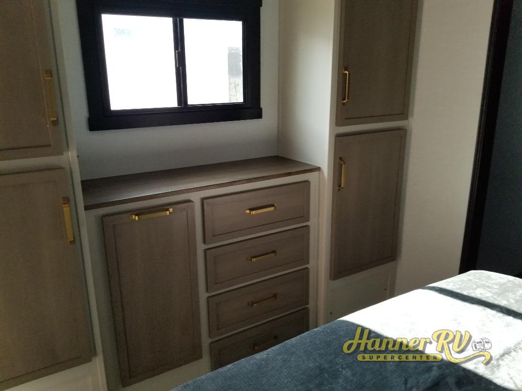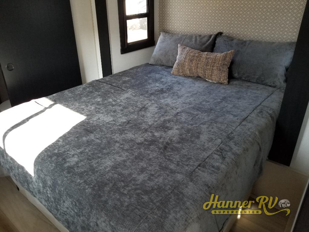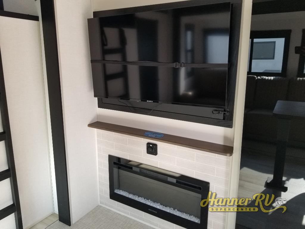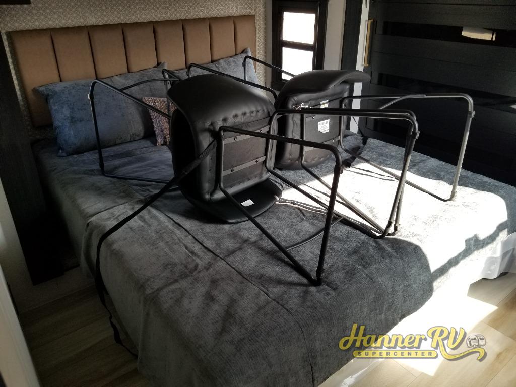 The whole family will love camping in this spacious fifth wheel! There are four slide outs, two bedrooms, plus two full baths, one of which is located in the rear master bedroom. A custom queen bed and dual wardrobes are also found in the master, while a custom king bed is found in the front private bedroom. And the loft with bunk mats can be used for additional sleeping or storage space! The chef of your group will find a full kitchen to cook meals, including ample counter space and a 16-cu. ft. 12V refrigerator and hidden storage behind the 50" TV for snacks or movies. The theater seating with cup holders provides a comfy place to relax each day, and the kitchen island with chairs will be perfect for dining space!