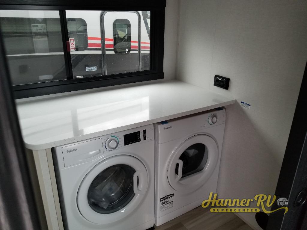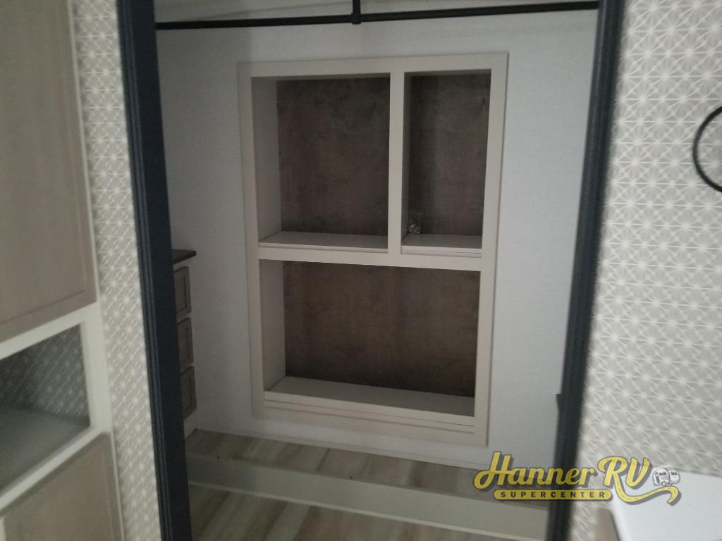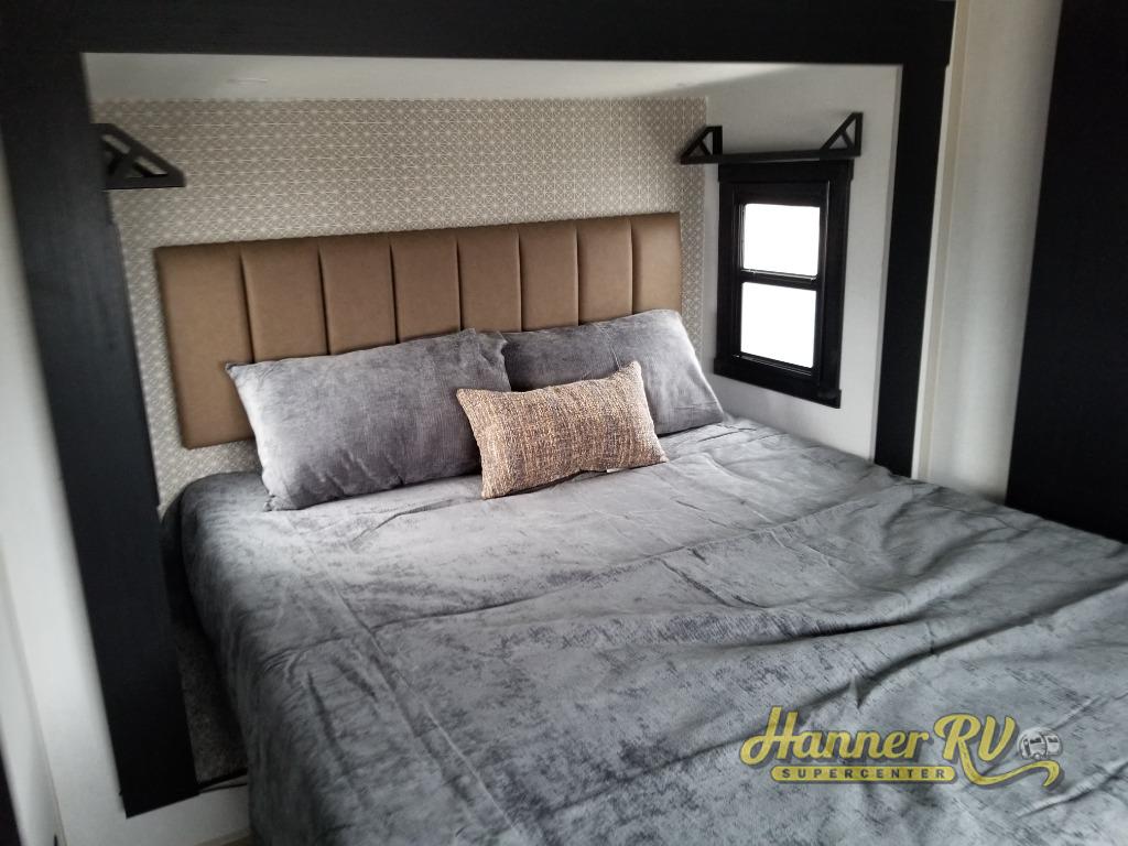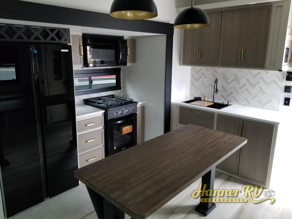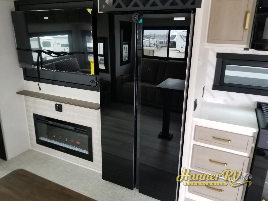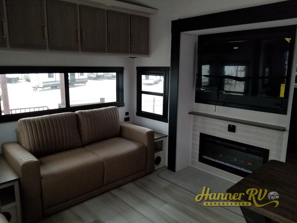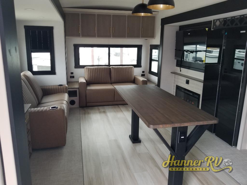 One look at this fifth wheel and you'll be sold! You can wake up each morning in the master bedroom that includes a custom king bed and a dresser with an ottoman. The front full bath has two bath sinks so you both can get ready at once, and you're going to love the walk-in wardrobe with a wrap-around hanging rod. A half bath includes a floating shelf with a hanging rod plus washer/dryer prep, giving you the option to make this a laundry room! The back of this unit is where you can cook meals with full kitchen amenities, dine at the kitchen island with four chairs, and relax on the theater seating and tri-fold sofa. A 50" TV and fireplace is also found here, complete with hidden storage behind for board games, movies, and snacks!