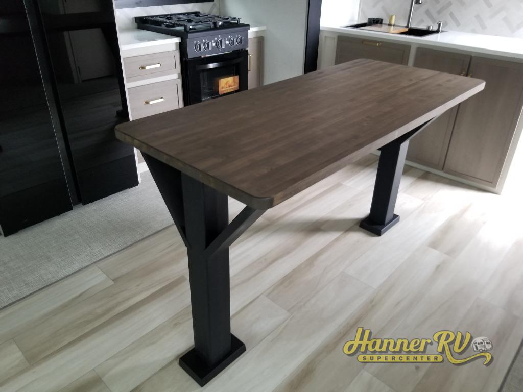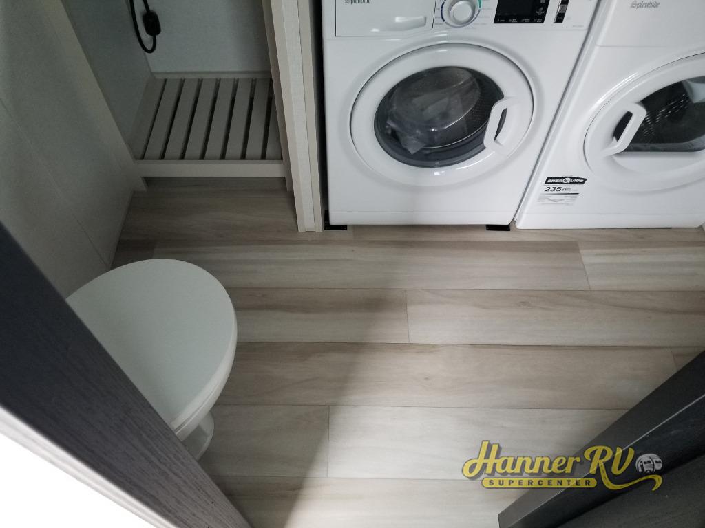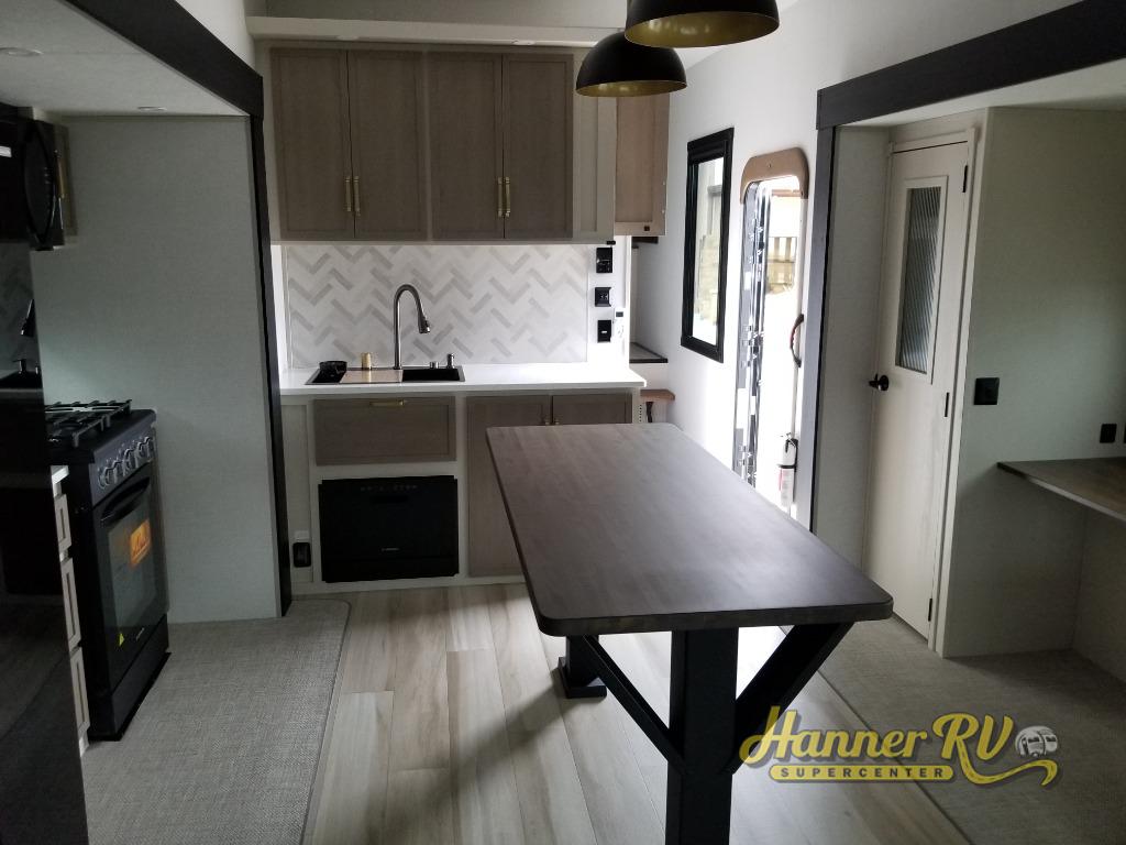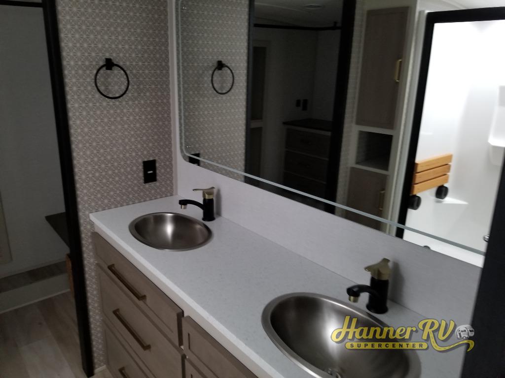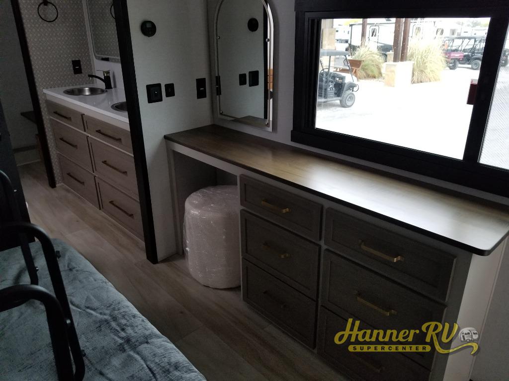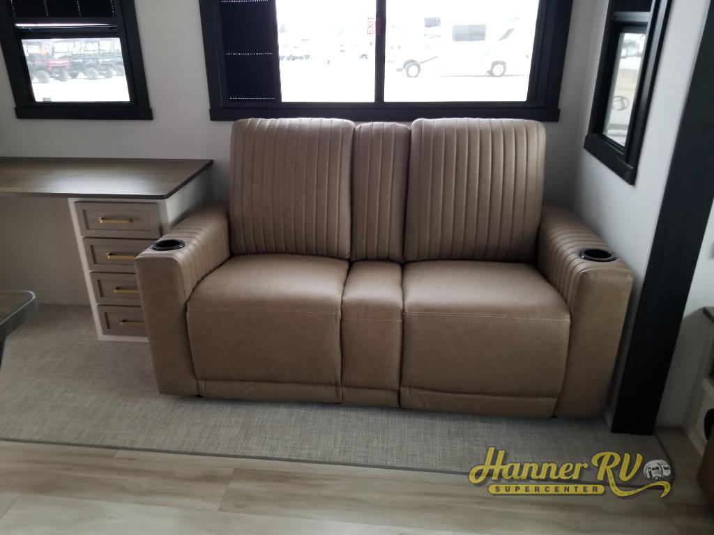 One look at this fifth wheel and you'll be sold! You can wake up each morning in the master bedroom that includes a custom king bed and a dresser with an ottoman. The front full bath has two bath sinks so you both can get ready at once, and you're going to love the walk-in wardrobe with a wrap-around hanging rod. A half bath includes a floating shelf with a hanging rod plus washer/dryer prep, giving you the option to make this a laundry room! The back of this unit is where you can cook meals with full kitchen amenities, dine at the kitchen island with four chairs, and relax on the theater seating and tri-fold sofa. A 50" TV and fireplace is also found here, complete with hidden storage behind for board games, movies, and snacks!
