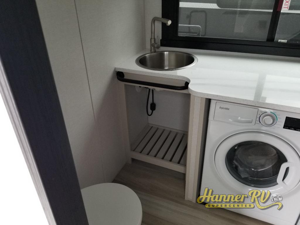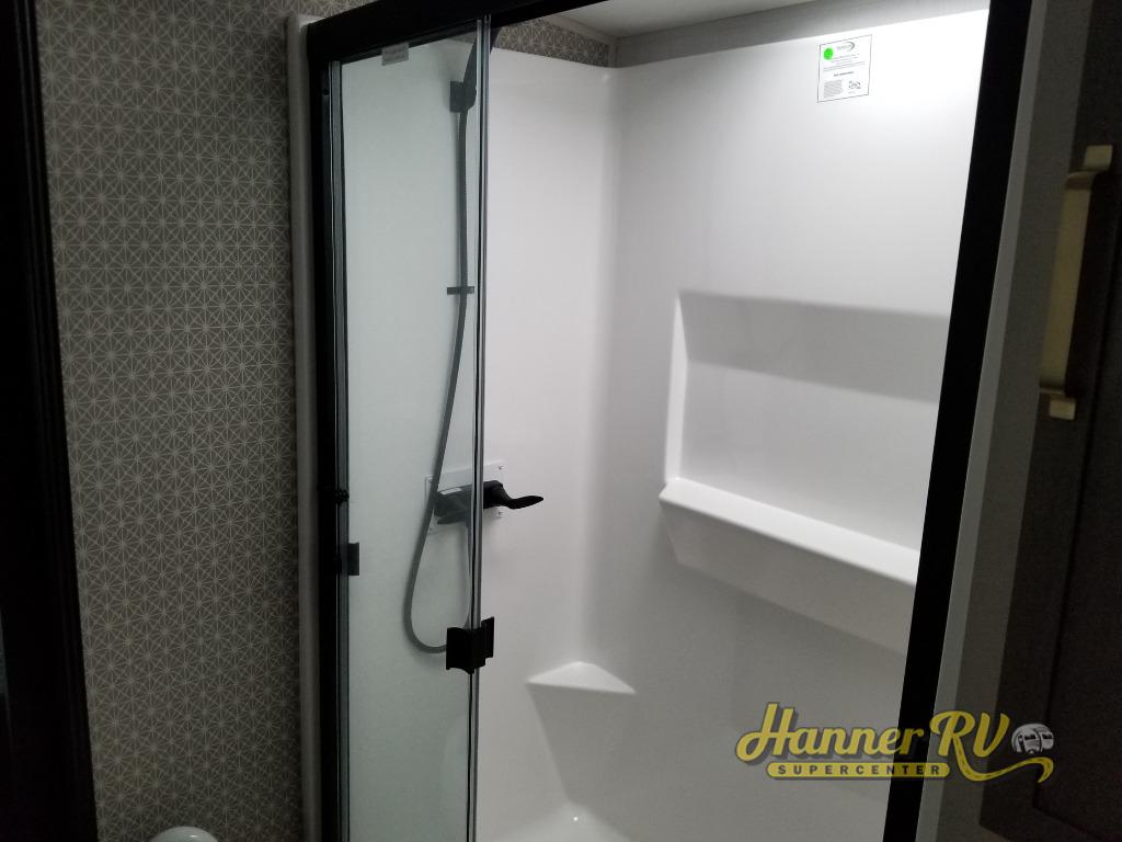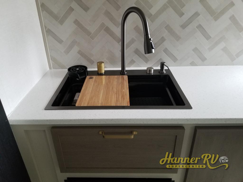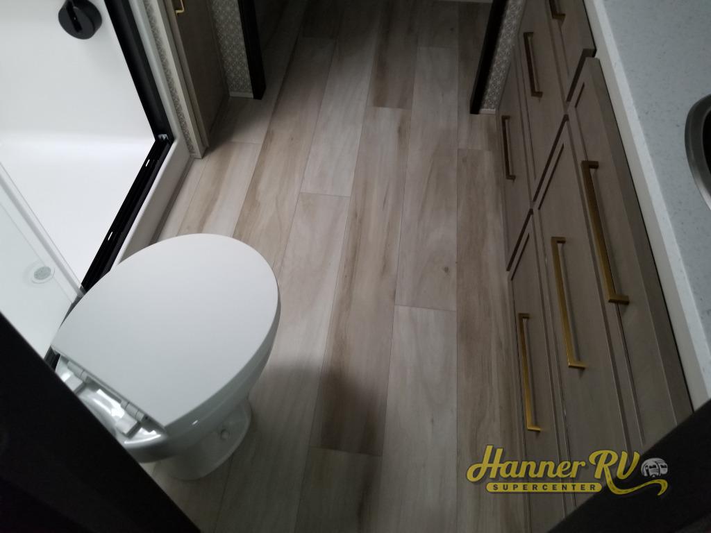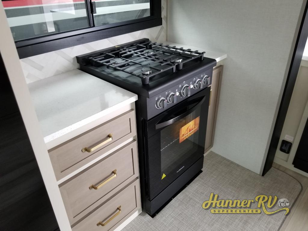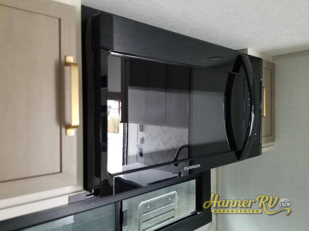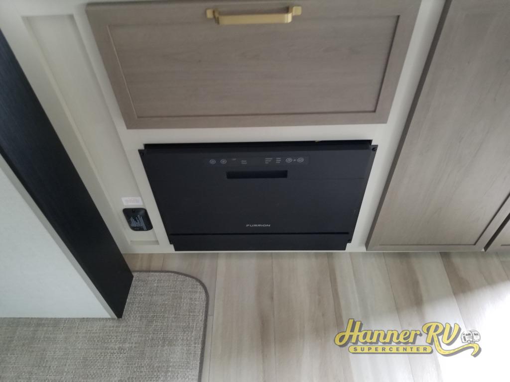 One look at this fifth wheel and you'll be sold! You can wake up each morning in the master bedroom that includes a custom king bed and a dresser with an ottoman. The front full bath has two bath sinks so you both can get ready at once, and you're going to love the walk-in wardrobe with a wrap-around hanging rod. A half bath includes a floating shelf with a hanging rod plus washer/dryer prep, giving you the option to make this a laundry room! The back of this unit is where you can cook meals with full kitchen amenities, dine at the kitchen island with four chairs, and relax on the theater seating and tri-fold sofa. A 50" TV and fireplace is also found here, complete with hidden storage behind for board games, movies, and snacks!