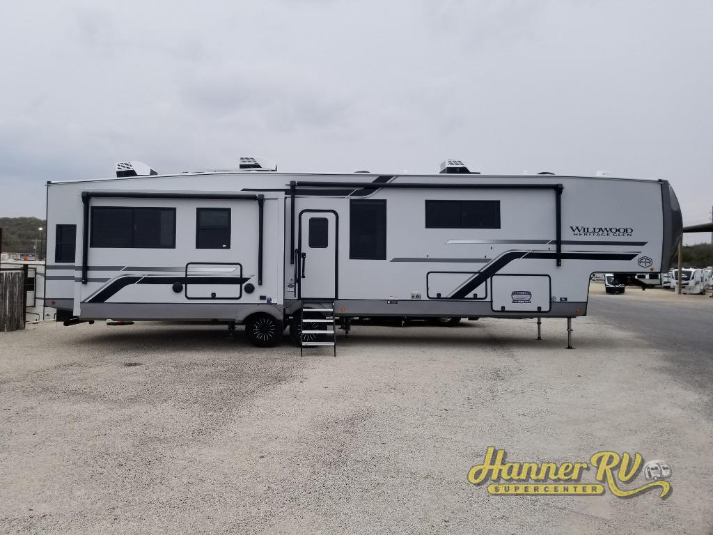 With any Wildwood Heritage Glen fifth wheel by Forest River, the quality construction, attention to detail and design along with a bright and welcoming interior allows you to relax in comfort. You'll love the high-end solid surface countertops included in the Elevated Value Package, along with a JBL sound system, full-length barreled ceilings, and an ultimate interior lighting upgrade. The included Expedition Package features an Accesibelly underbelly panel with 12V tank heaters, nitrogen-filled tires with aluminum rims, and a spacious 30" wide main entry door with a window. The Lippert On-The-Go ladder prep and back-up camera prep let you customize your fifth wheel even more, and the LED awning, front cap, marker and taillights will make it easier than ever to set up camp!