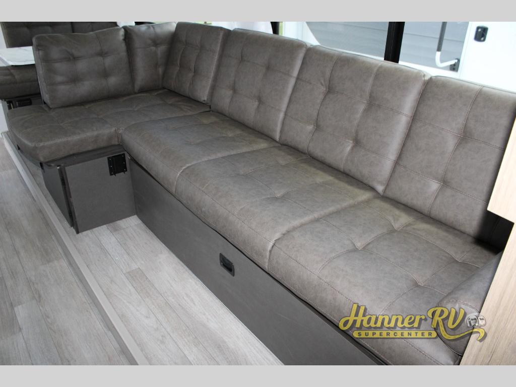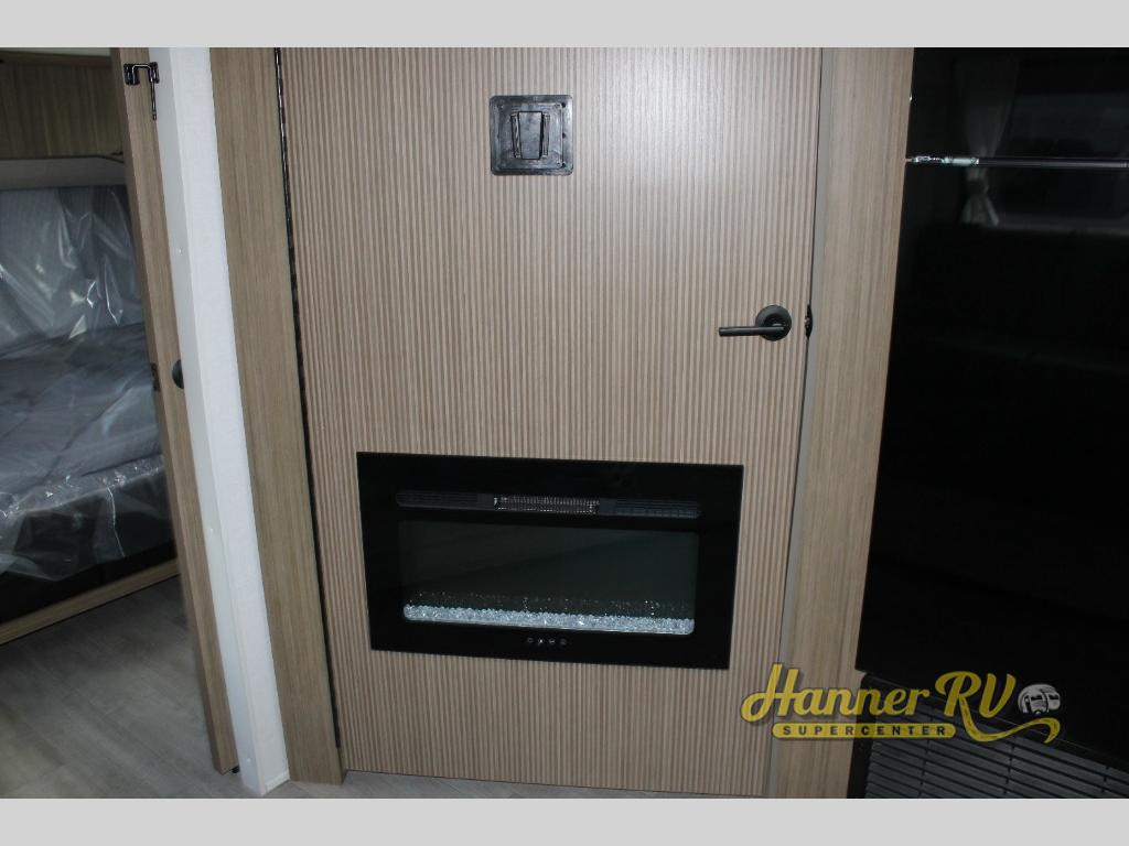 You're sure to make camping memories in this spacious travel trailer! You can easily sleep eight people each night thanks to the double-size bunks, the custom king bed with Versa Tilt in the front bedroom plus the Versa-Lounge within the large slide out! The full kitchen will let you make meals each day, and you'll appreciate the hidden pantry with shelves behind the fireplace. There is also a booth dinette where you can dine together or play a game of cards after dinner is cleaned up, or you may just find yourselves outdoors under the 16' awning. And don't overlook the full bath, complete with a tub/shower that will make bath time easier if you have little ones.