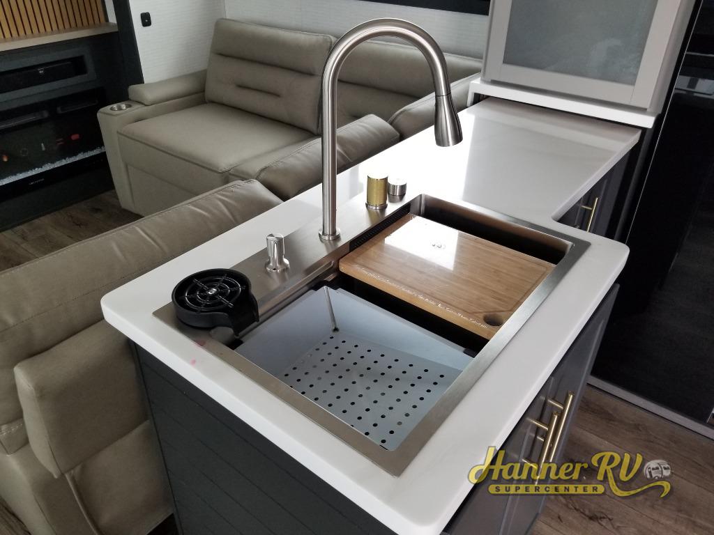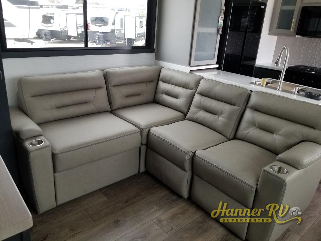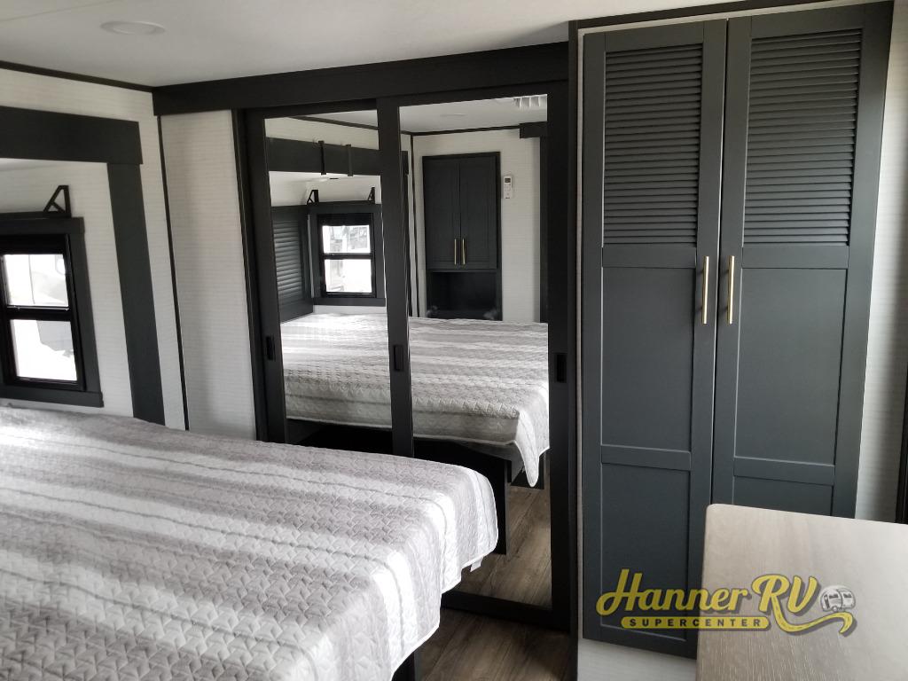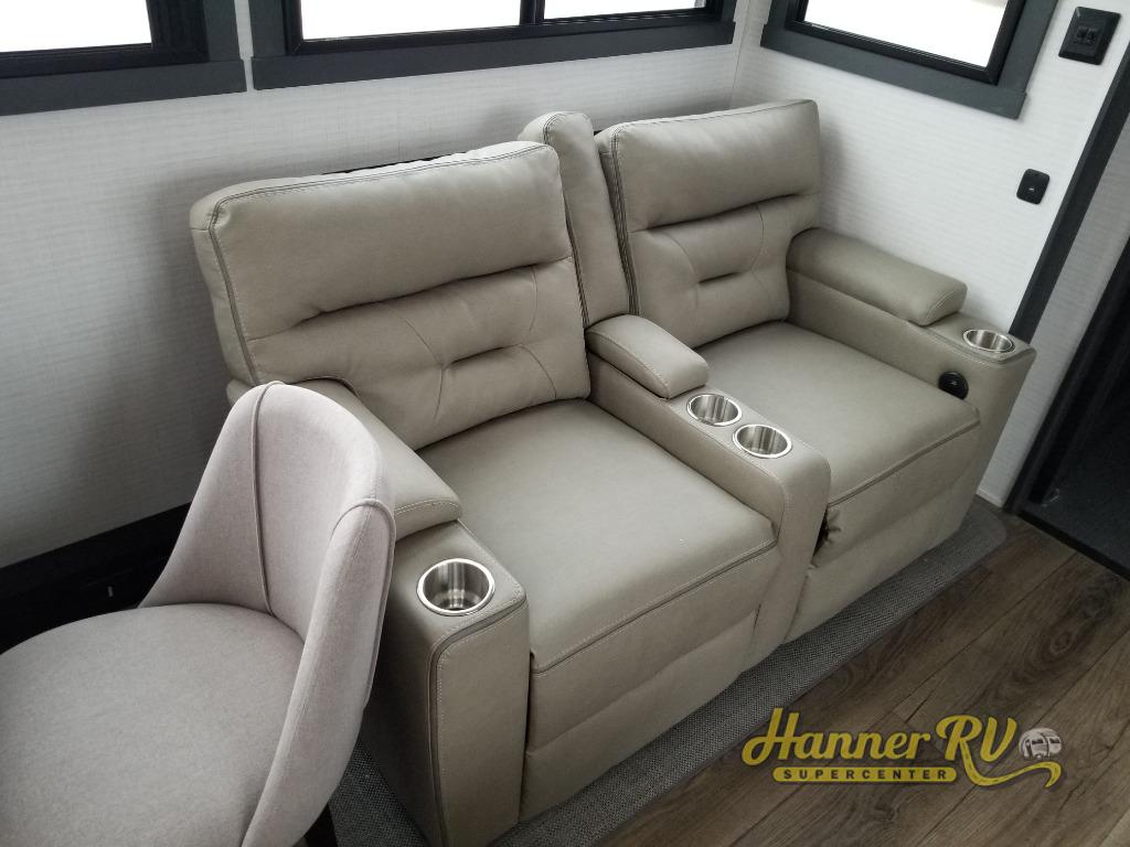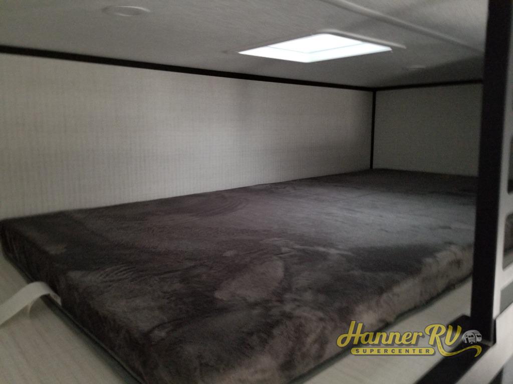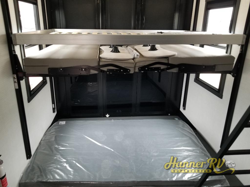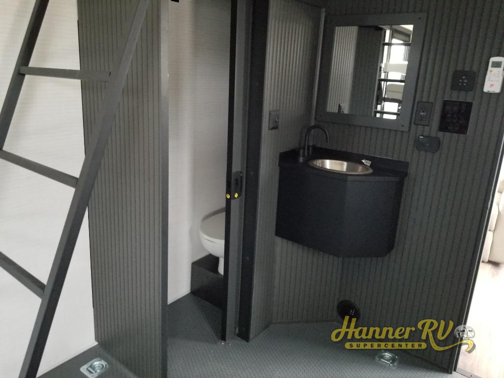 When you're ready to kick up some mud, hitch this toy hauler up and head out! You can set up the patio deck once your toys are removed from the 14' separate garage and relax with a cold drink. You'll find seating space on the Sit N Sleep roll-over sofas with a removable dinette table in between, and the Sleep N Store electric queen bed will provide sleeping space for your guests. There is also a loft and a half bath for even more convenience. Head through the garage glass sliding doors to the living area with an L-shaped sofa and theater seating or start lunch in the middle kitchen with ample counter space. There is even a free-standing table and chairs like you would find at home. The full bath up front lets you clean up after a trail ride and the front private bedroom will have you feeling right at home. With a 66" x 80" king bed slide out, along with a large front wardrobe with washer and dryer prep, plus a dresser and TV backer if you want to add your own TV.