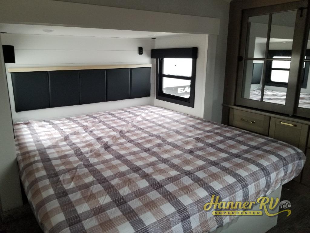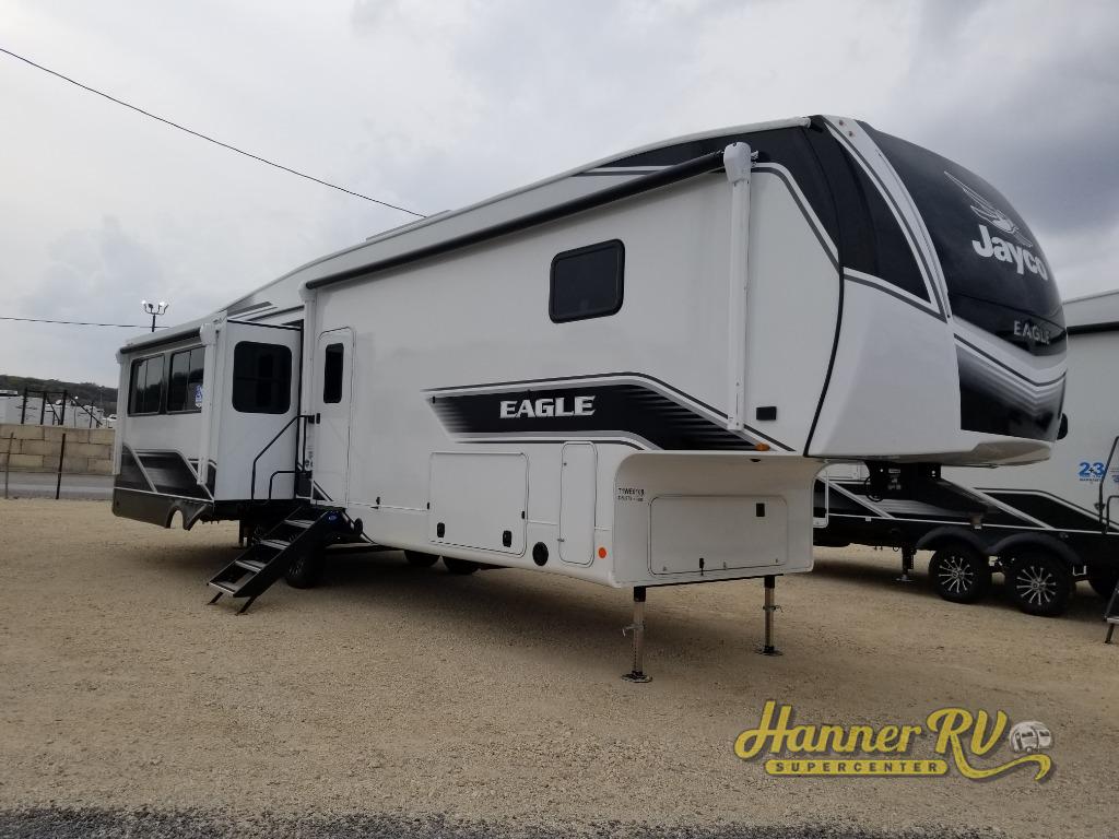 With any Eagle fifth wheel by Jayco you will appreciate durable construction materials, like the Magnum Truss Roof and the Stronghold VBL laminated walls. The JAYCOMMAND Smart RV system puts you in control of your RV's functions, and the 5 Star Handling Package will provide smooth towing from home to camp. Each model features Climate Shield zero-degree tested weather protection and the industry-exclusive HELIX cooling system that features two 15,000 BTU Whisper Quiet A/C's to keep you comfortable year around. Some of the exterior conveniences you are sure to love are the pass-through storage with Slam-Latch baggage doors and an automotive style front cap with max turn radius. The Eagle fifth wheels are designed to make you feel at home with solid hardwood slide fascia, residential vinyl flooring throughout, 100% no floor vents, and blackout roller shades with reflective side throughout for added privacy and insulation.