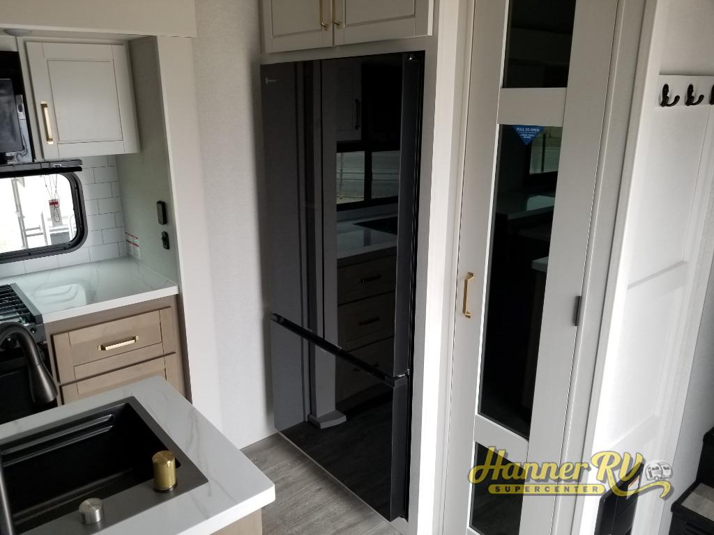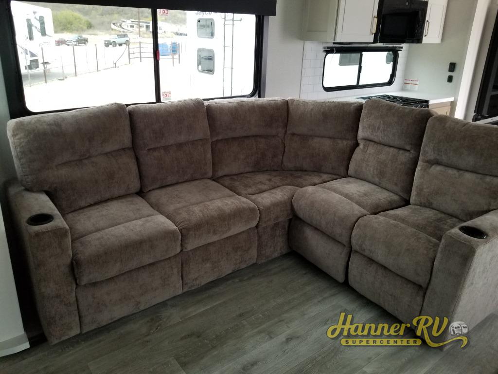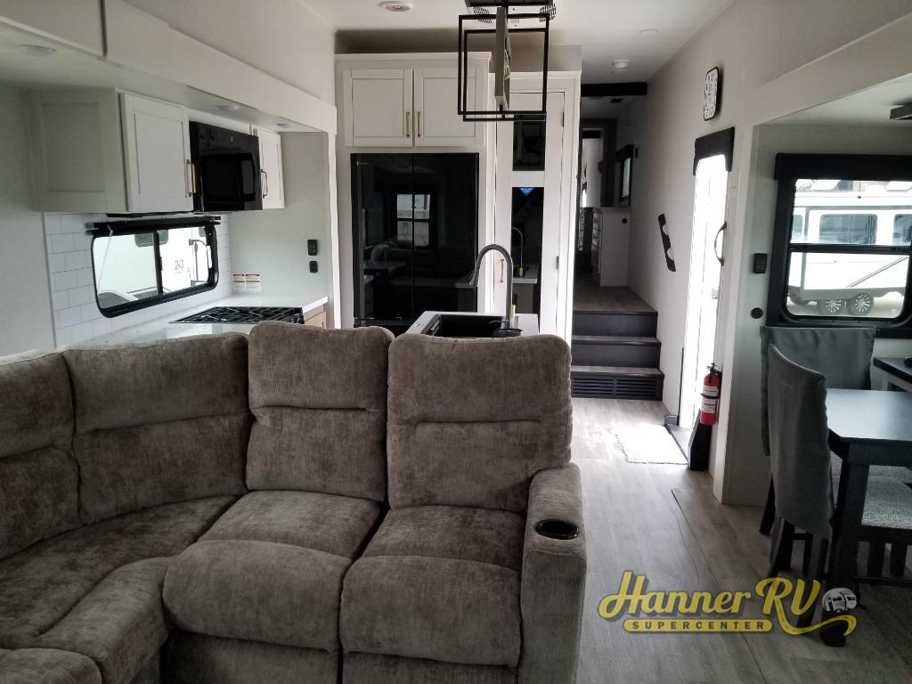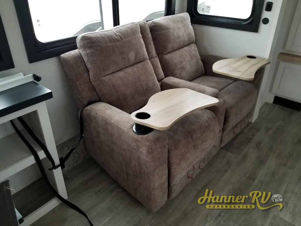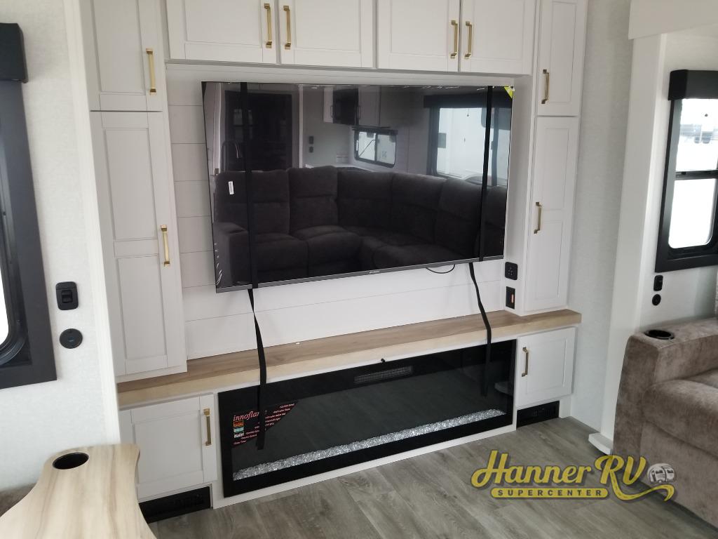 It will be so easy to enjoy time in this spacious fifth wheel! The rear living area includes an entertainment center with a fireplace across from the L-shaped sofa for movie nights. There is also a theater sofa with cup holders plus a roll-top dinette with two chairs to dine at. The chef of your group will love the generous counter space in the middle kitchen, and there is a large pantry to keep food stocked. Heading up front, you'll find the spacious bathroom that includes a shower with a seat, and the front private bedroom with a king bed slide out. There is also a chest with a TV, front shelves with drawers, plus washer and dryer prep!