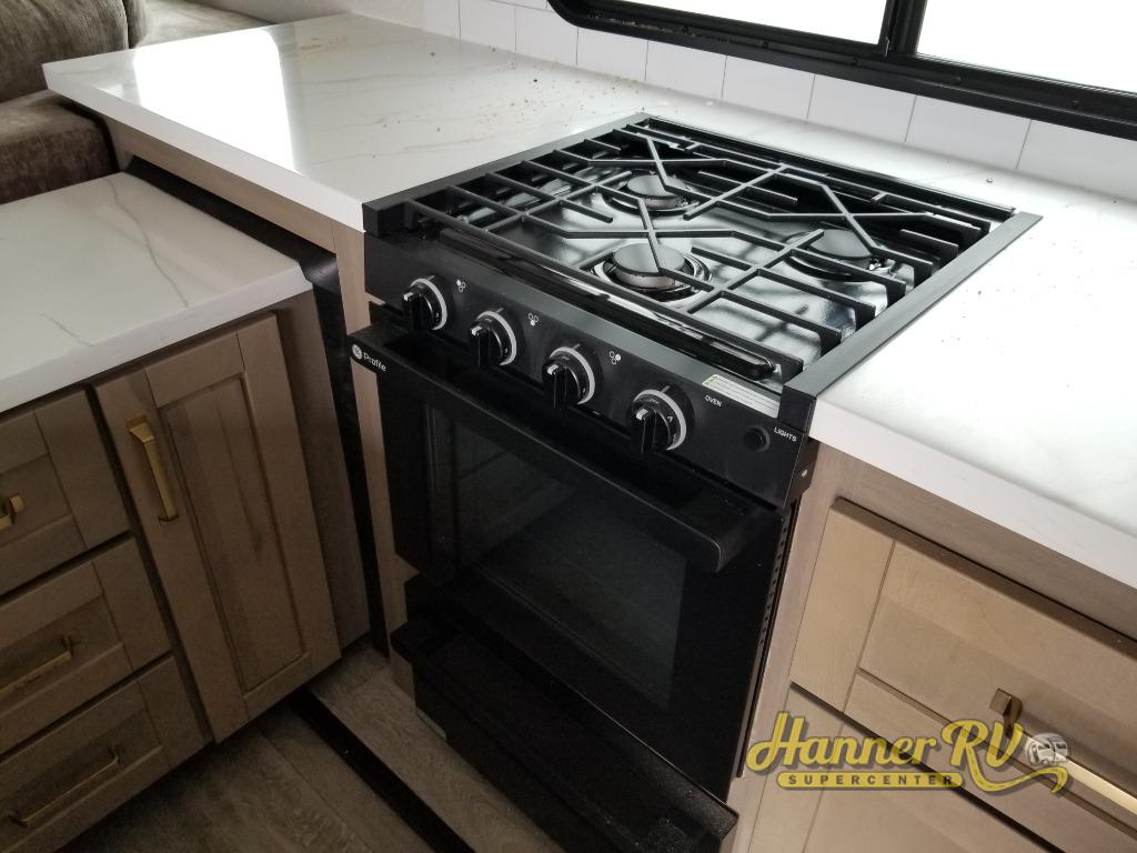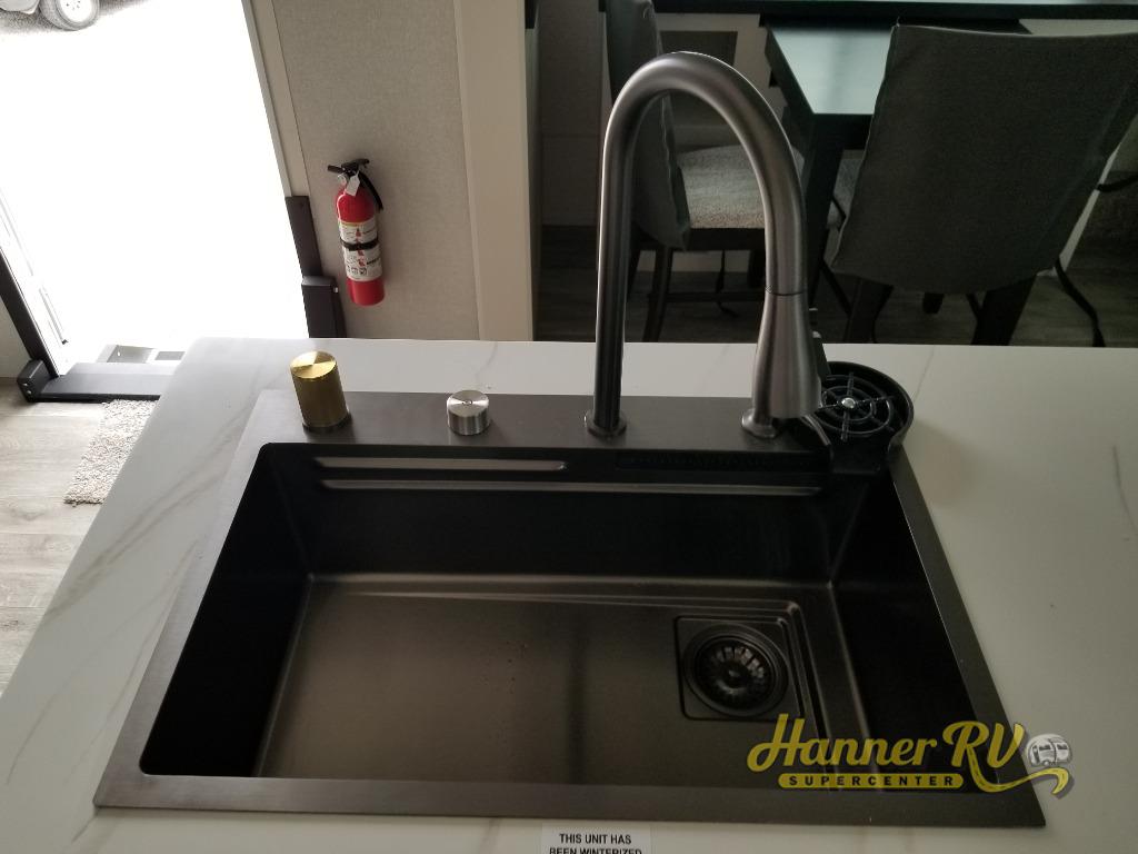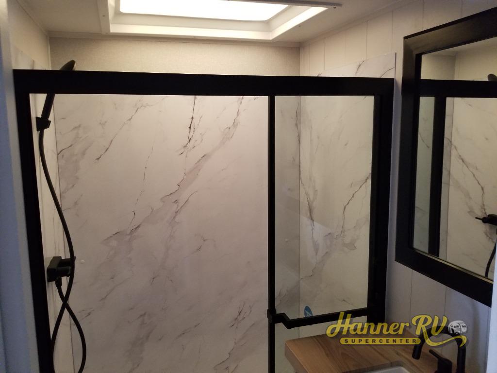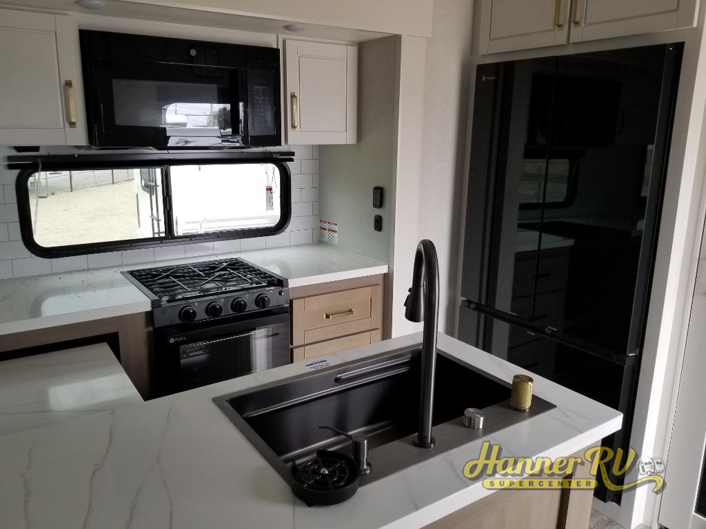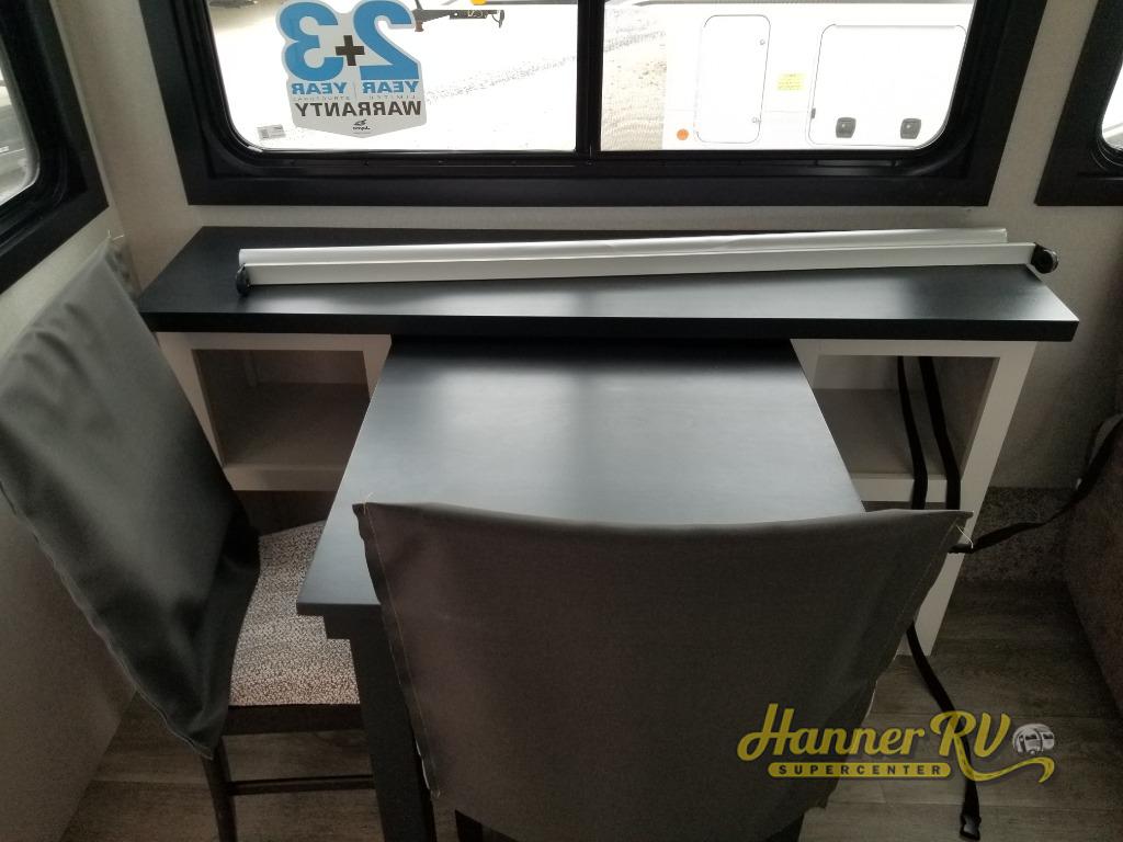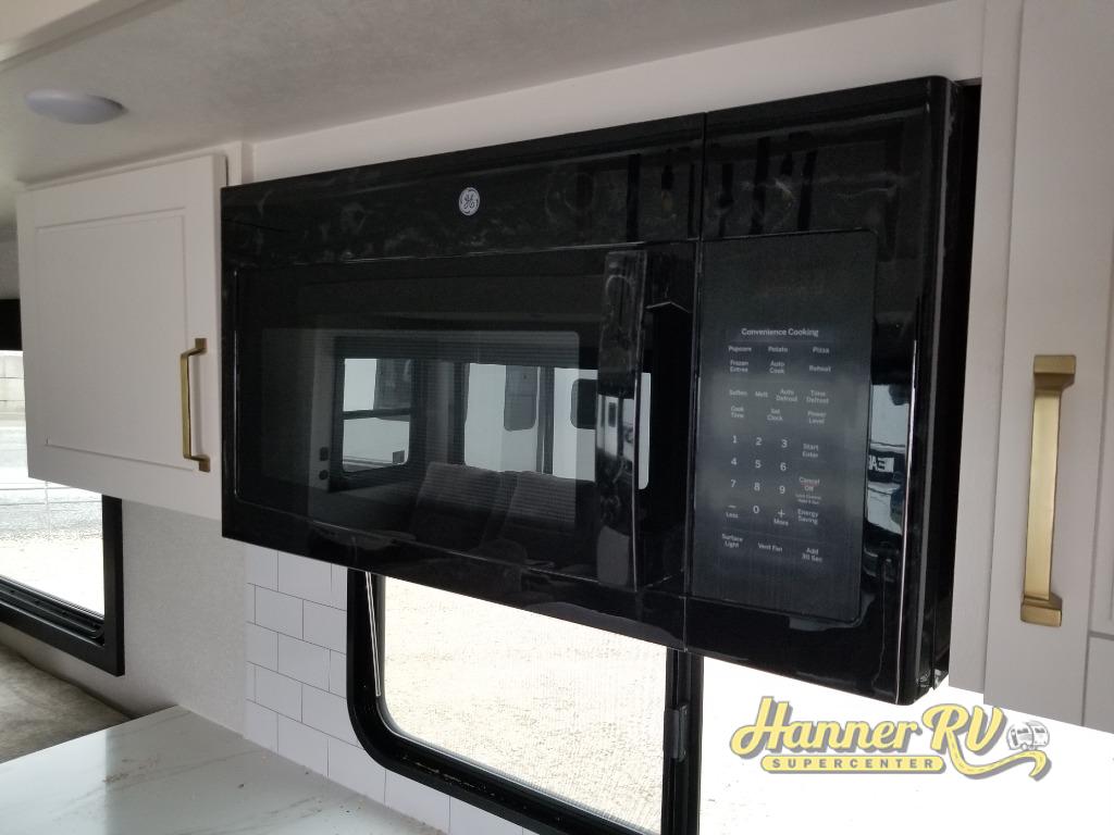 It will be so easy to enjoy time in this spacious fifth wheel! The rear living area includes an entertainment center with a fireplace across from the L-shaped sofa for movie nights. There is also a theater sofa with cup holders plus a roll-top dinette with two chairs to dine at. The chef of your group will love the generous counter space in the middle kitchen, and there is a large pantry to keep food stocked. Heading up front, you'll find the spacious bathroom that includes a shower with a seat, and the front private bedroom with a king bed slide out. There is also a chest with a TV, front shelves with drawers, plus washer and dryer prep!