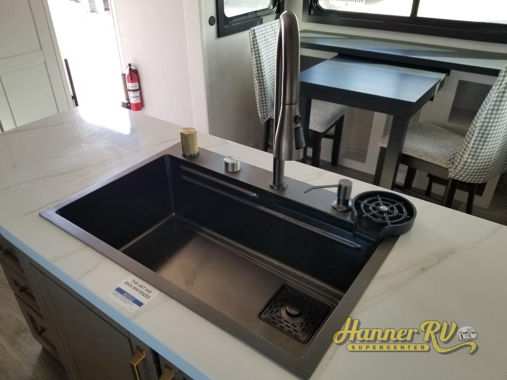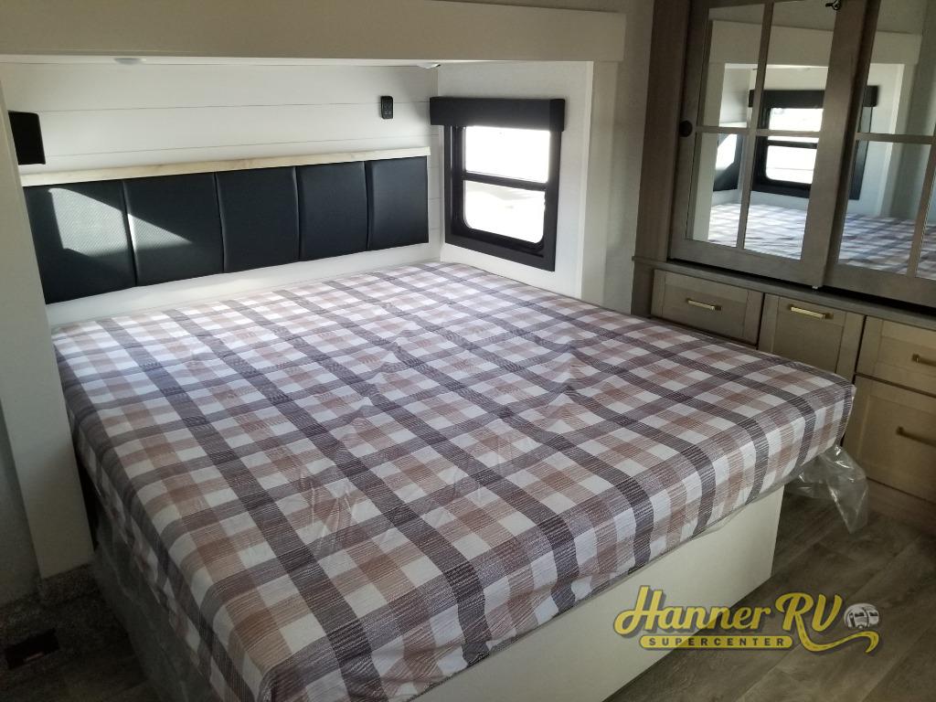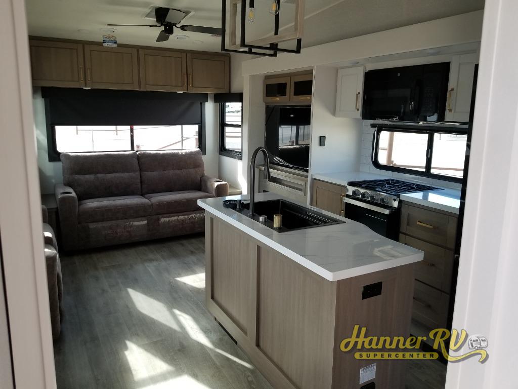 This fifth wheel with four slides is one your whole crew will love! There is a middle bedroom/den with a tri-fold sofa and a desk, allowing this room to become an office if you need it. The loft above this room will be a big hit with the little ones, and the full bath is centrally located so everyone can use it easily. You will have the front private bedroom all to yourselves with a king bed slide out, a chest with TV prep, plus washer and dryer prep in the walk-in closet. The main living area includes everything you need to relax in comfort, like the theater seats, tri-fold sofa, and entertainment center with a fireplace. The chef will enjoy the extra counter space provided by the kitchen island, and there is plenty of storage with the pantry, hutch, and 16 cu. ft. 12V refrigerator. This model even has an outside kitchen, two power awnings, and outside storage for all your gear!