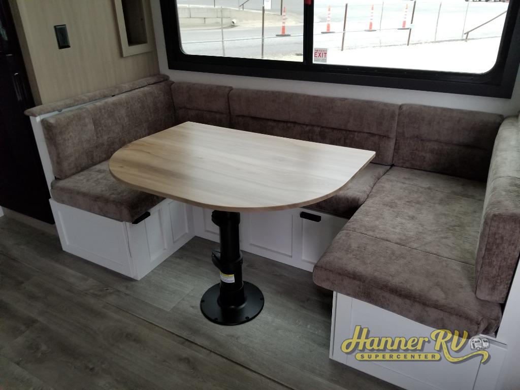 This fifth wheel is not only packed with amenities, but it can sleep up to eight people each night for fun camping trips! The rear private bunkhouse includes bunk beds plus a third bunk above a jack-knife sofa, and there is a bike storage door here so you can easily pack in gear. You can claim the front private bedroom all to yourselves with an Olympic bed, a wardrobe slide plus a second wardrobe with washer and dryer prep. Everyone can come together in the combined kitchen and living room that features a U-shaped dinette across from the TV and a theater seat for added comfort!