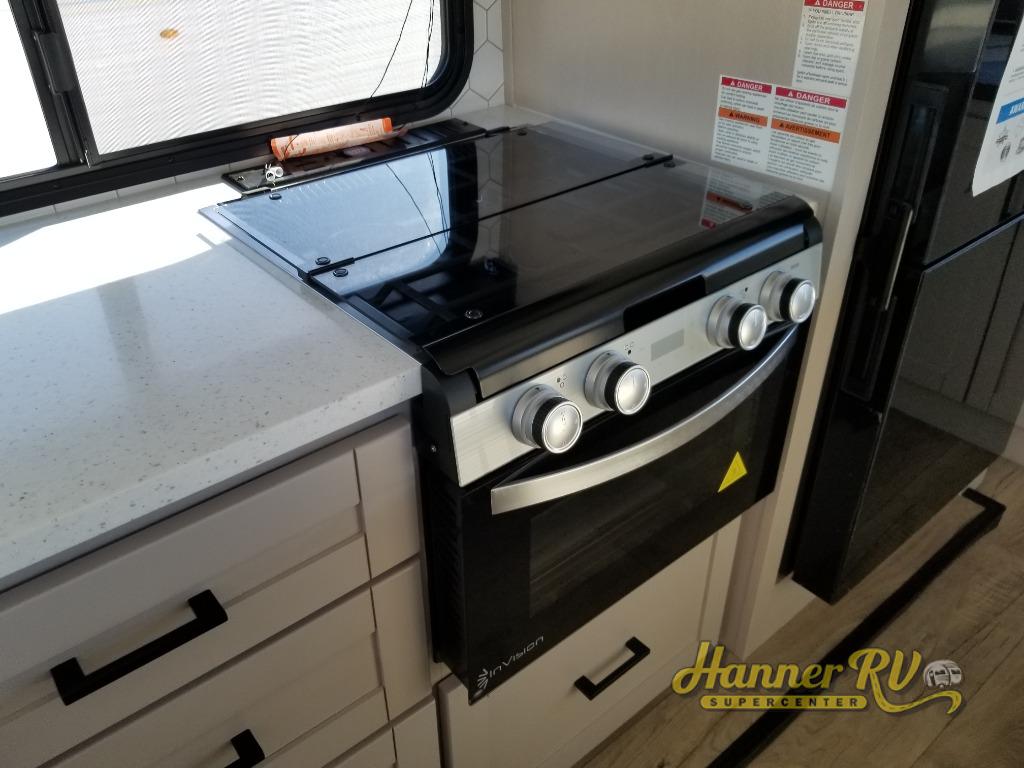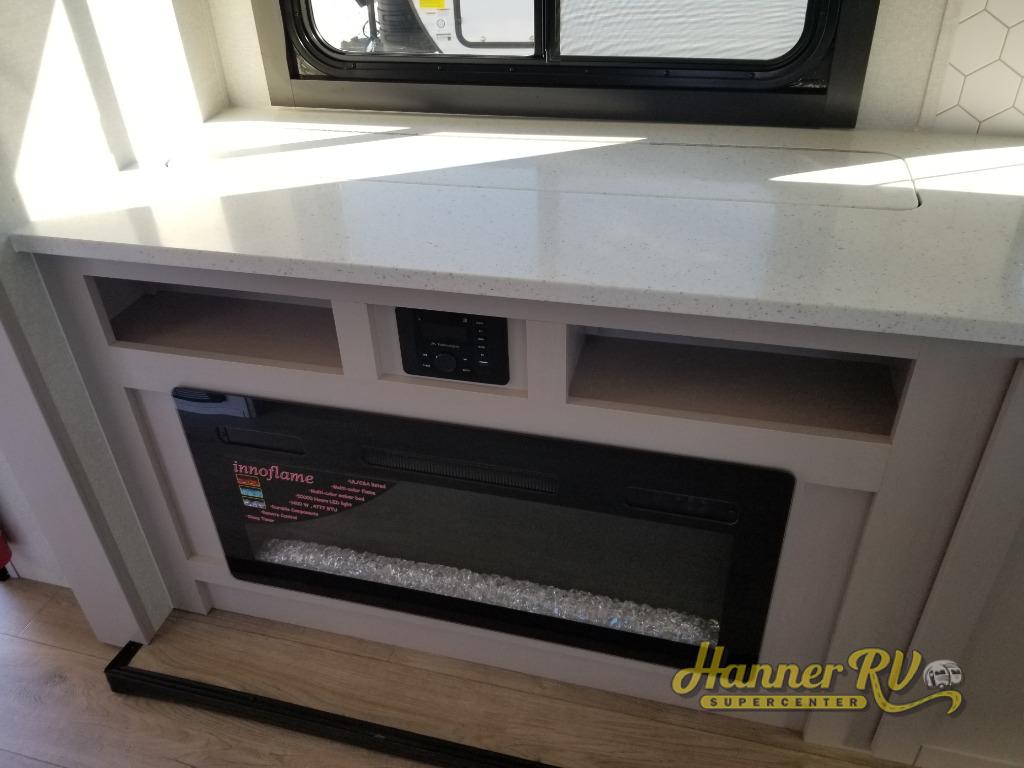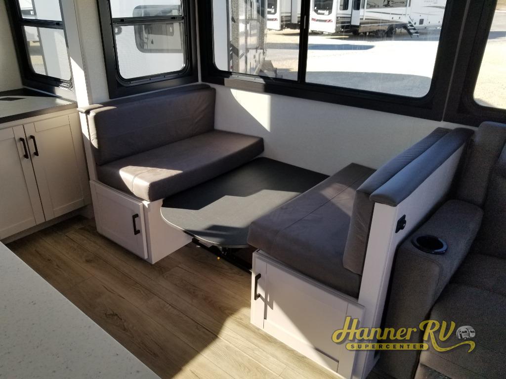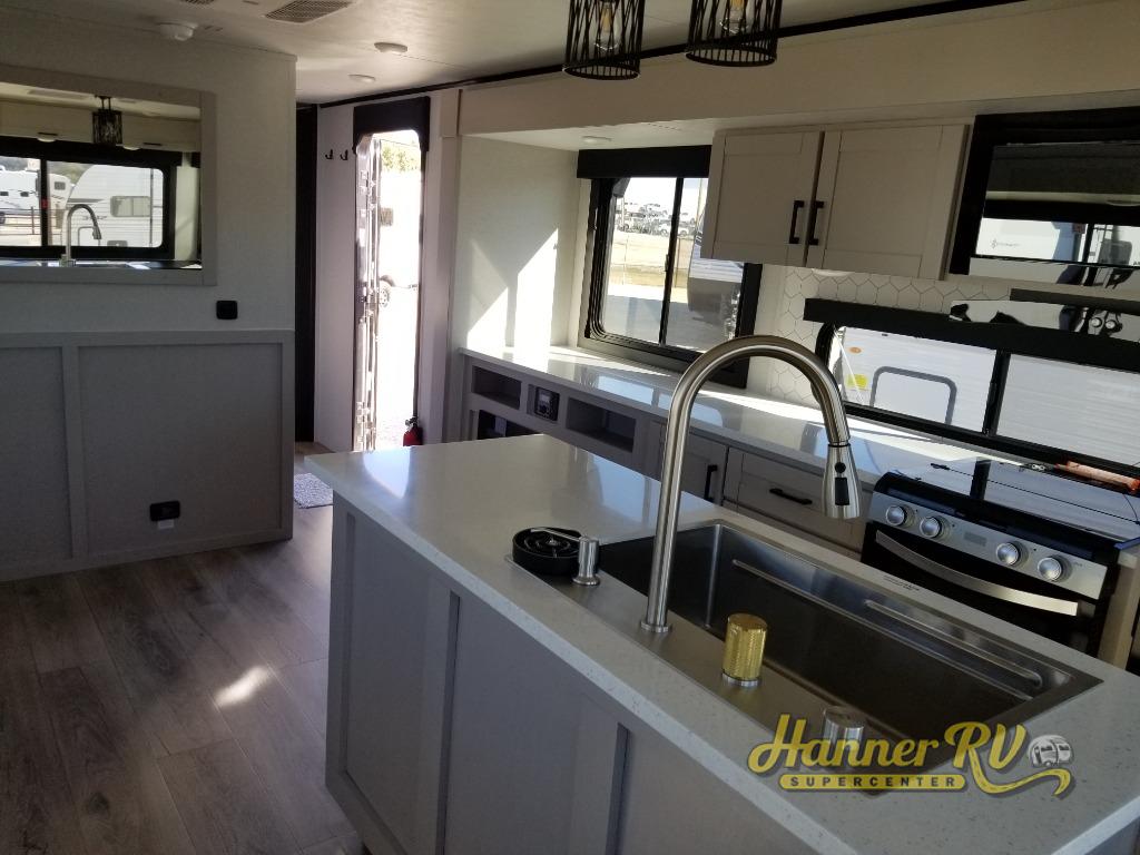Perfect for your trips or weekend getaways, this travel trailer is the one! You will find a rear desk with an ottoman plus overhead storage if you plan to work while you're away from home. The dual opposing slides in the combined kitchen and living area will create an open floorplan, and the kitchen island will provide the chef of your group with more counter space. There is a tri-fold sofa and booth dinette that double as seating and sleeping space, and the full bath onboard will keep everyone clean. Don't overlook the front private bedroom with a queen bed and plenty of storage space for your belongings!