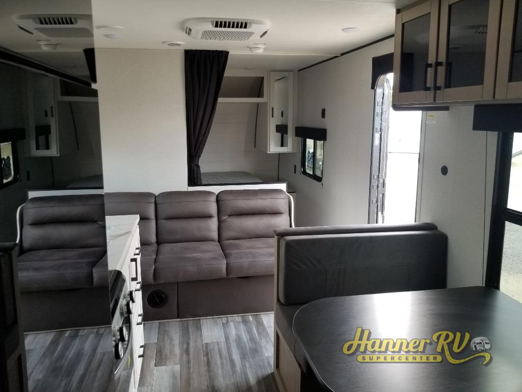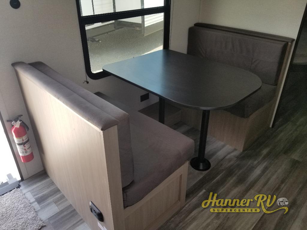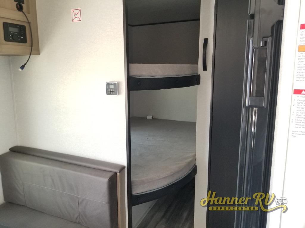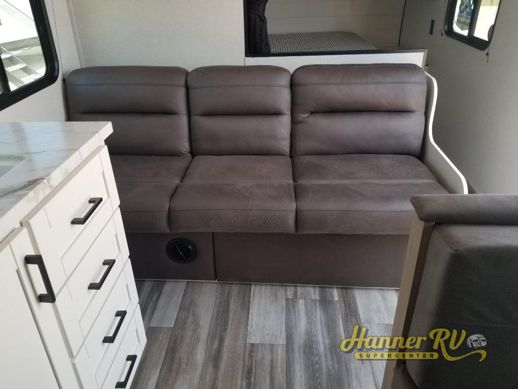 You can comfortably sleep eight to ten people in this trailer thanks to the double-size bunks, the RV queen bed in the front bedroom, plus the booth dinette and jack-knife sofa in the main living area! The chef of your crew will have a three burner cooktop and microwave oven to prepare meals, and everyone can store their favorite drinks in the 8 cu. ft. 12V refrigerator. The bathroom includes a shower and a toilet, with the sink just outside of this room so others can brush their teeth if one is taking a shower before bed. The outside storage will let you bring along fishing poles and the 16' power awning with LED lights will create a nice place to gather in the evenings!