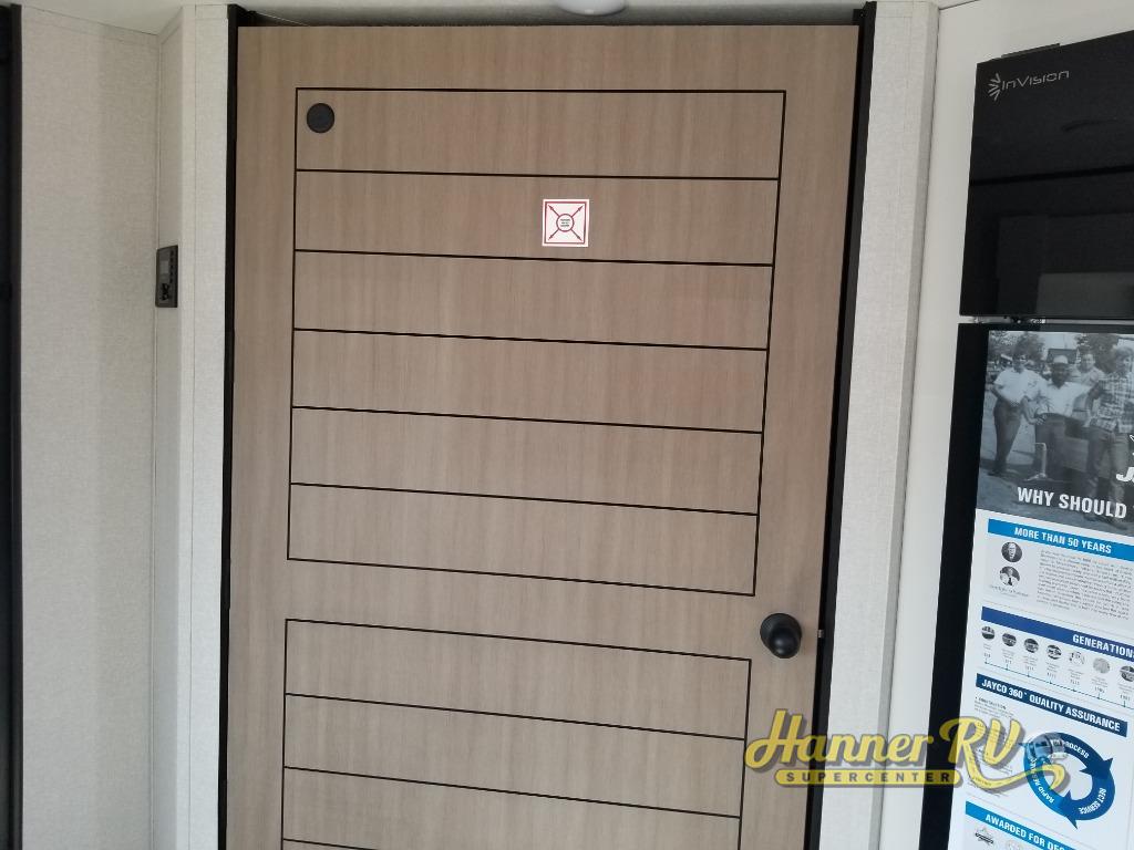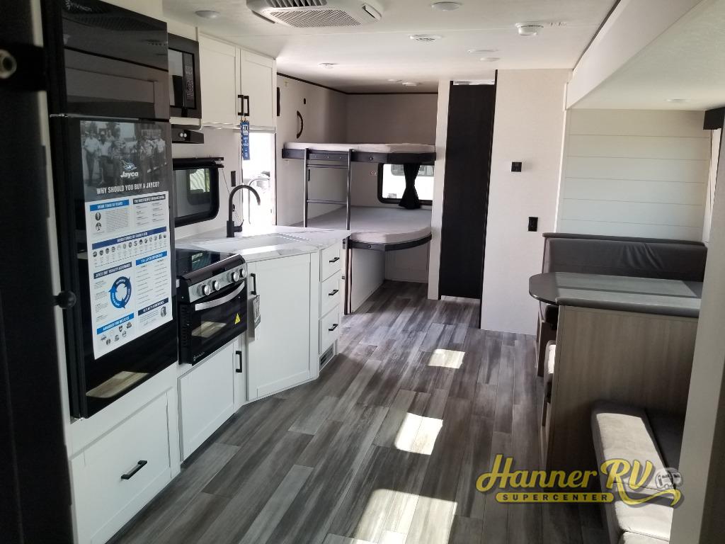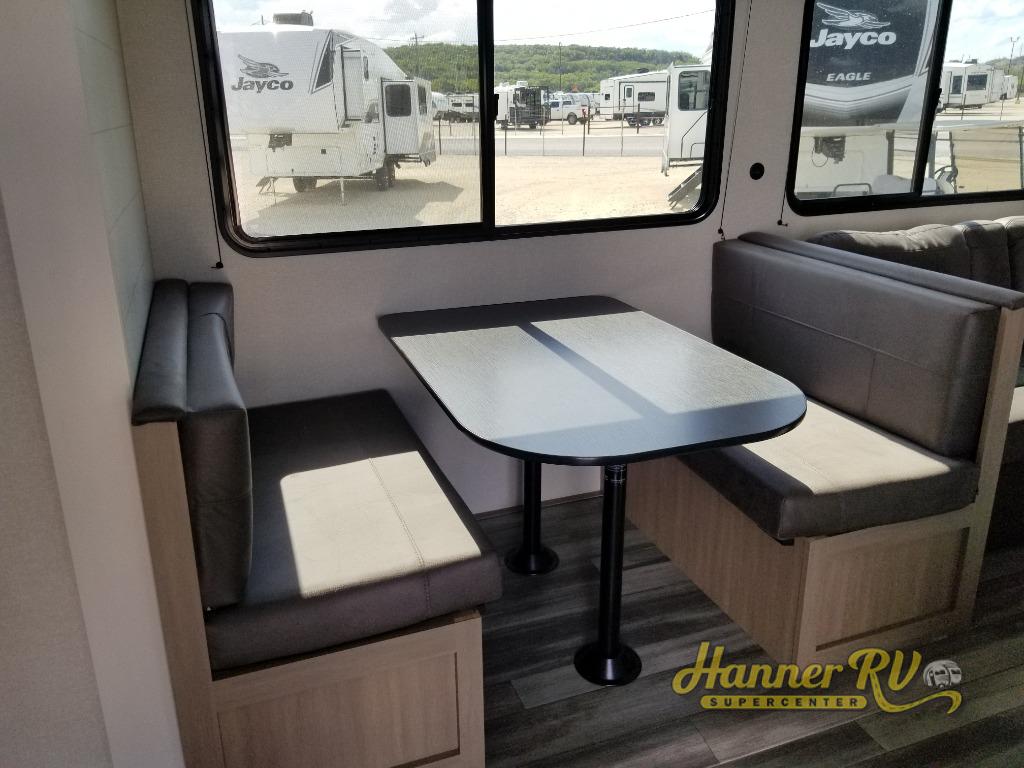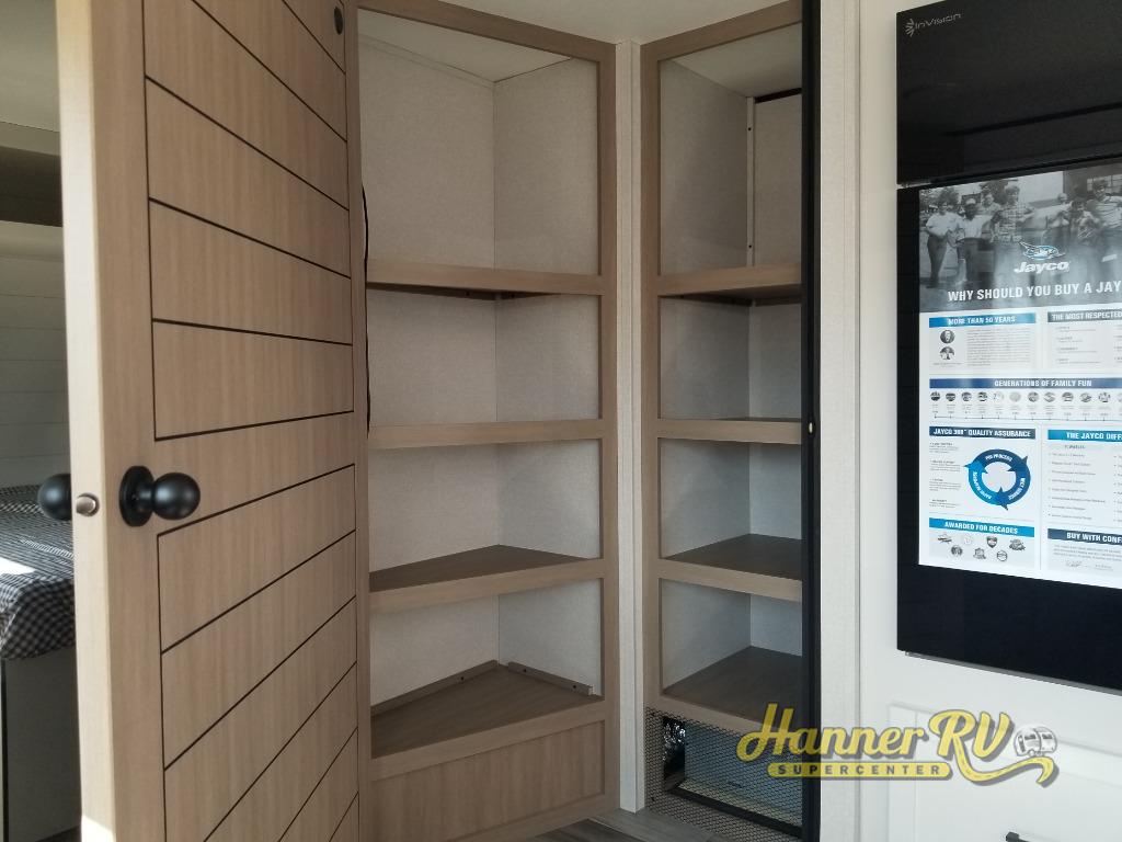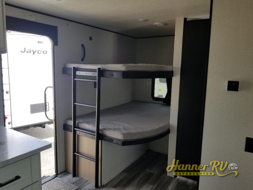 If space is what you're looking for in your next trailer, space is what you'll get this this Jay Flight SLX! The large slide houses the jack-knife sofa and booth dinette, and the added space here will provide everyone room to move about. The chef of your group will love cooking inside, or they can head outside to cook on the outdoor kitchen. Double-size bunks are sure to be a big hit with the little ones, and you'll love having your own space up front in the private bedroom. This unit includes ample storage space, including a hidden pantry with shelves, a bedroom closet plus dual bedside wardrobes, plus exterior storage for hiking or fishing gear!