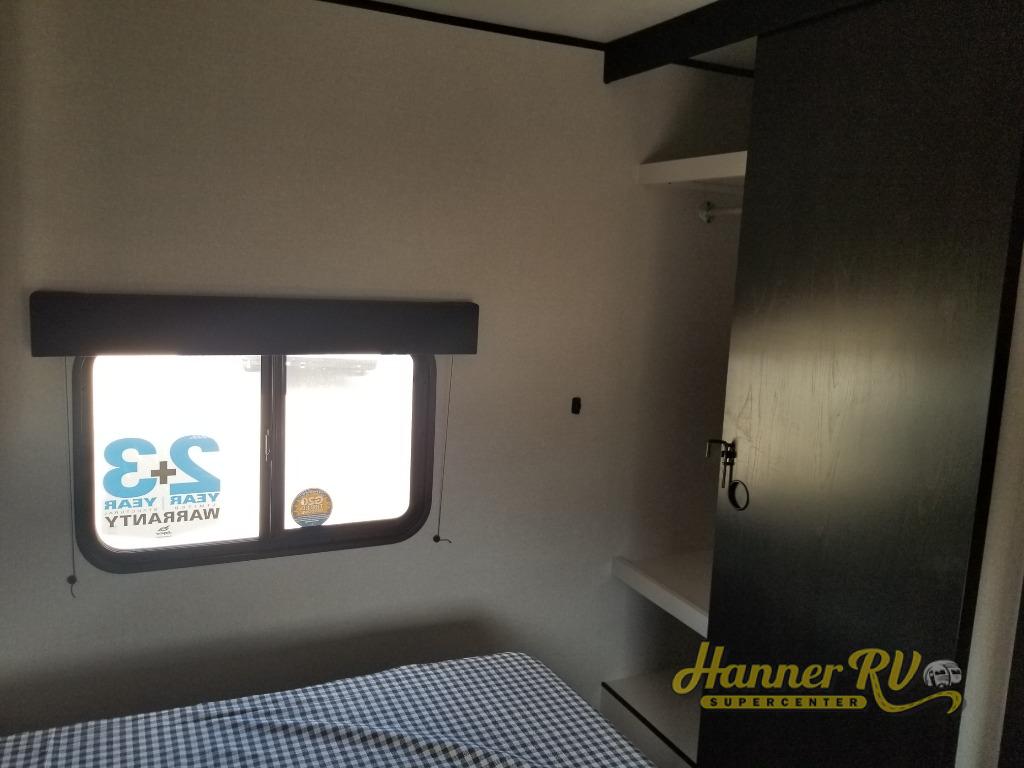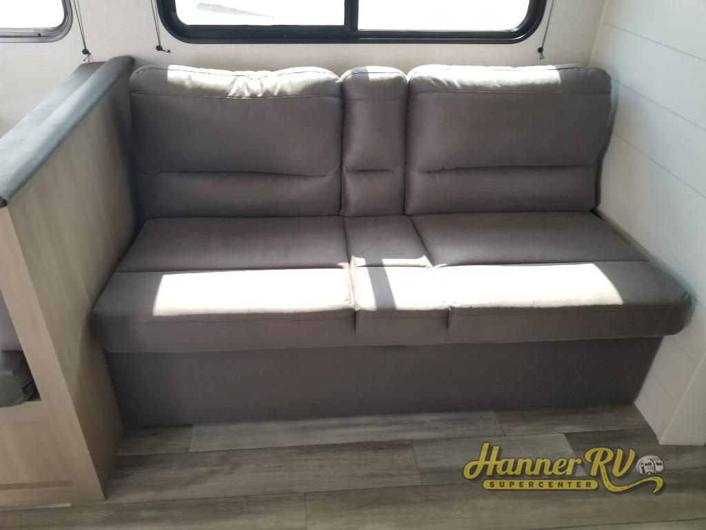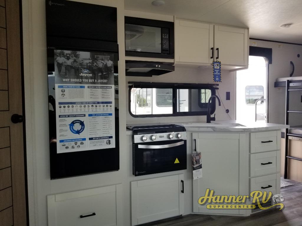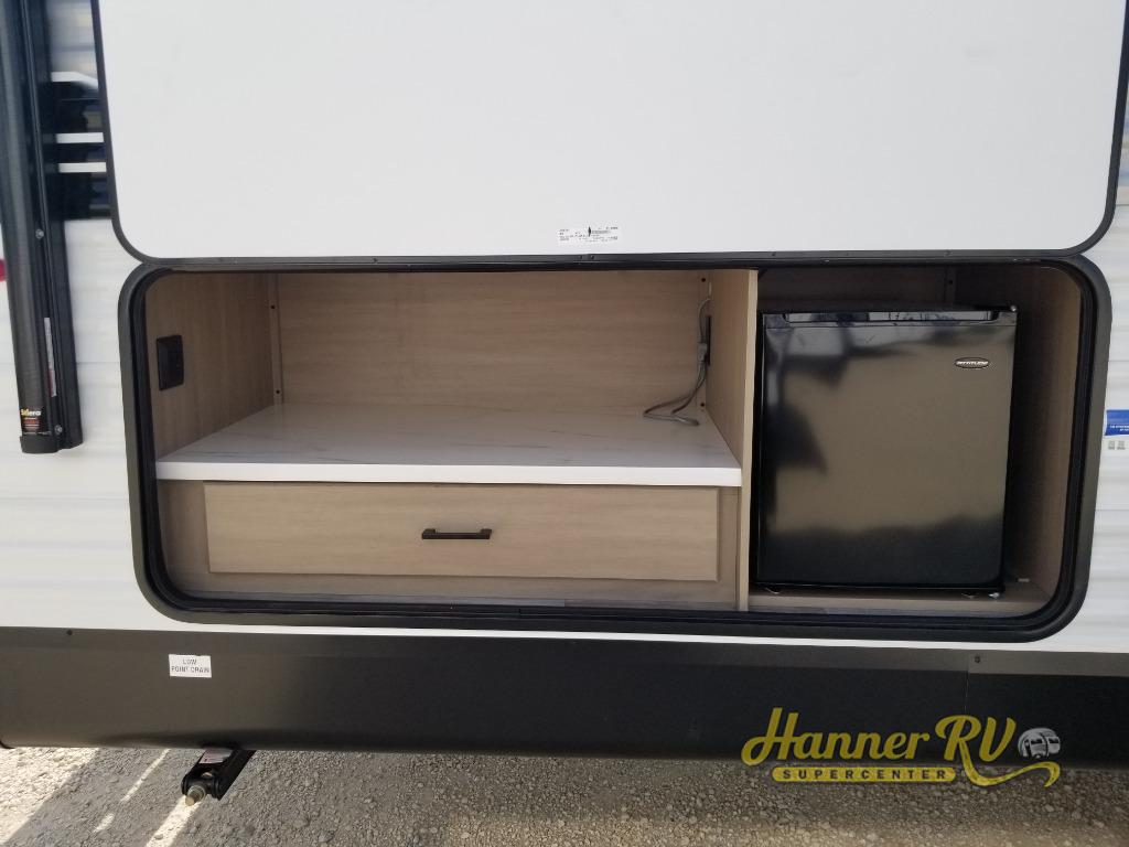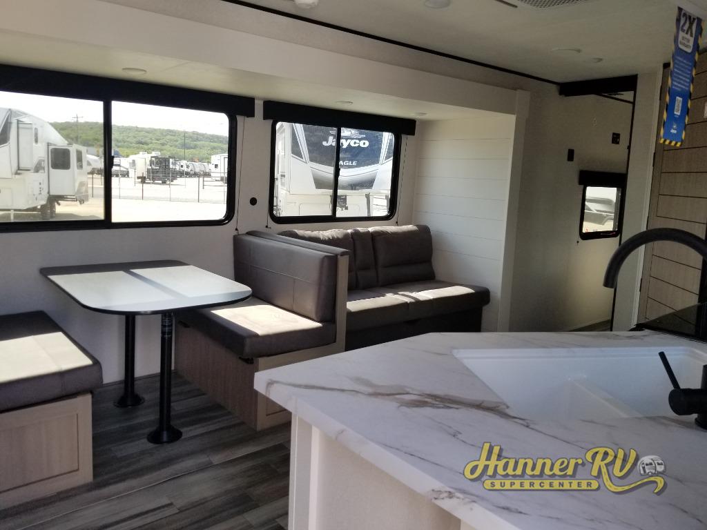 If space is what you're looking for in your next trailer, space is what you'll get this this Jay Flight SLX! The large slide houses the jack-knife sofa and booth dinette, and the added space here will provide everyone room to move about. The chef of your group will love cooking inside, or they can head outside to cook on the outdoor kitchen. Double-size bunks are sure to be a big hit with the little ones, and you'll love having your own space up front in the private bedroom. This unit includes ample storage space, including a hidden pantry with shelves, a bedroom closet plus dual bedside wardrobes, plus exterior storage for hiking or fishing gear!