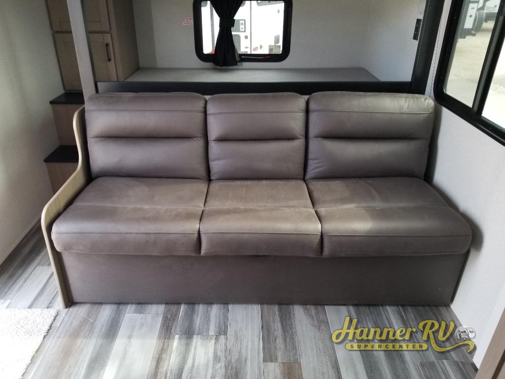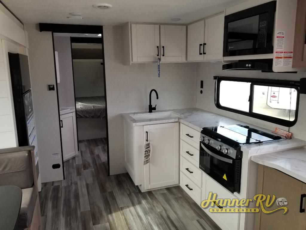It's time to ditch that old tent and upgrade to this spacious travel trailer! The littles ones or your guests will love the double-size bunks with steps in the back, while you take the front master bedroom. One of the dual entry doors is also found here for convenience, and the walk-through bath is easily accessible for everyone. A U-shaped dinette slide and jack-knife sofa in the main living area provide your crew with space to relax and dine together, and the fully equipped kitchen lets you cook up your best meals. This unit includes ample storage space, including additional kitchen storage, wardrobes, overhead cabinets, and exterior storage!