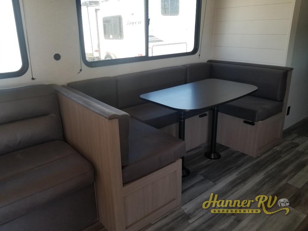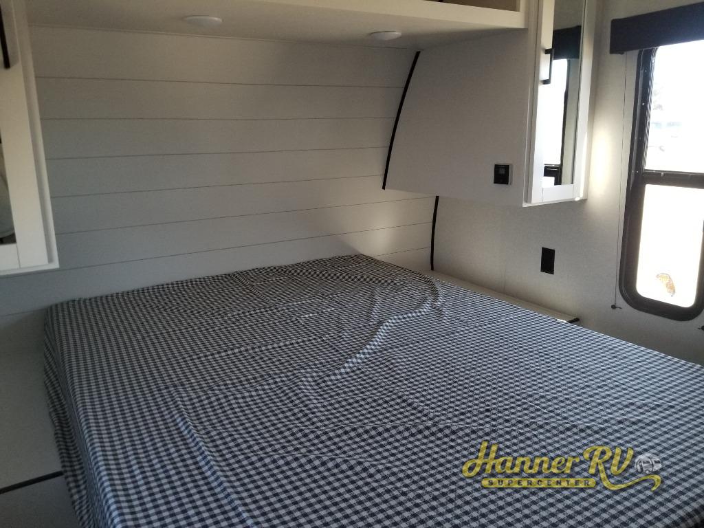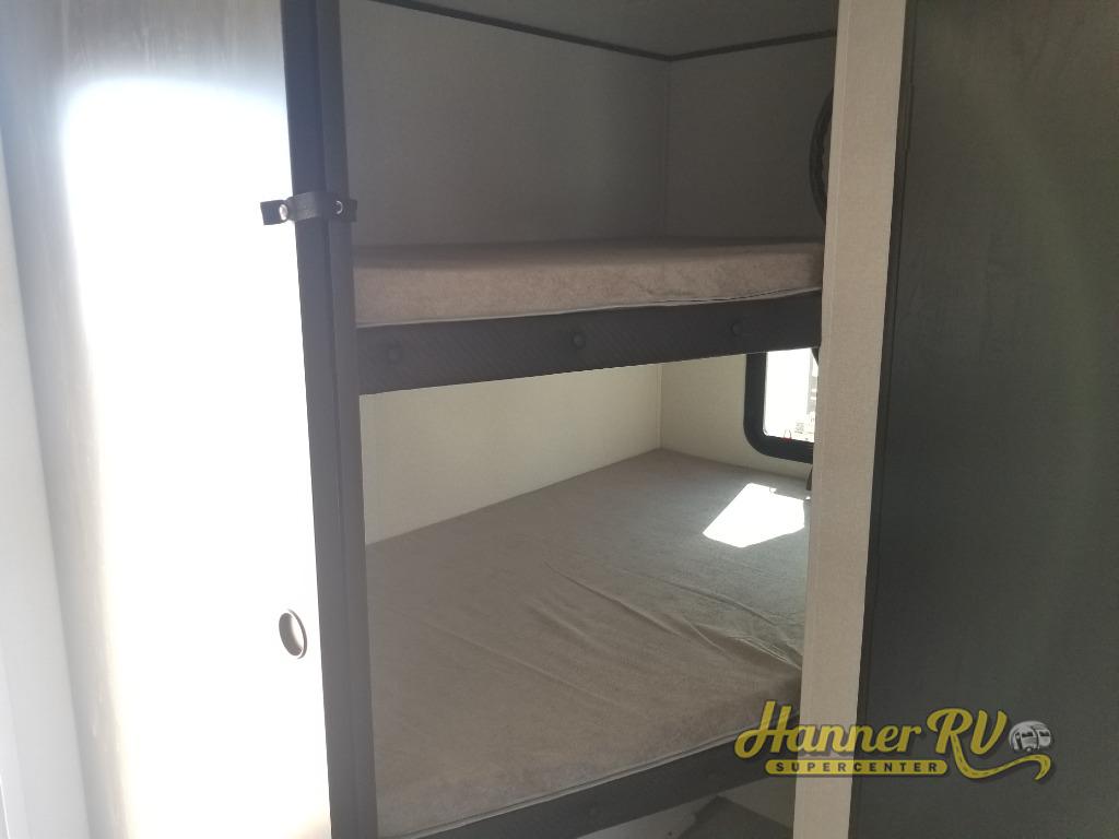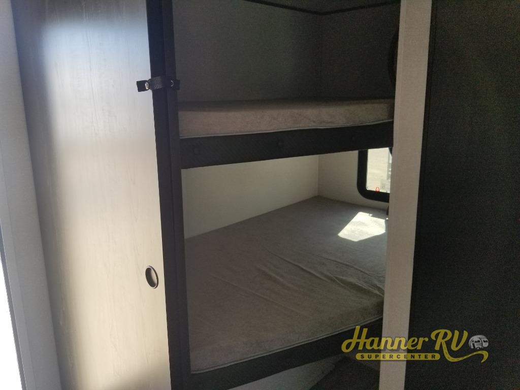 It's time to ditch that old tent and upgrade to this spacious travel trailer! The little ones or your guests will love the double-size bunks in the rear bunkhouse, along with a half bath and storage space for their things. You'll enjoy the front private bedroom all to yourselves with a queen bed and dual wardrobes, and the full bath is close by for easy nighttime use. A U-shaped dinette slide and sofa in the main living area provide your crew with space to relax and dine together, and the fully equipped kitchen lets you cook up your best meals. Outside, you'll find exterior storage, a 20' power awning, plus an outdoor kitchen to enjoy a sunrise breakfast!