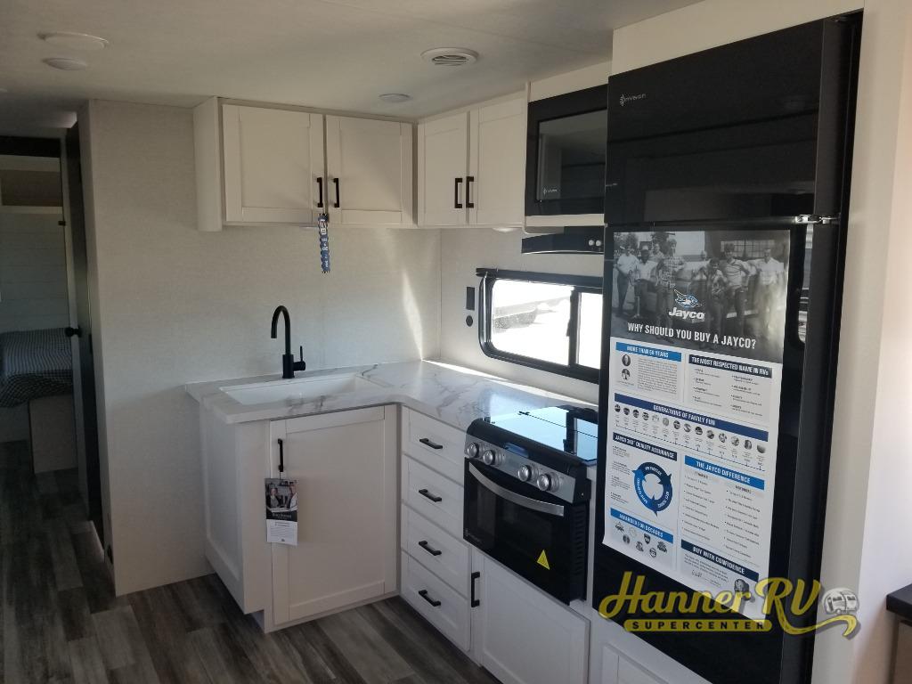 The Jayco Jay Flight SLX travel trailer is quite easy to own because it is lightweight for an easier towing experience. Built on a fully integrated A-frame with galvanized-steel, impact-resistant wheel wells, the Jay Flight SLX has quality at its very foundation. That quality continues on to the electric self-adjusting brakes, easy-lube hubs, Magnum Truss roof system, and LP quick connect. Some of what the mandatory Customer Value Package includes is backup camera prep, Keyed-Alike entry and baggage doors, and an on-demand tankless water heater.