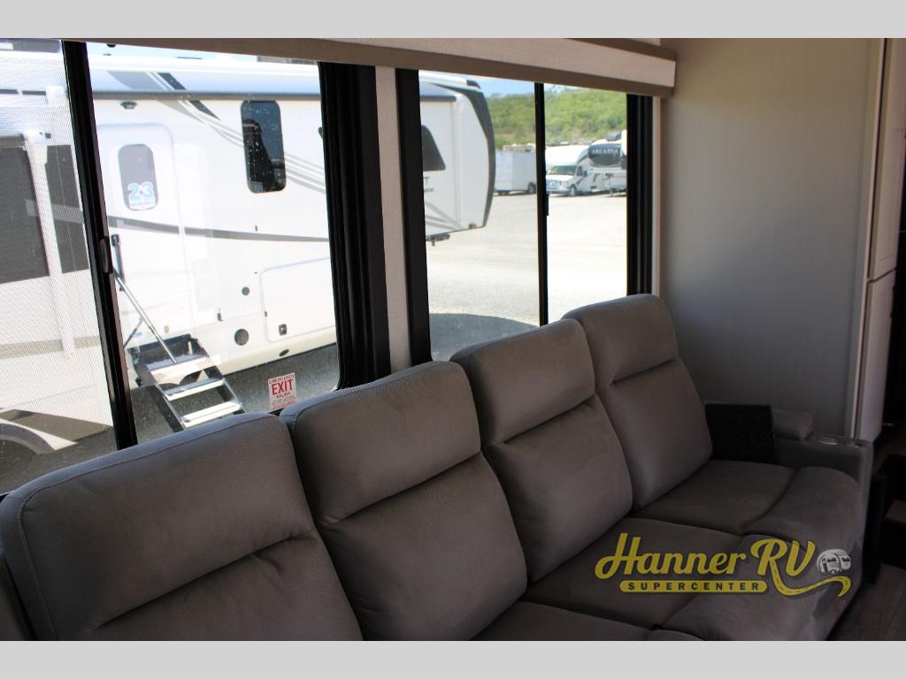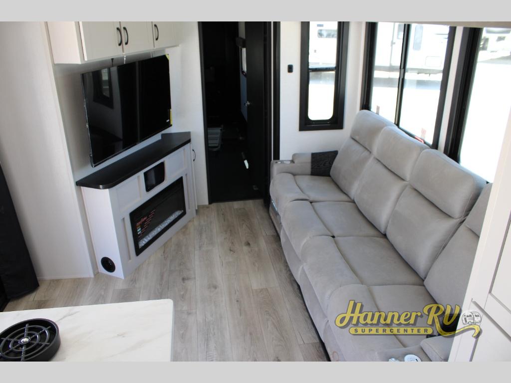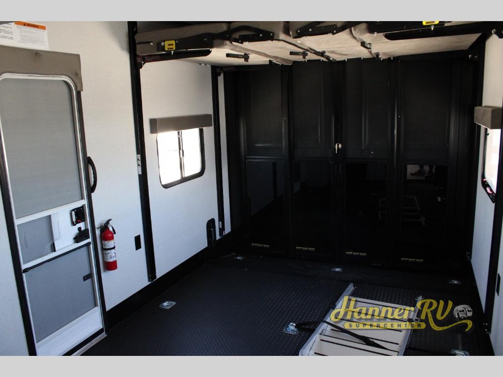 Get ready for outdoor adventures in this spacious toy hauler. Your guests will have the 13' separate garage area with its own half bath, a queen bed with rear convertible sofas, plus a loft for more sleeping or storage space. The main living area includes a large slide out for added space, and here you can relax on the sofa that sits across from the entertainment center with a 50" TV. The chef will love the U-shaped kitchen counter, 17 cu. ft. 12V refrigerator, and residential oven with a three burner cooktop. Up front, the private bedroom includes a king bed with a queen bed option, a slide out with dual wardrobes and a dresser, and quick access to the dual entry full bath! The exterior is just as accommodating with its 40" exterior TV, rear party deck and side patio party deck, and triple awnings for ample protection against the sun!