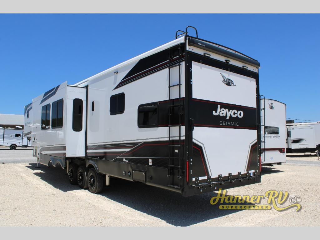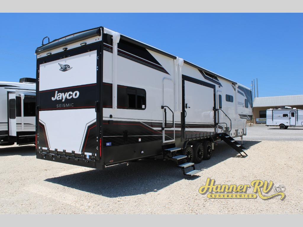 One look at the Seismic toy haulers by Jayco, and you'll never go back! Each model features a custom automotive-grade vinyl exterior graphics package, a painted fiberglass front cap with built-in LED lighting, and 102" wide-body structural steel I-beam construction. You'll find the pass-through storage with Slam-Latch baggage doors will make unpacking easier than ever, and the rear ramp door/patio with anti-slip, non-skid flooring will allow you to unload your toys with no trouble at all. These toy haulers feature a three seasons garage wall/doors, a 30 gallon fuel tank with a timer, and exterior marine-grade speakers to keep the party going. The Climate Shield zero degree tested weather protection includes a 35,000 BTU furnace, PEX plumbing, and a fully enclosed and heated underbelly so you can enjoy your adventures year around. And we haven't even touched on the interior luxuries you'll find, like solid hardwood cabinet doors, residential vinyl flooring made in the USA, night shades, and more!