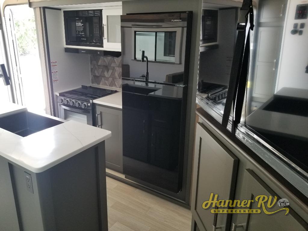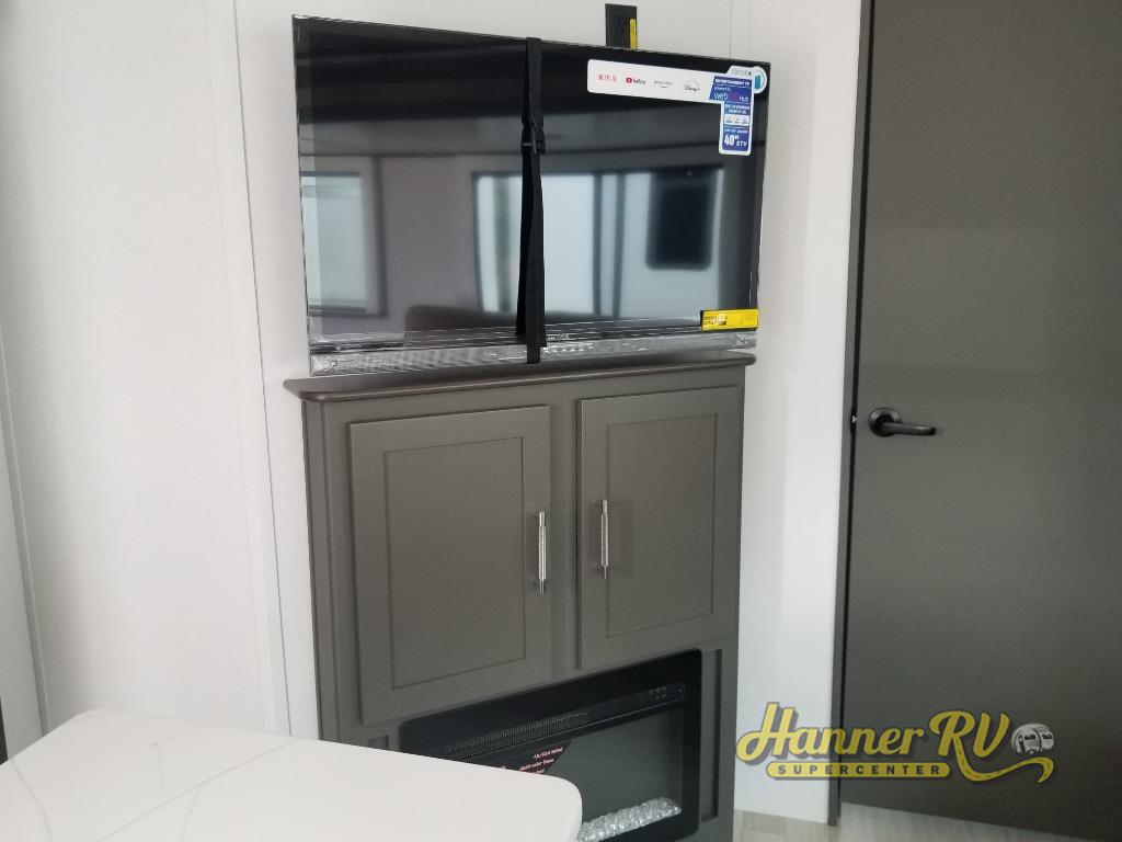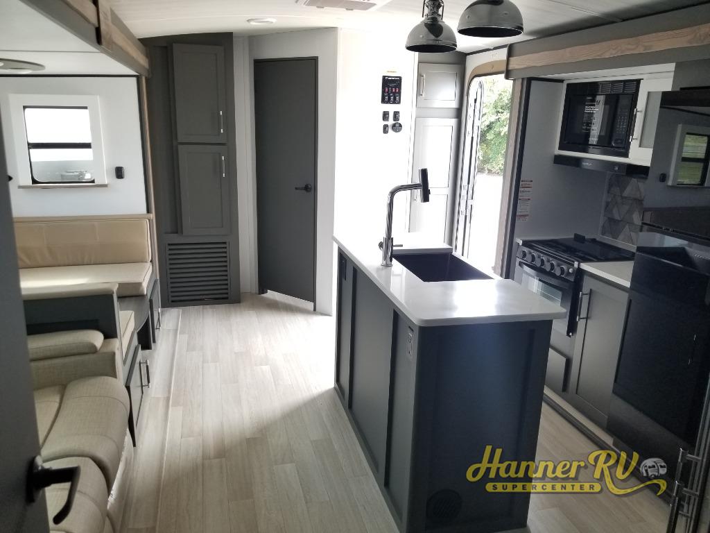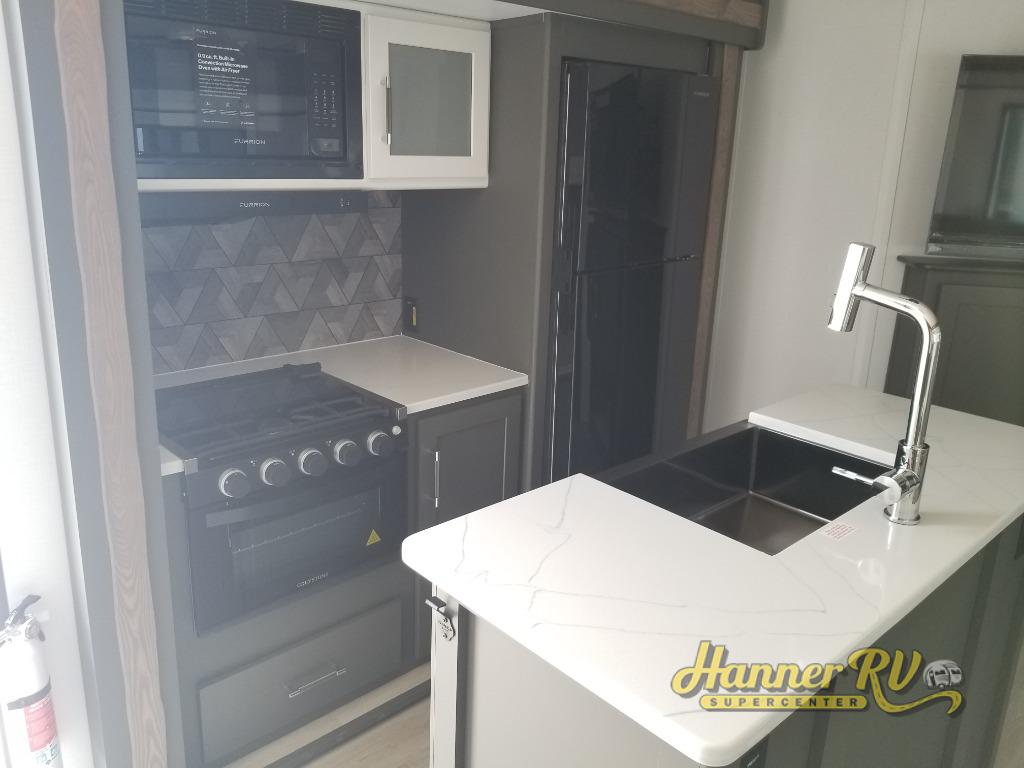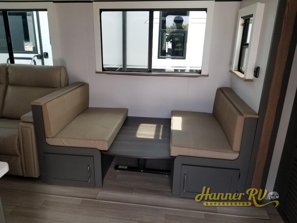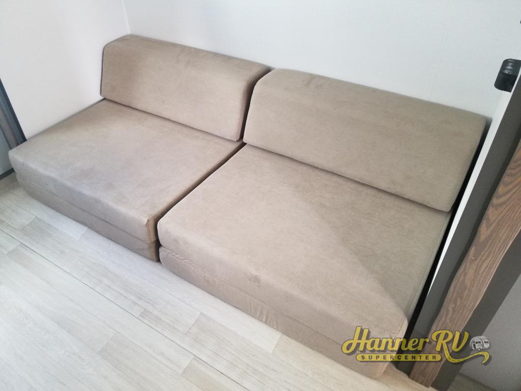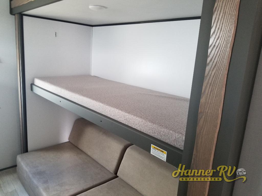 This travel trailer is one the whole gang will love! There is a rear private bunkhouse suite for your guests or the kids, plus a front master bedroom for you. The bunkhouse includes a tri-fold sofa with a flip-up bunk across from a second bunk, plus there is a half bath with its own exterior entry door! The full walk-through bath leads into the front bedroom where you'll find a queen bed and dual wardrobes to keep your room tidy. Dual opposing slides in the combined living area and kitchen will provide ample space to move about, and you will find comfy seating on the tri-fold sofa and Do-More dinette table. There is even a fireplace and an entertainment center!