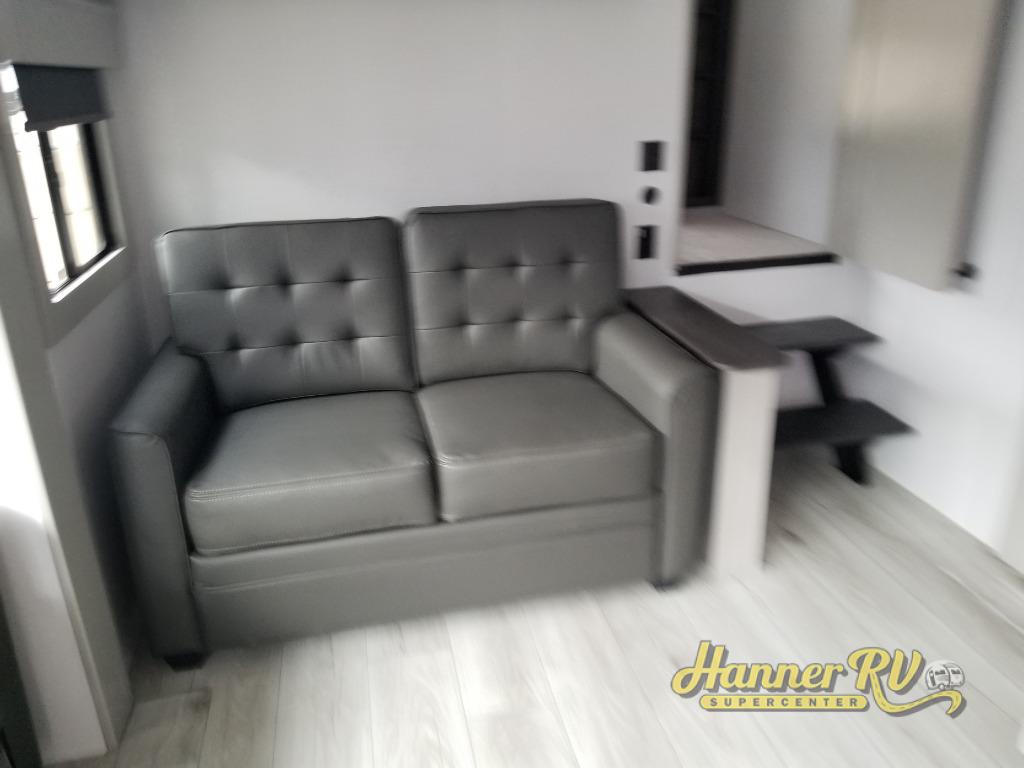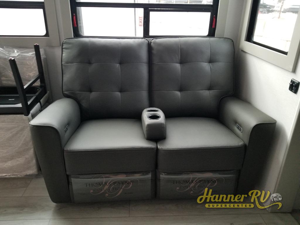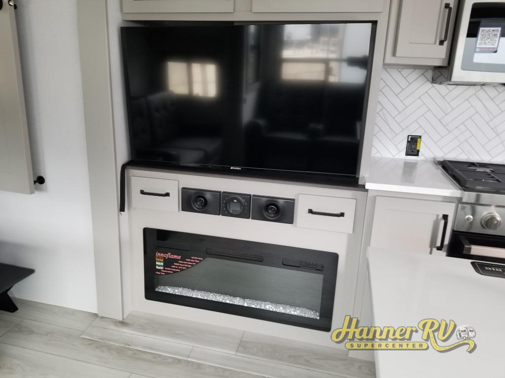 You will be living in true luxury with this Montana High Country fifth wheel! First of all, you'll have your own master suite up at the front with a king bed slide out. The bedroom also has great storage space for your clothes with the two dressers and two wardrobes. Second, there is a great sleeping area in the back for the extra travelers you have with you. The RV queen-size bunks allow four adults to sleep comfortably each night in this area, and there is even a hide-a-bed sofa next to the bunks for yet another set of sleepy campers. The power theater seating sits directly across from the fireplace and 50" LED TV, and the kitchen island has a countertop extension for even more prep space in the kitchen.